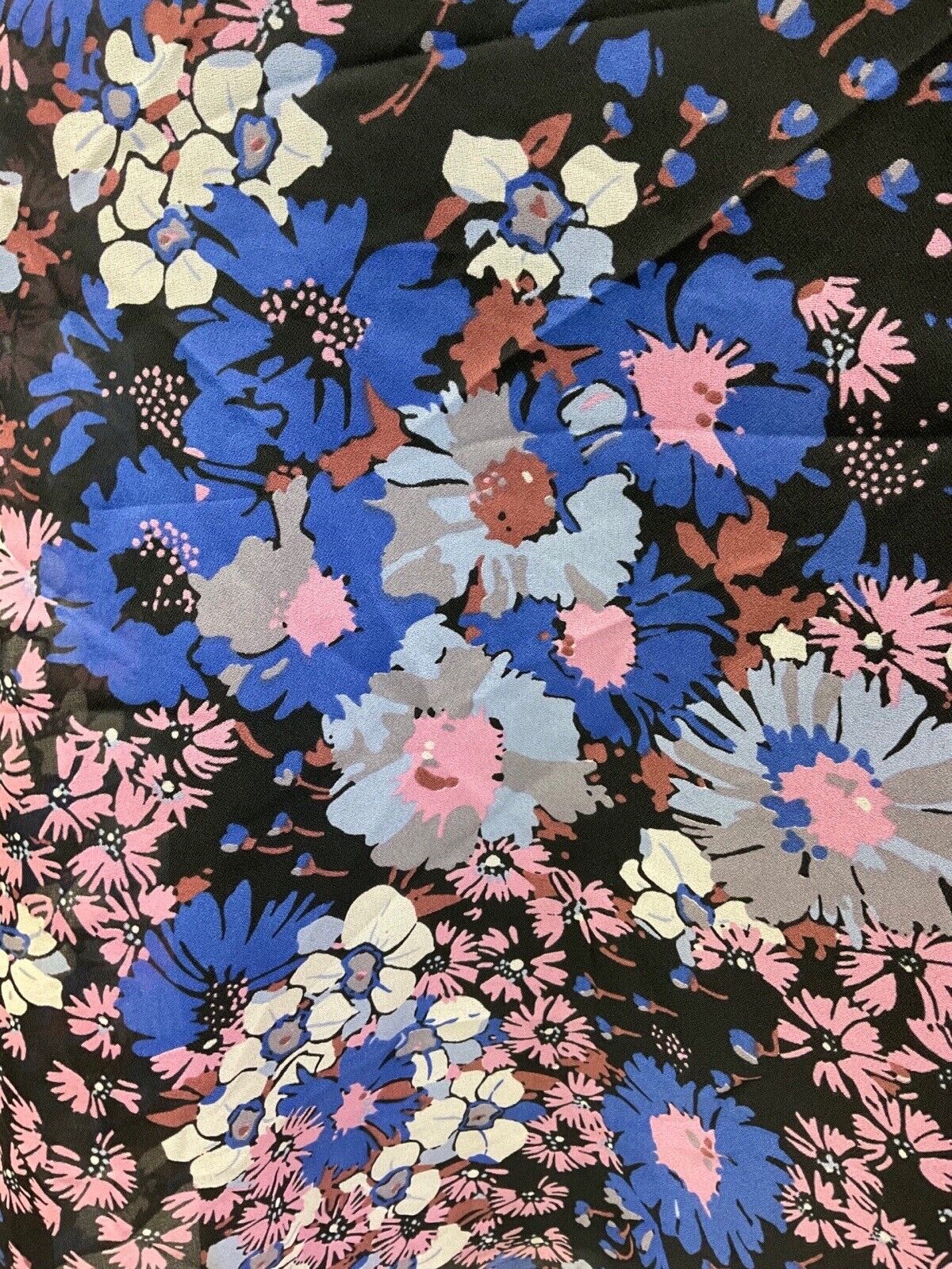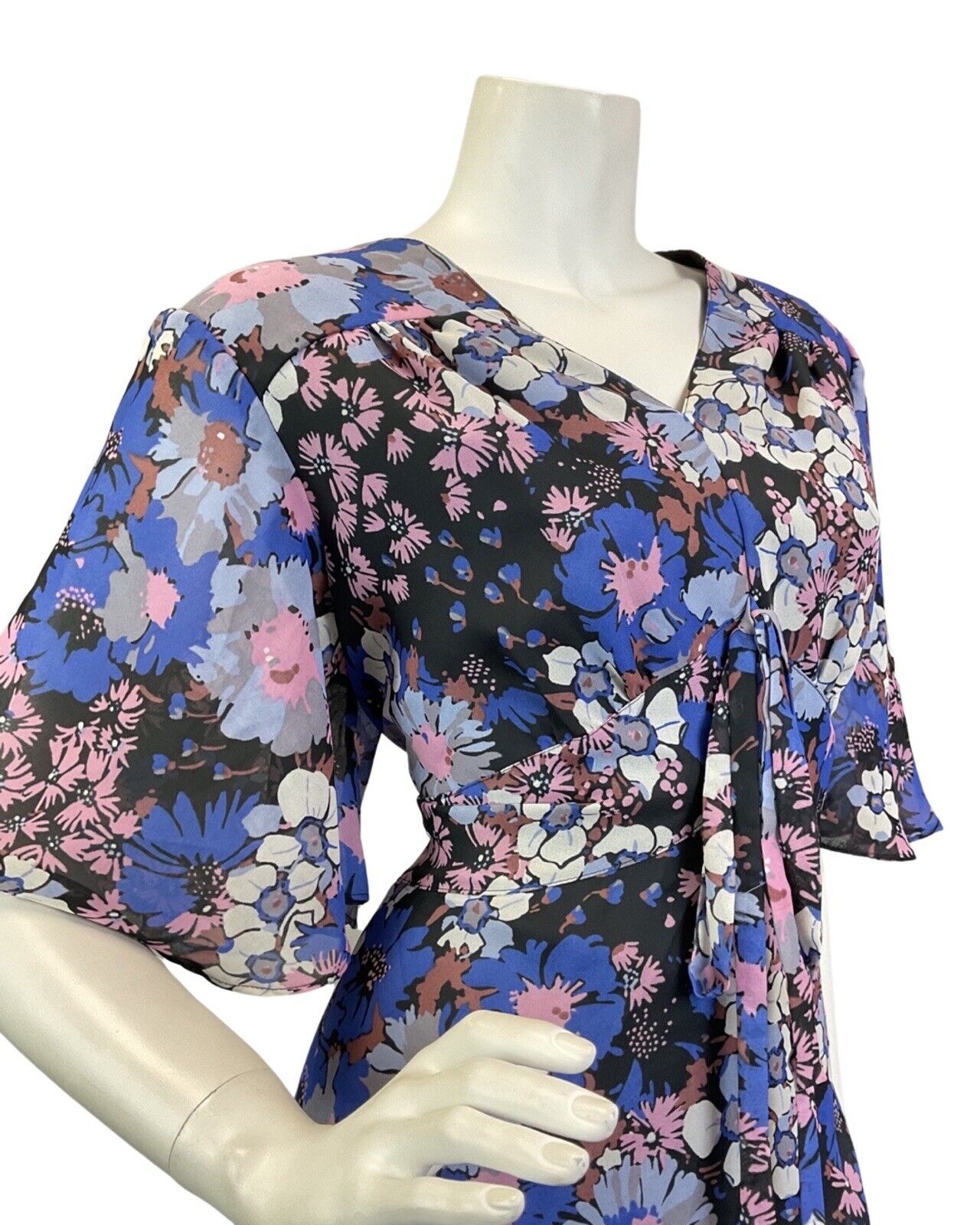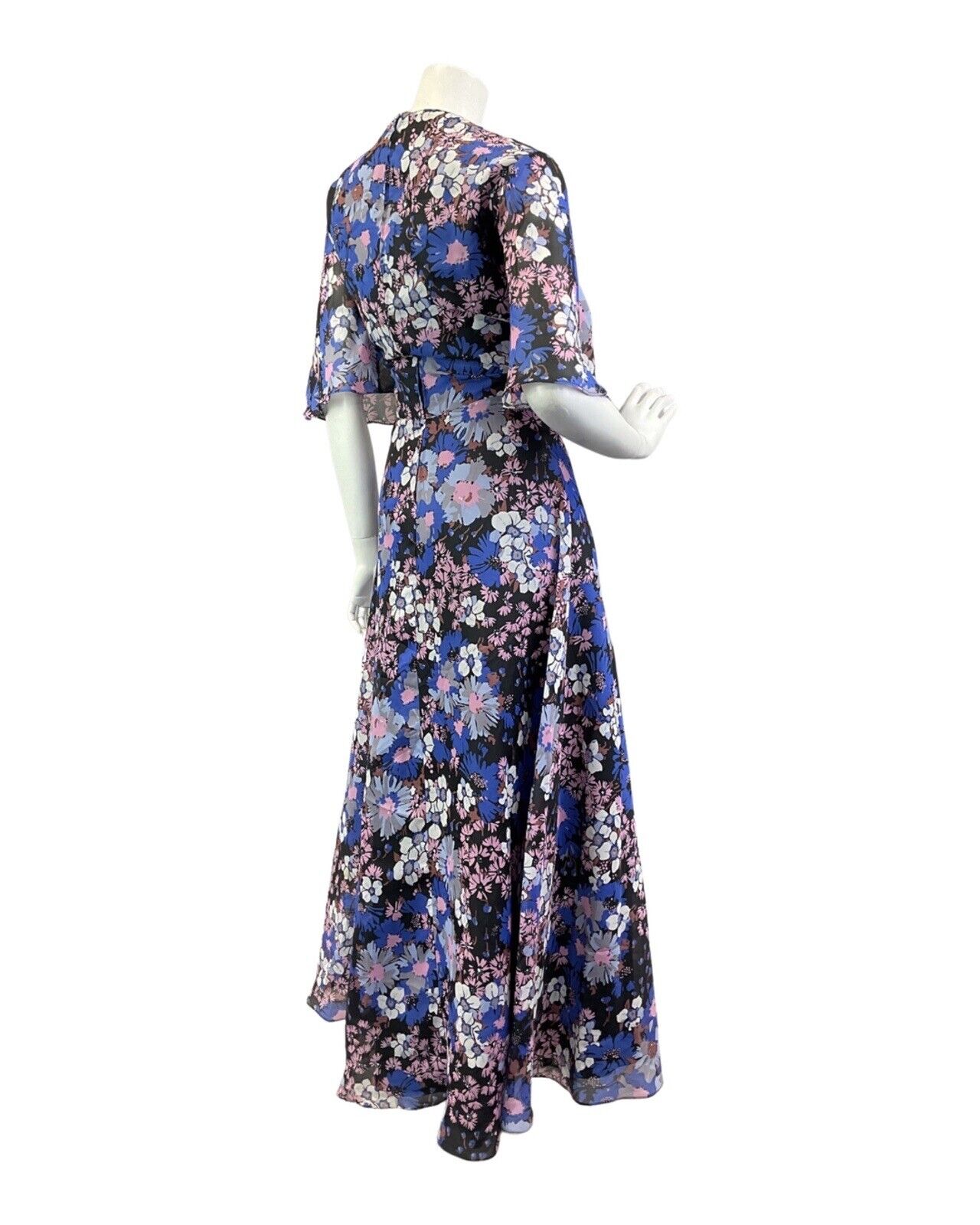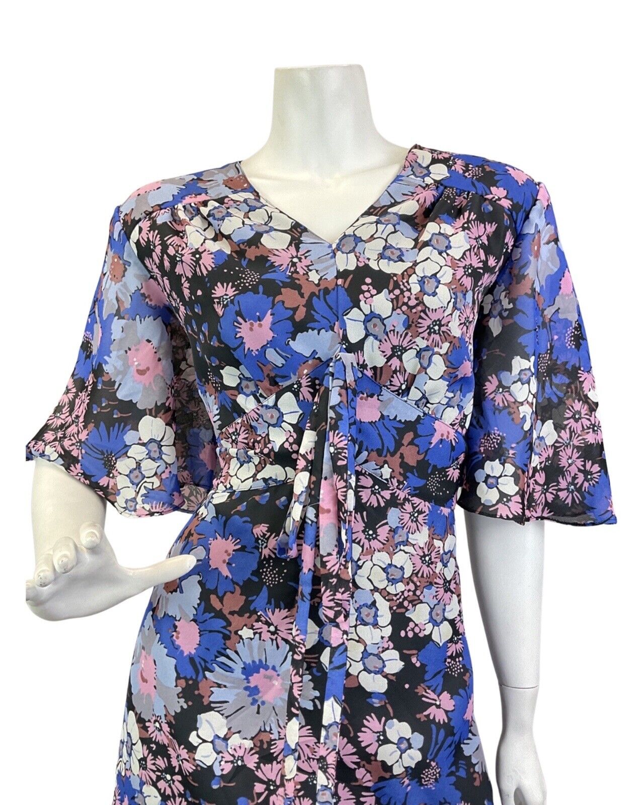 VINTAGE 60s 70s BLUE PINK BLACK FLORAL CAPE SLEEVE SUMMER MAXI DRESS 16 18