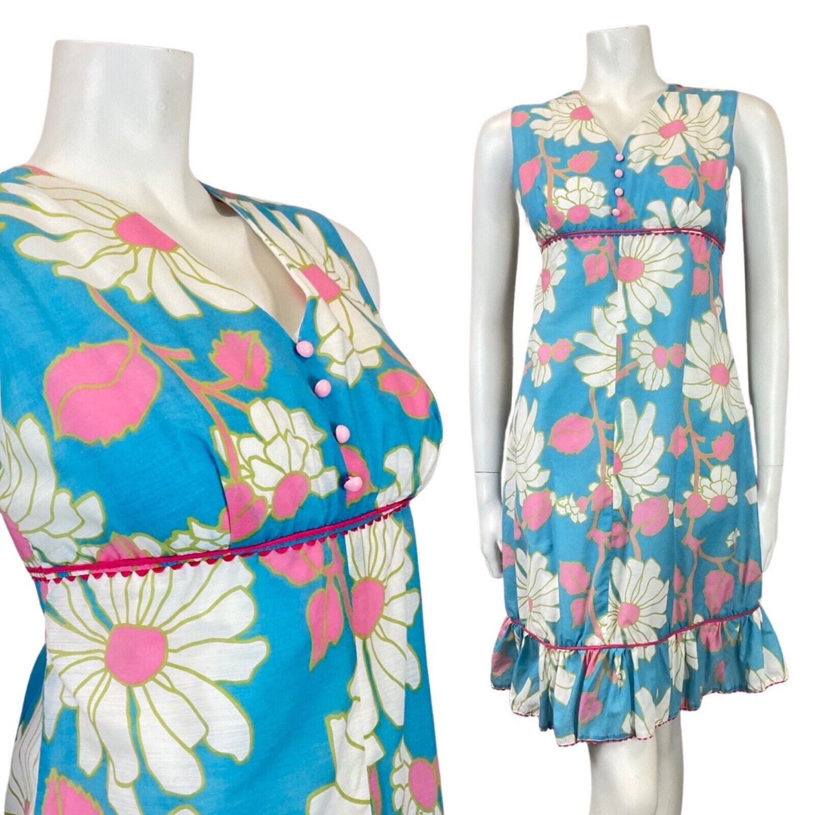VINTAGE 60s 70s BLUE PINK WHITE DAISY FLOWER EMPIRE LINE MOD DRESS 10 12