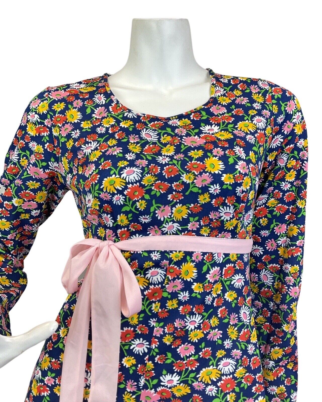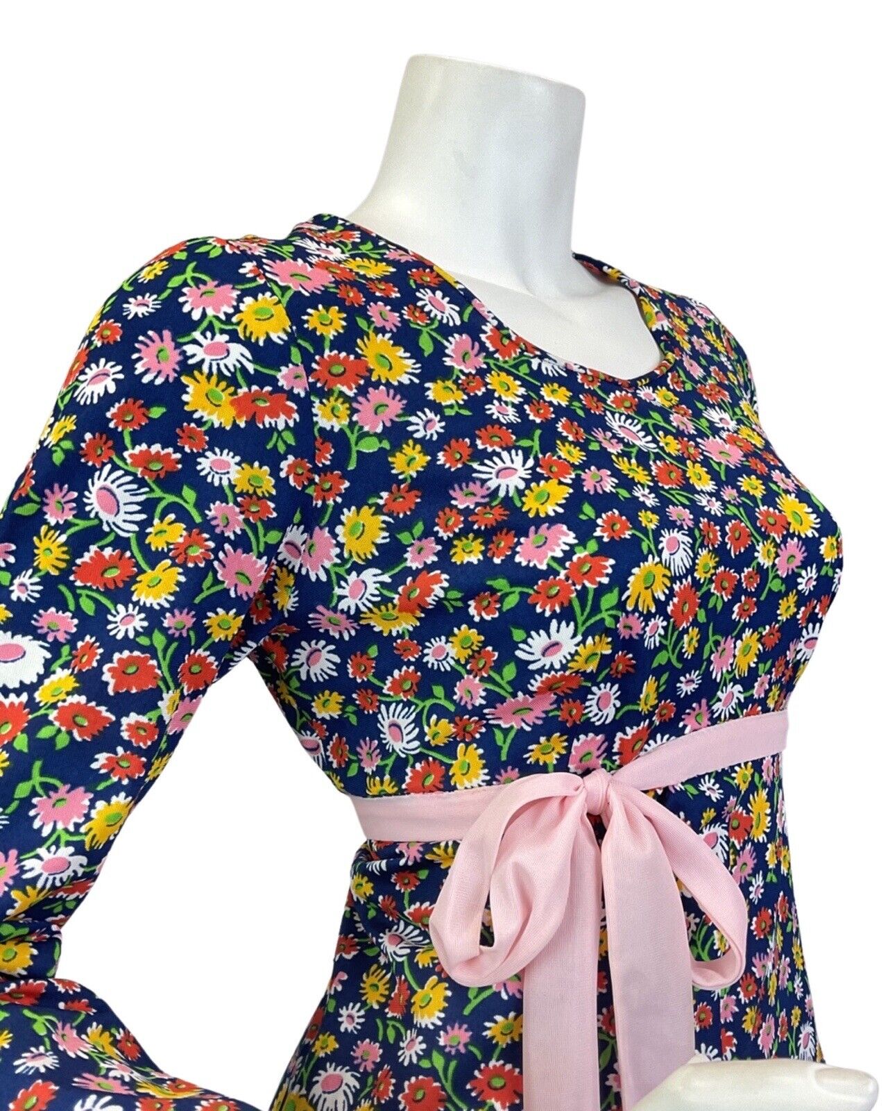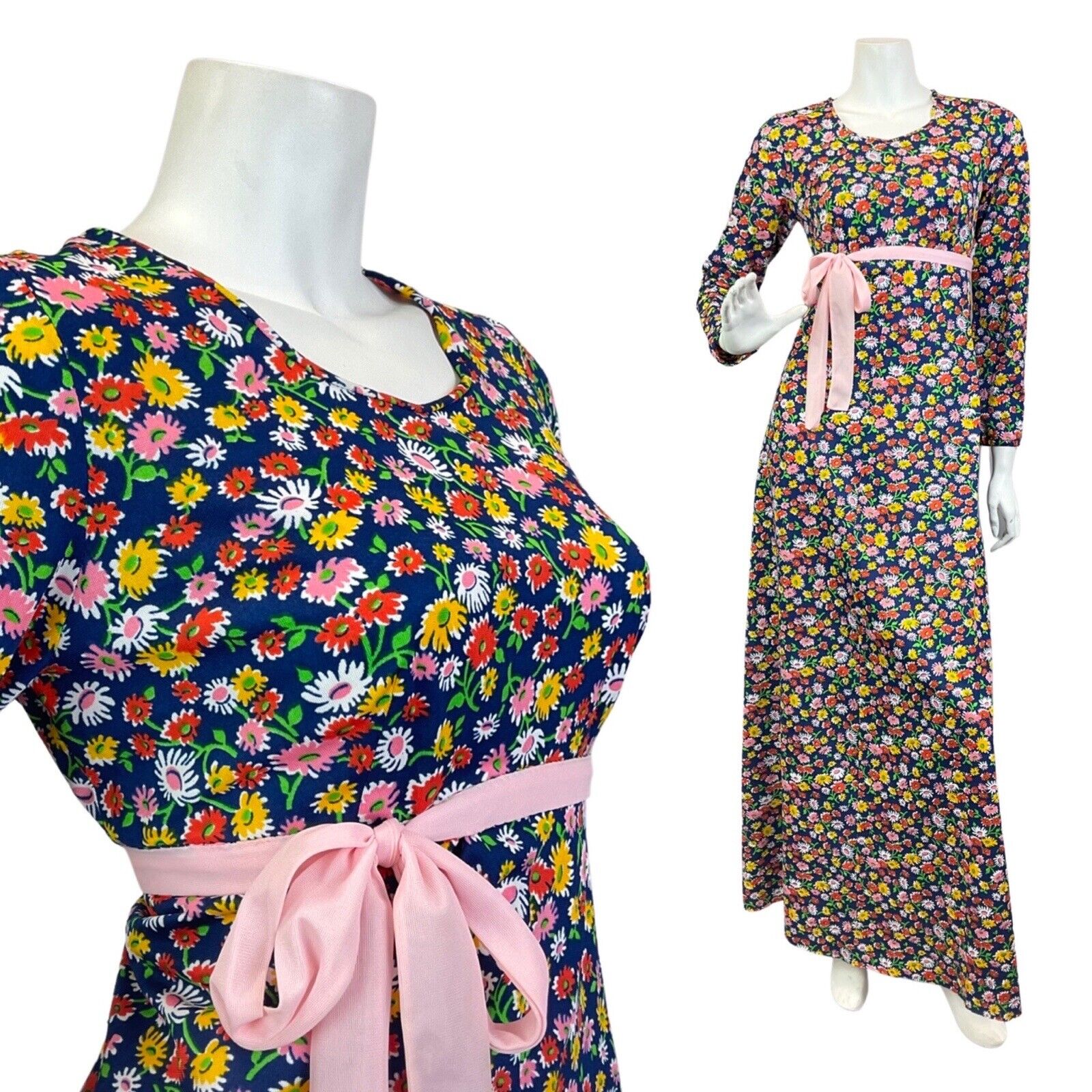 VINTAGE 60s 70s BLUE PINK YELLOW DAISY FLOWER EMPIRE MOD MAXI DRESS 8 10