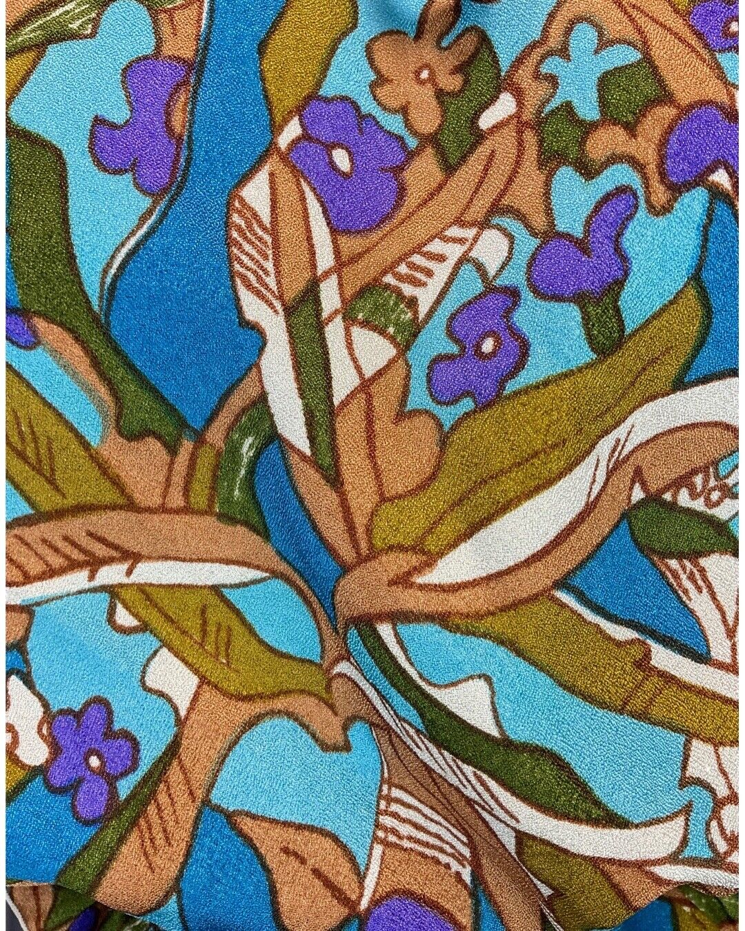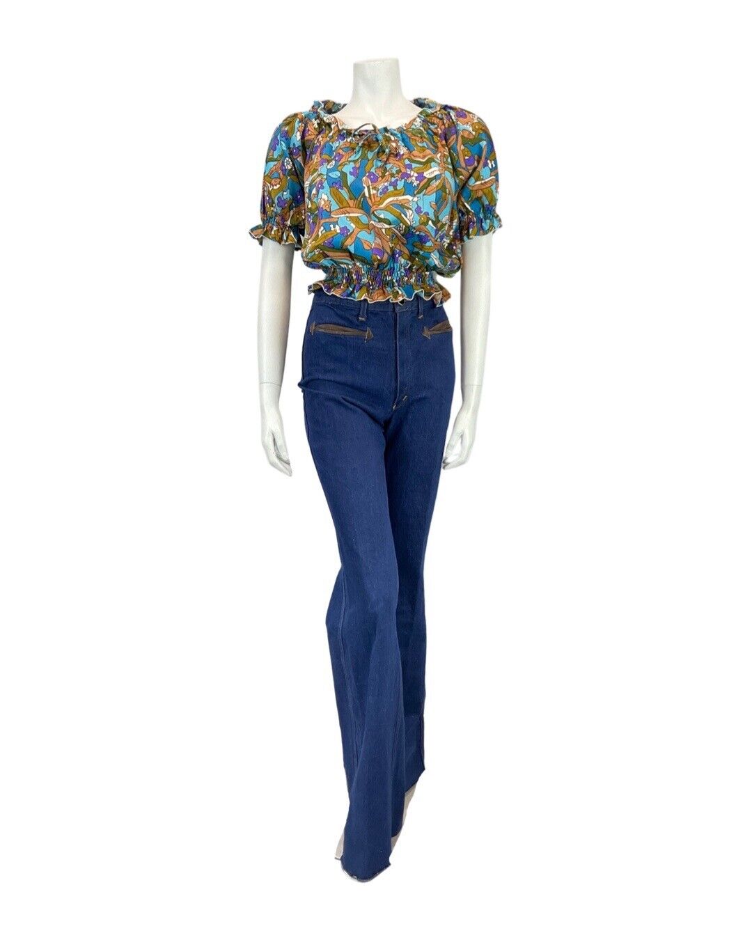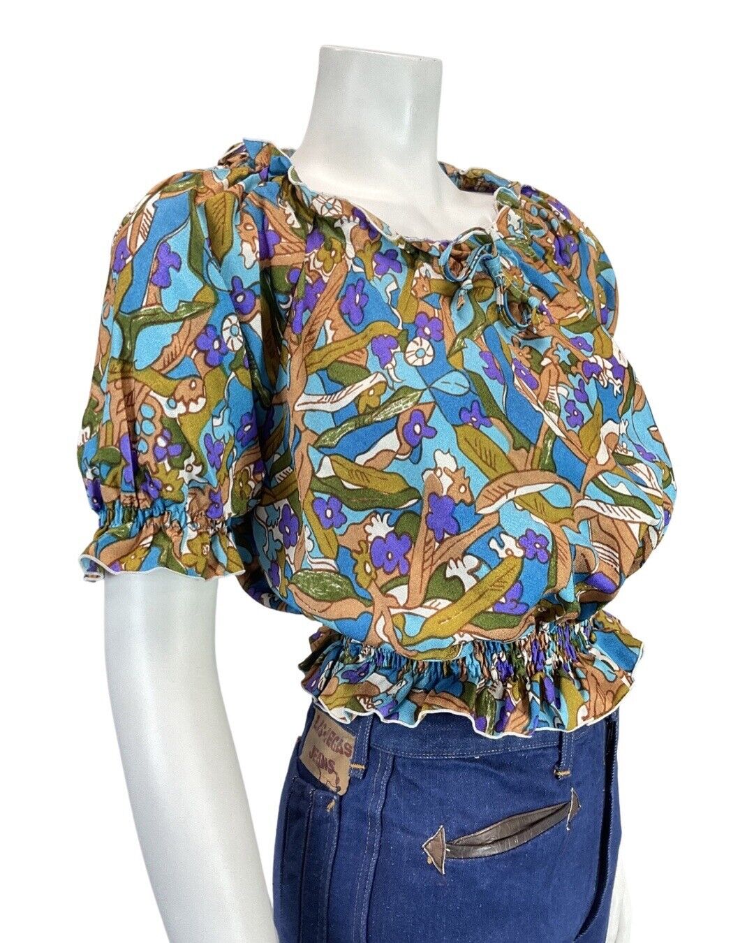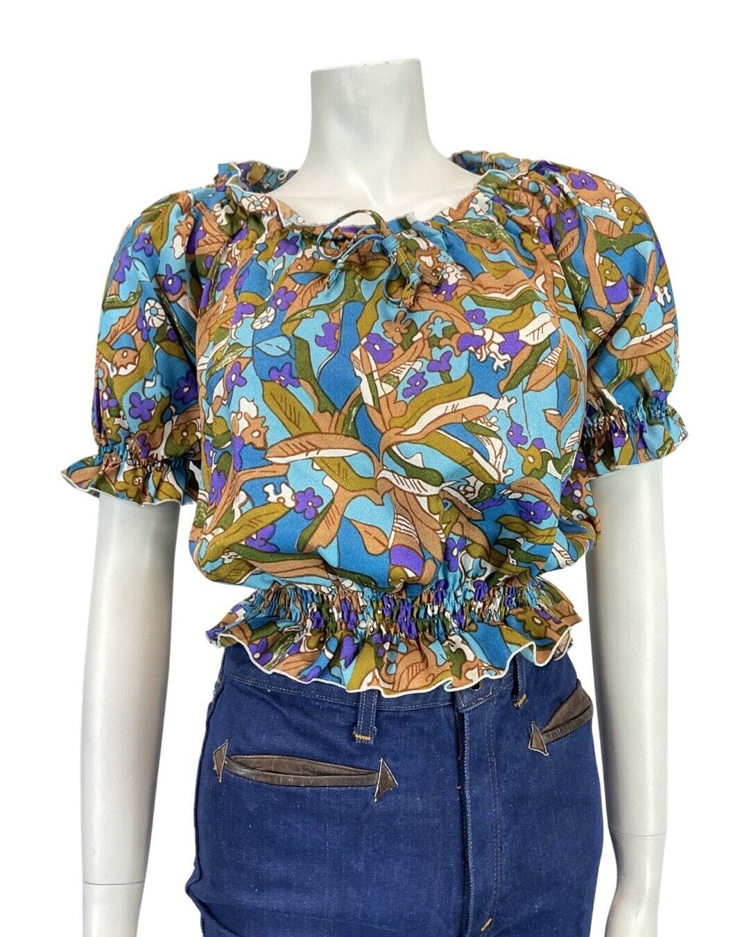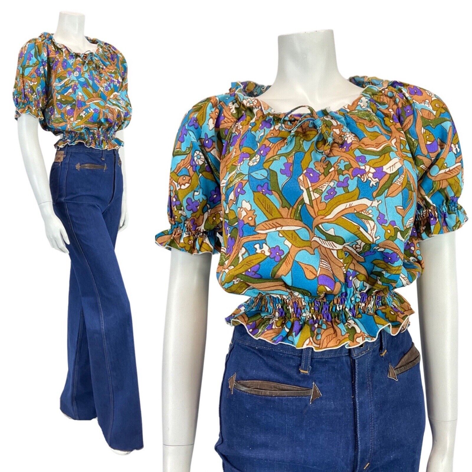 VINTAGE 60s 70s BLUE PURPLE BROWN PSYCEDELIC FLORAL MOD CROPPED BLOUSE TOP 12