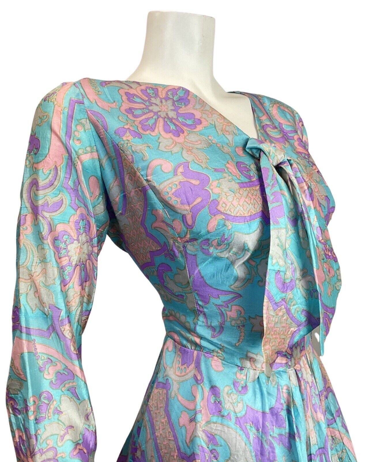VINTAGE 60s 70s BLUE PURPLE GREY PSYCHEDELIC FLORAL SILK BOW SWING DRESS 12 14