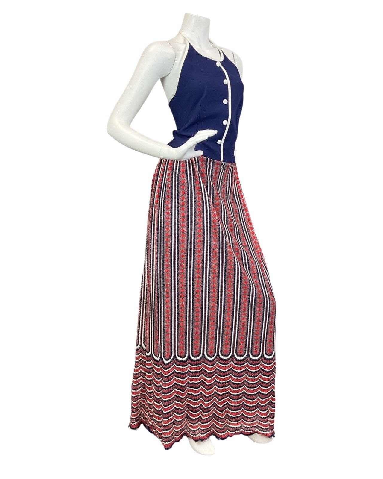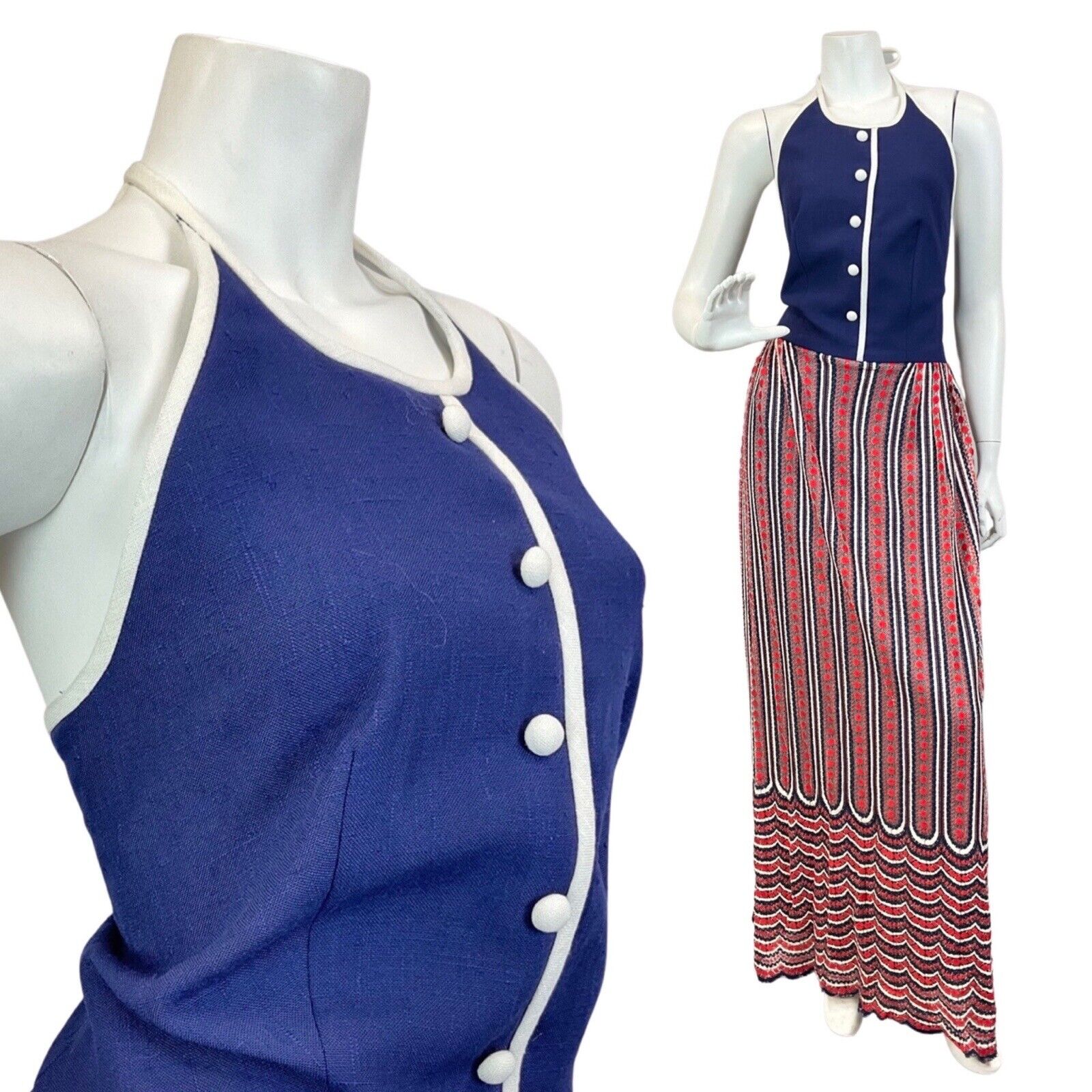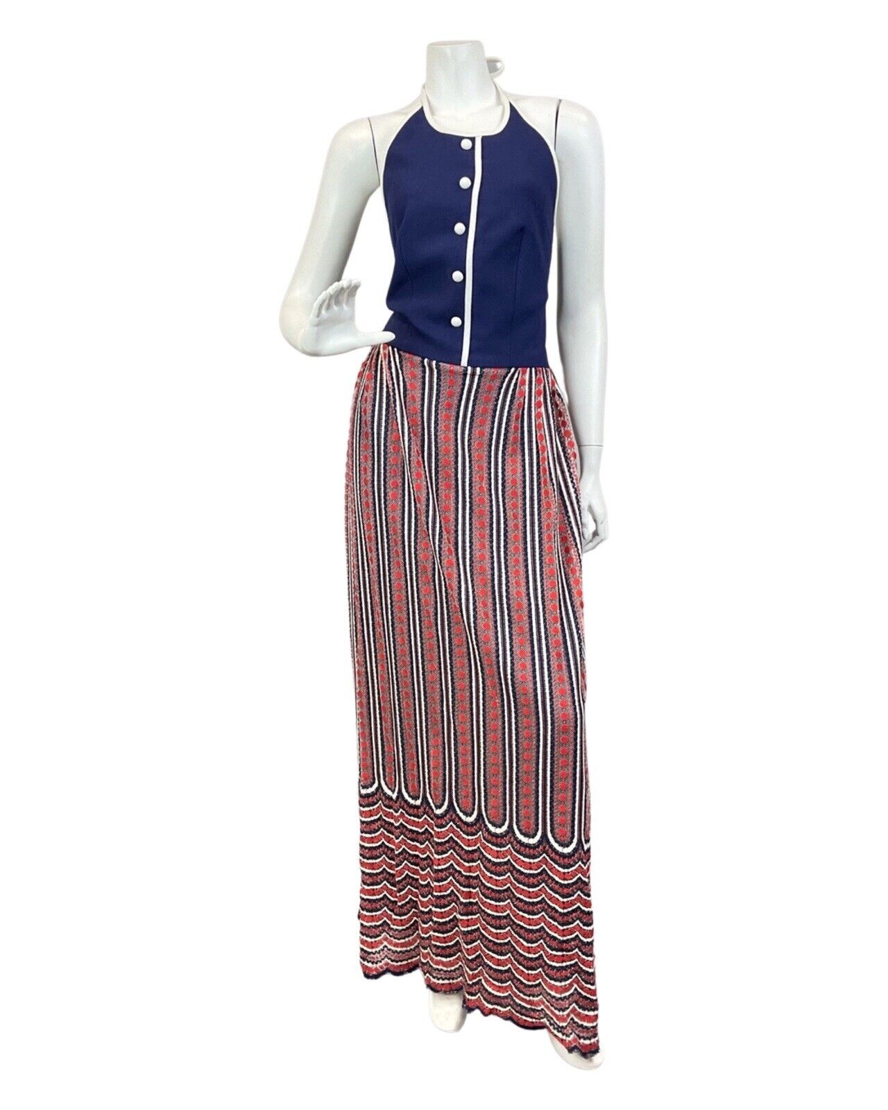 VINTAGE 60s 70s BLUE RED WHITE STRIPED DOTTY KNITTED MOD HALTER MAXI DRESS 8 10