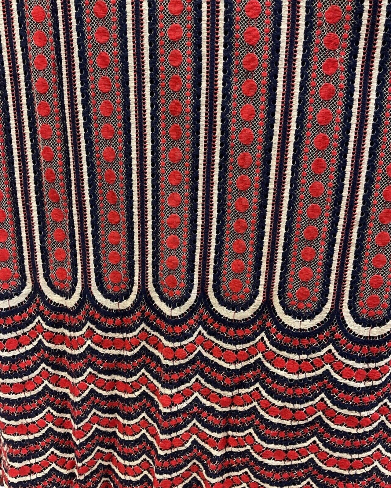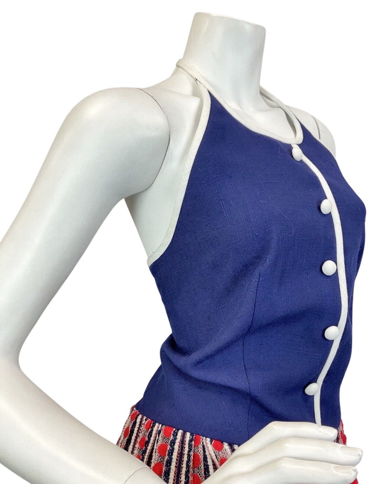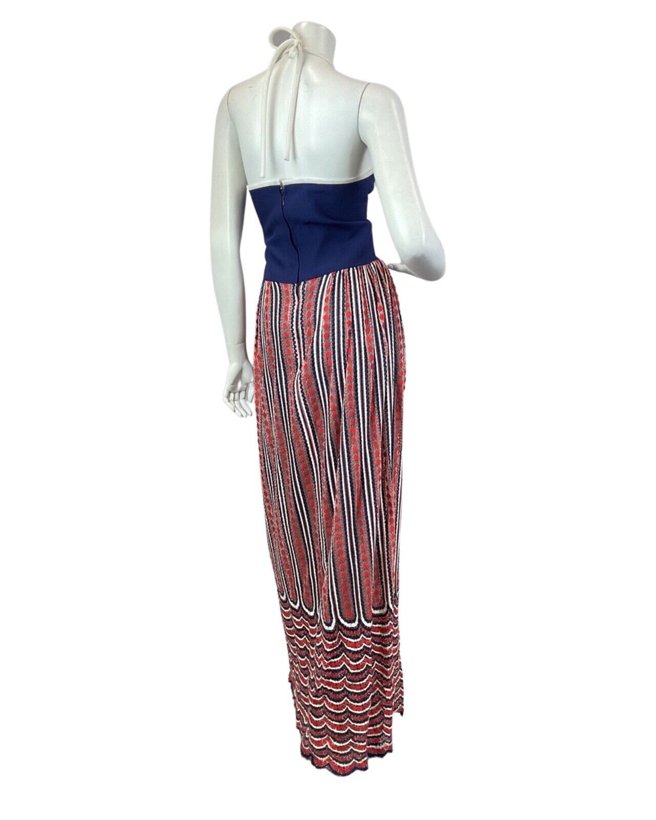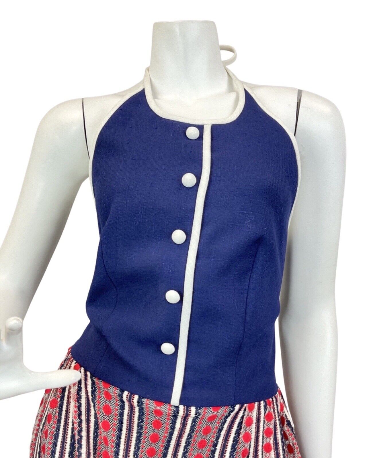 VINTAGE 60s 70s BLUE RED WHITE STRIPED DOTTY KNITTED MOD HALTER MAXI DRESS 8 10