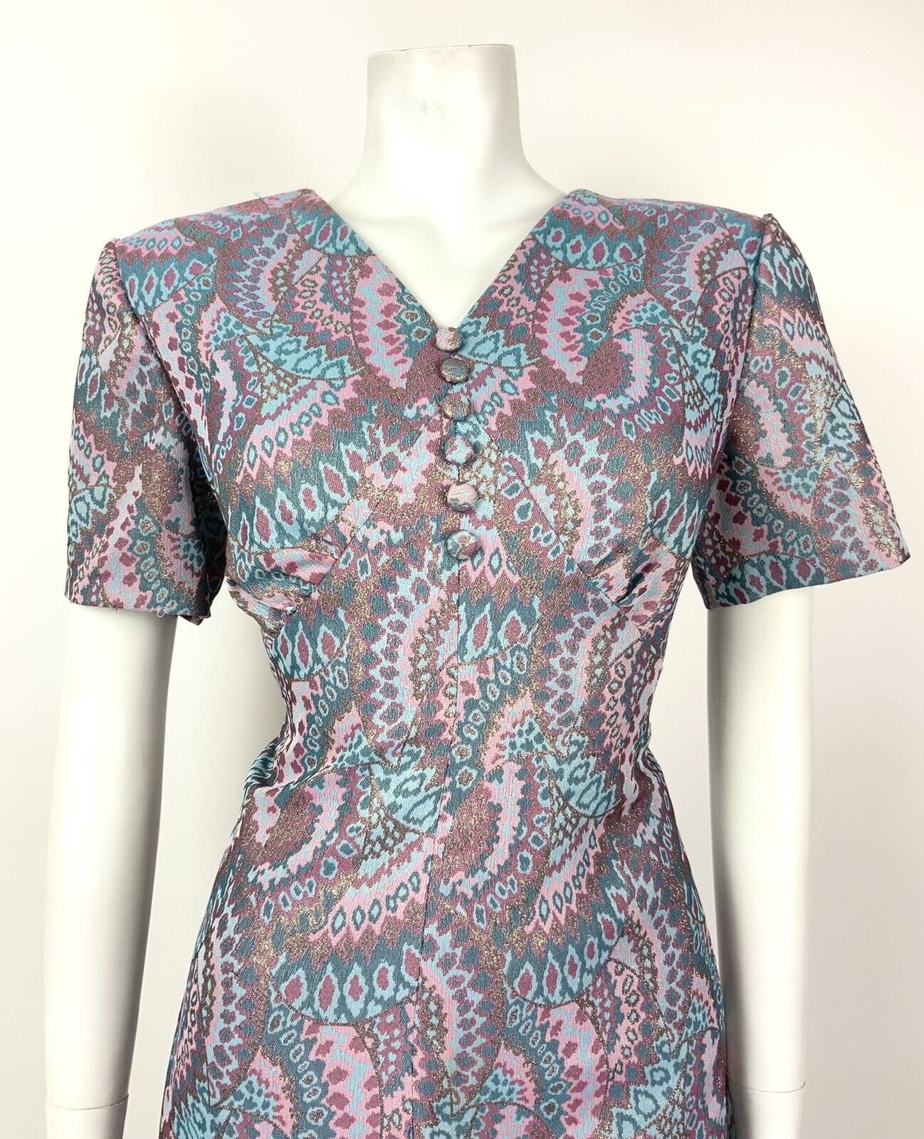 VINTAGE 60s 70s BLUE TURQUOISE PINK GOLD PSYCHEDELIC FLARED DRESS 12 14