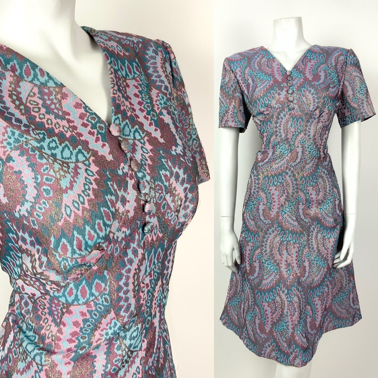 This is a lovely vintage fitted dress made from a mid-weight woven synthetic fabric with a fitted blue lining throughout. This dress would best fit: 12-14 please check your measurements against the ones provided below, Bust: 39" Waist: 33" Hips: 41" Length: 40" PLEASE NOTE: This garment has been measured flat and doubled for bust (armpit to armpit), waist and hip measurements, we measure the length down the back of the dress, measurements may differ slightly due to dress styles and fabrics. We ignore any existing size labels as vintage brands differed so much. Items shown on our mannequin may be clipped to fit. This garment is true vintage so please be aware there may be some signs of wear as expected from a garment of this age. We do not list stains to area likes linings that are hidden or things that can bearly be seen without close inspection. These can include pin holes, small marks, light piling. We hand pick our items to make sure they are in great condition and fully wearable and we reject anything of poor condition. The majority of our items are 40-70 years old. If you think we've missed something significant please get in touch, we are only human and we lose transaction fees on returns so we don't skip things on purpose. CHECK OUT OUR OTHER ITEMS, WE LIST EVERY WEEK! |