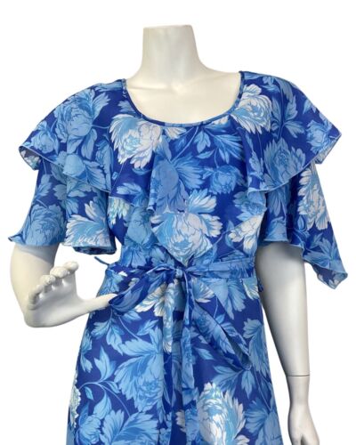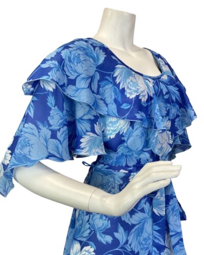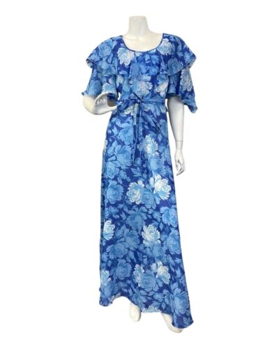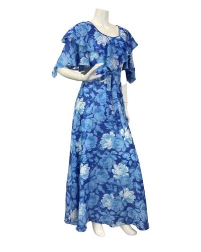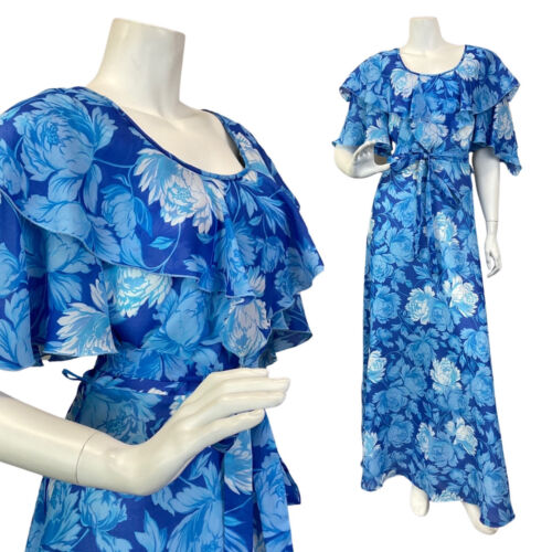VINTAGE 60s 70s BLUE WHITE FLORAL CAPE SLEEVE SHEER SUMMER MAXI DRESS 6