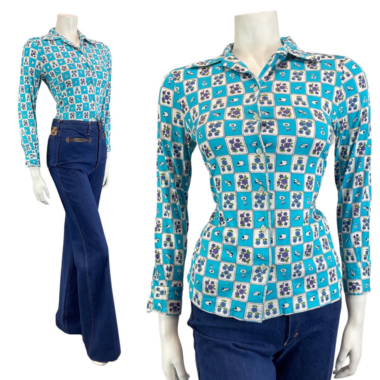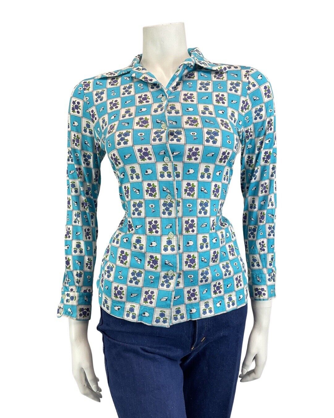 VINTAGE 60s 70s BLUE WHITE FLORAL GOLFING CHECKERBOARD FITTED BLOUSE SHIRT 8