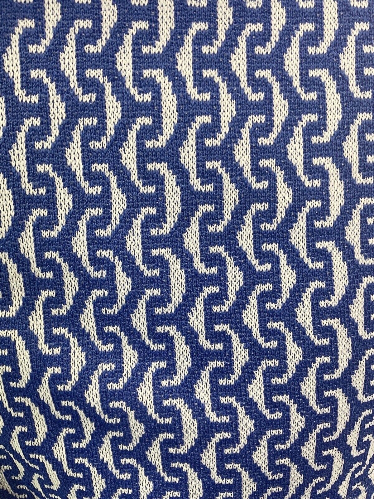Covering the fabric is a bold repeating geometric pattern in blue and white.