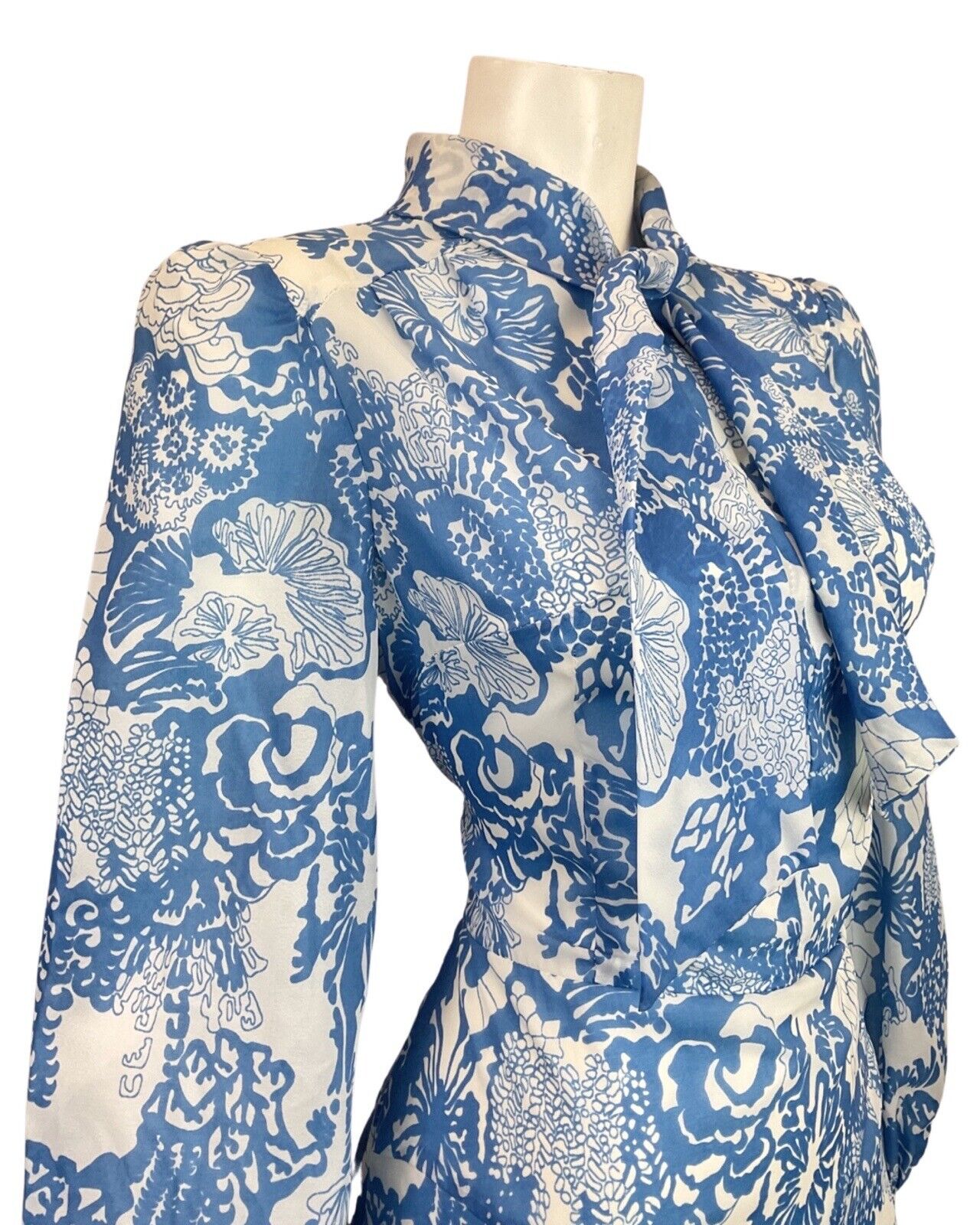 VINTAGE 60s 70s BLUE WHITE PSYCHEDELIC FLORAL PUSSYBOW SHEER SWING DRESS 12 14
