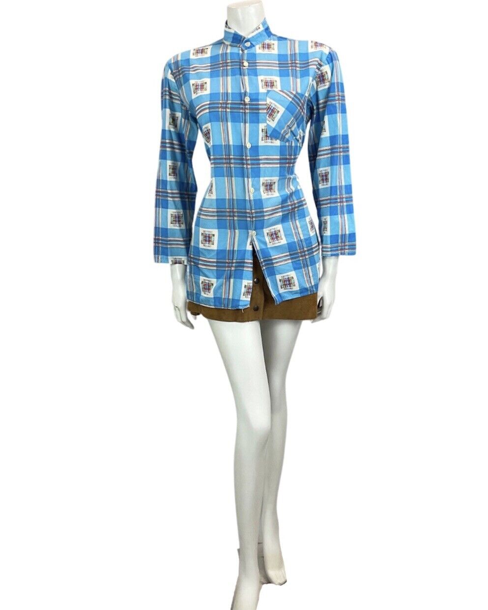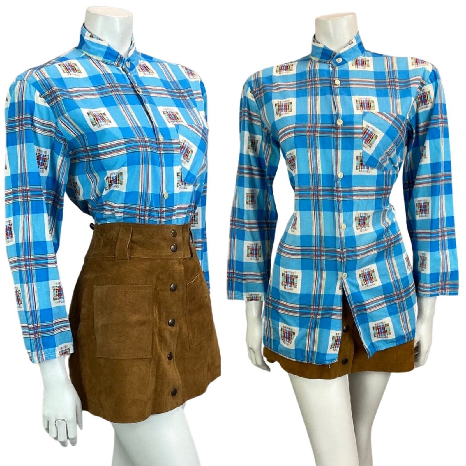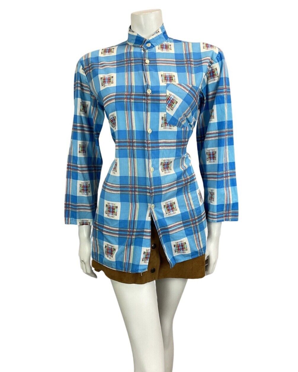 VINTAGE 60s 70s BLUE WHITE RED CHECKED PATTERNED COTTON BERMUDA COLLAR SHIRT 12