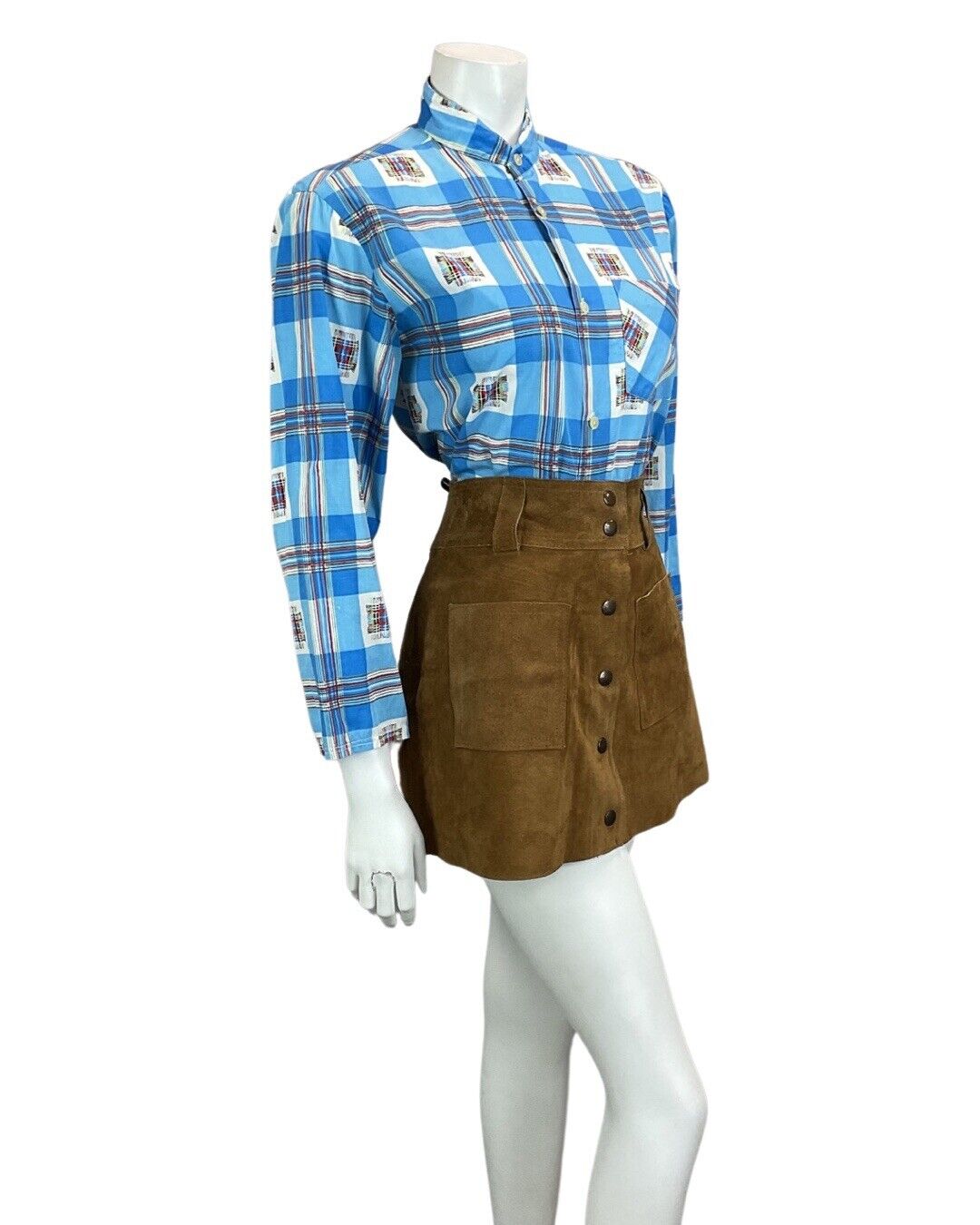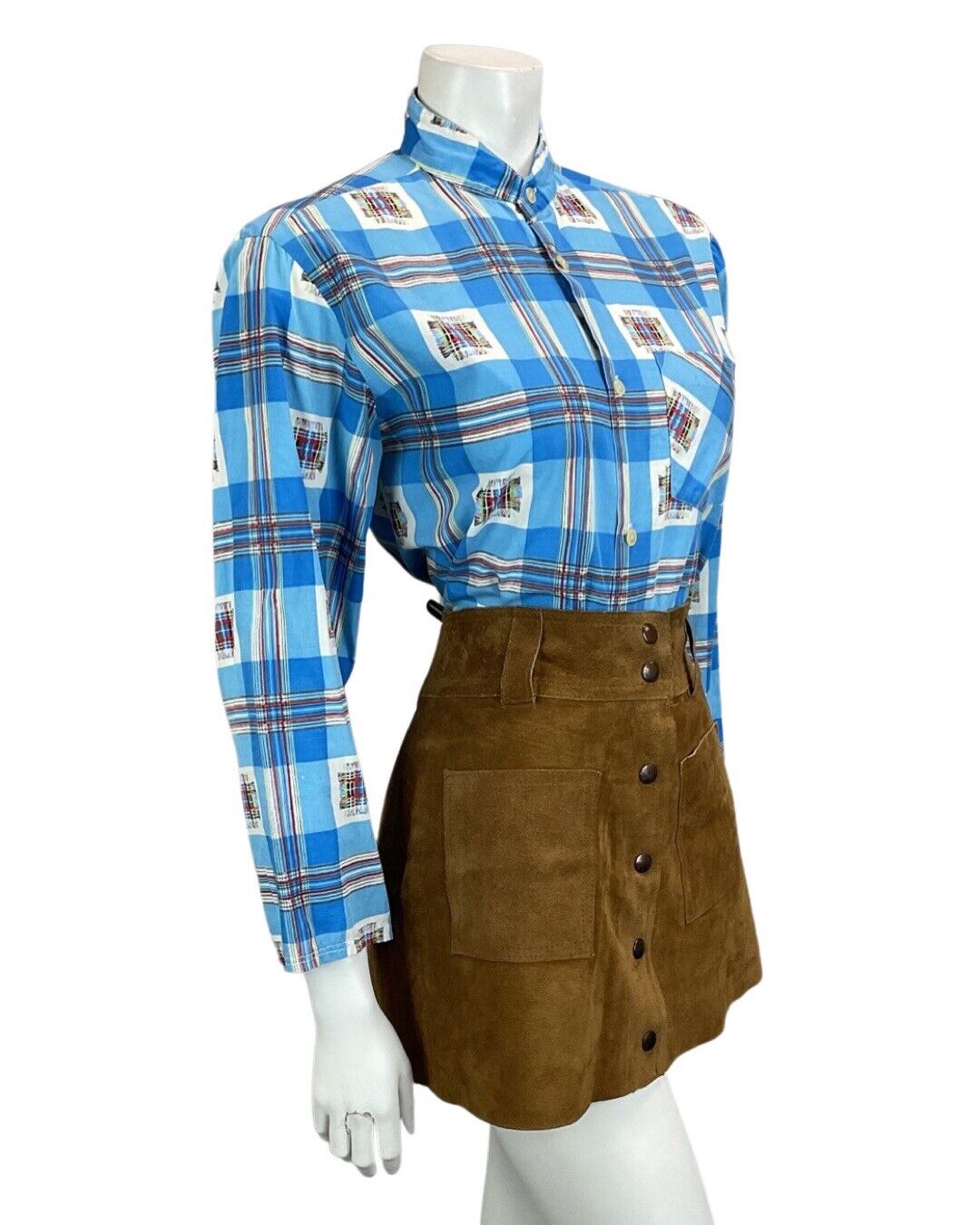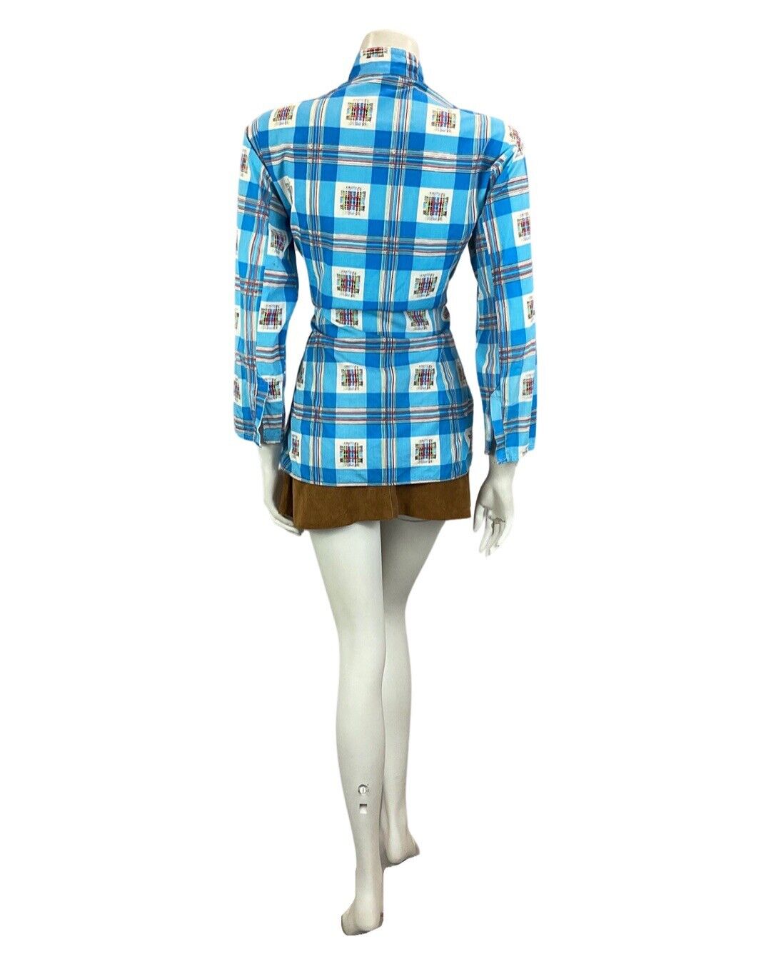 VINTAGE 60s 70s BLUE WHITE RED CHECKED PATTERNED COTTON BERMUDA COLLAR SHIRT 12