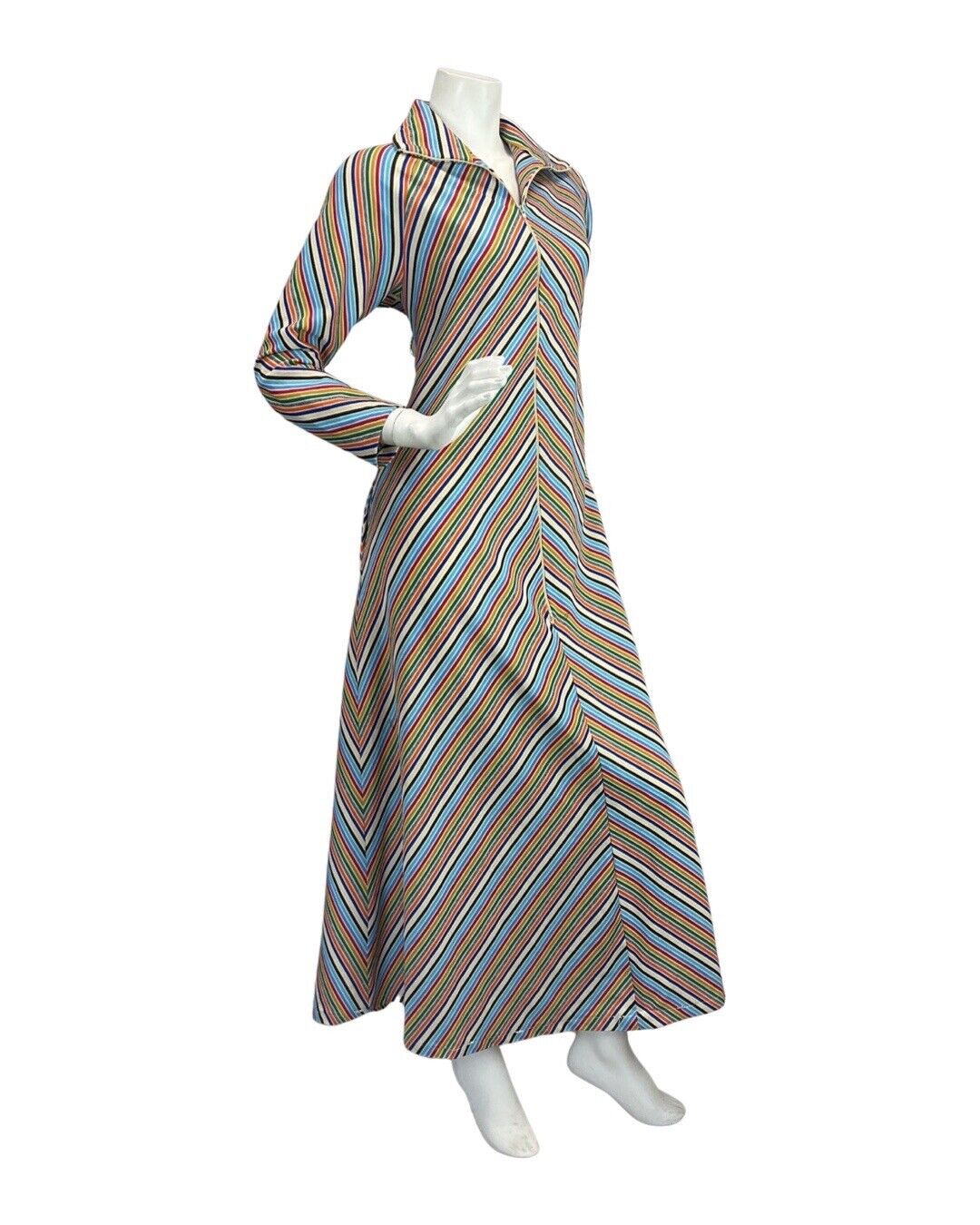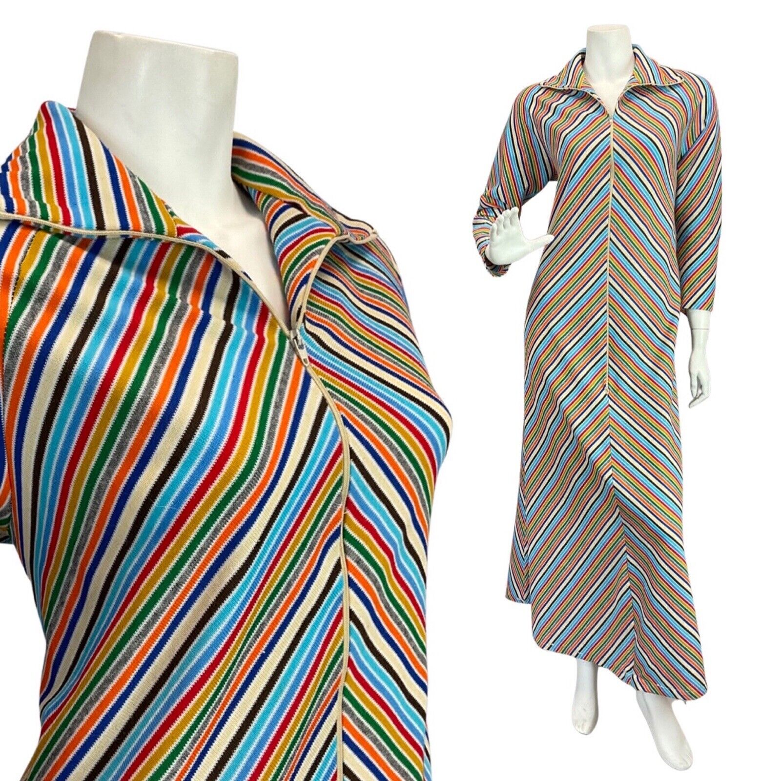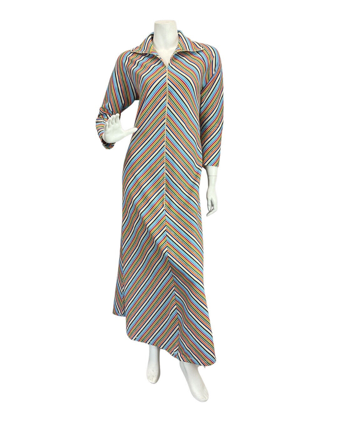 VINTAGE 70s BLUE WHITE RED GREEN STRIPED MOD ZIP-UP SHIRT MAXI DRESS 12 14