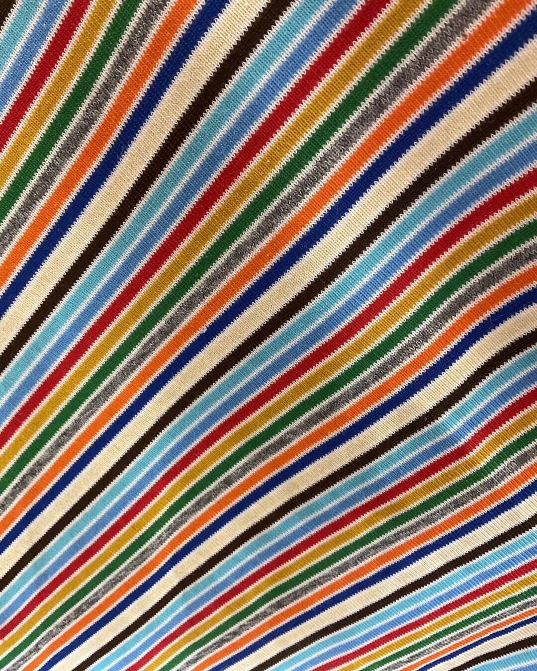 Covering the fabric is a bold striped pattern in white, red, green, yellow, and blue, that is knitted into the fabric.