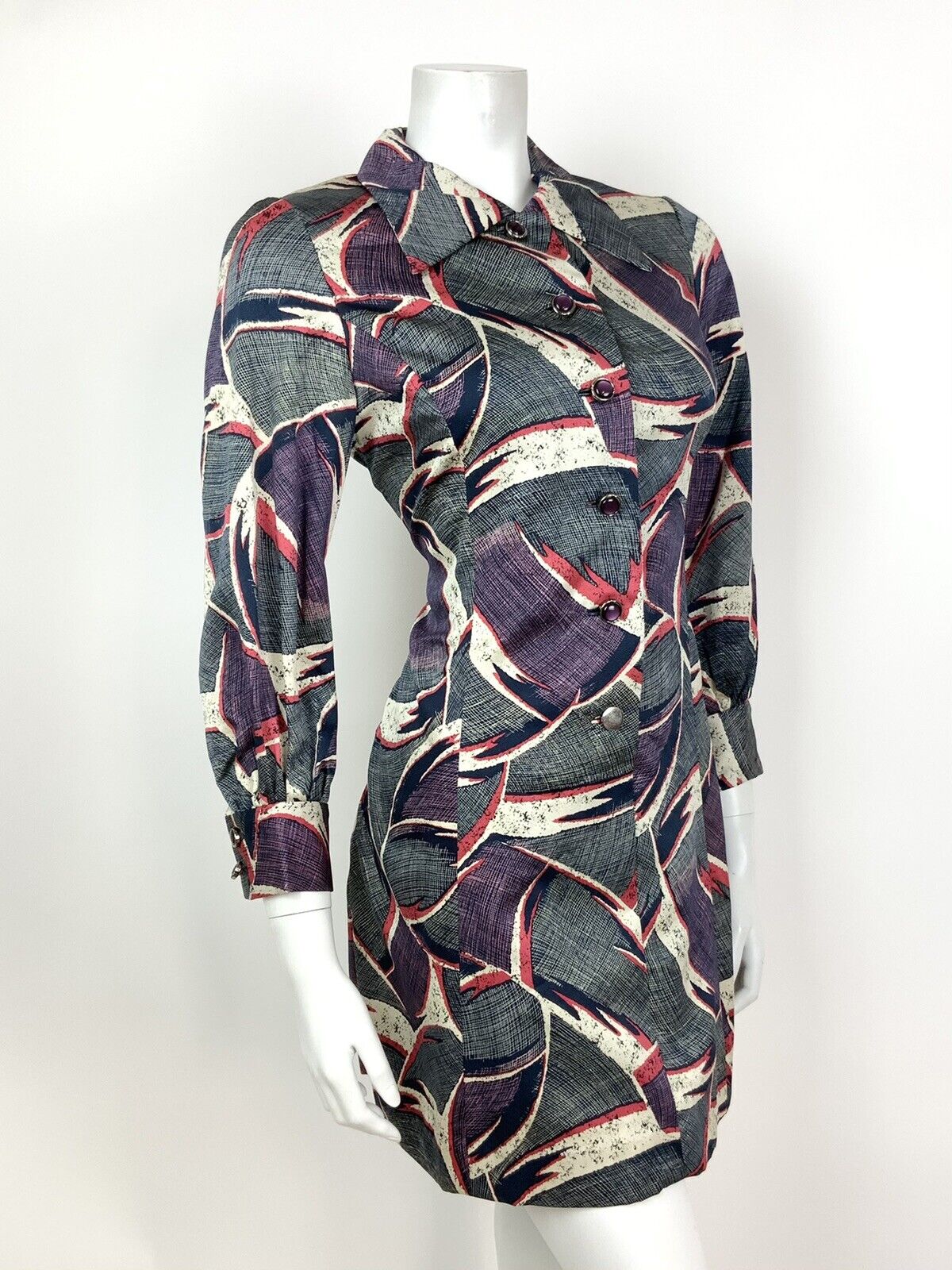 VINTAGE 60s 70s BLUE WHITE RED PINK ABSTRACT PSYCHEDELIC DAGGER SHIRT DRESS 12