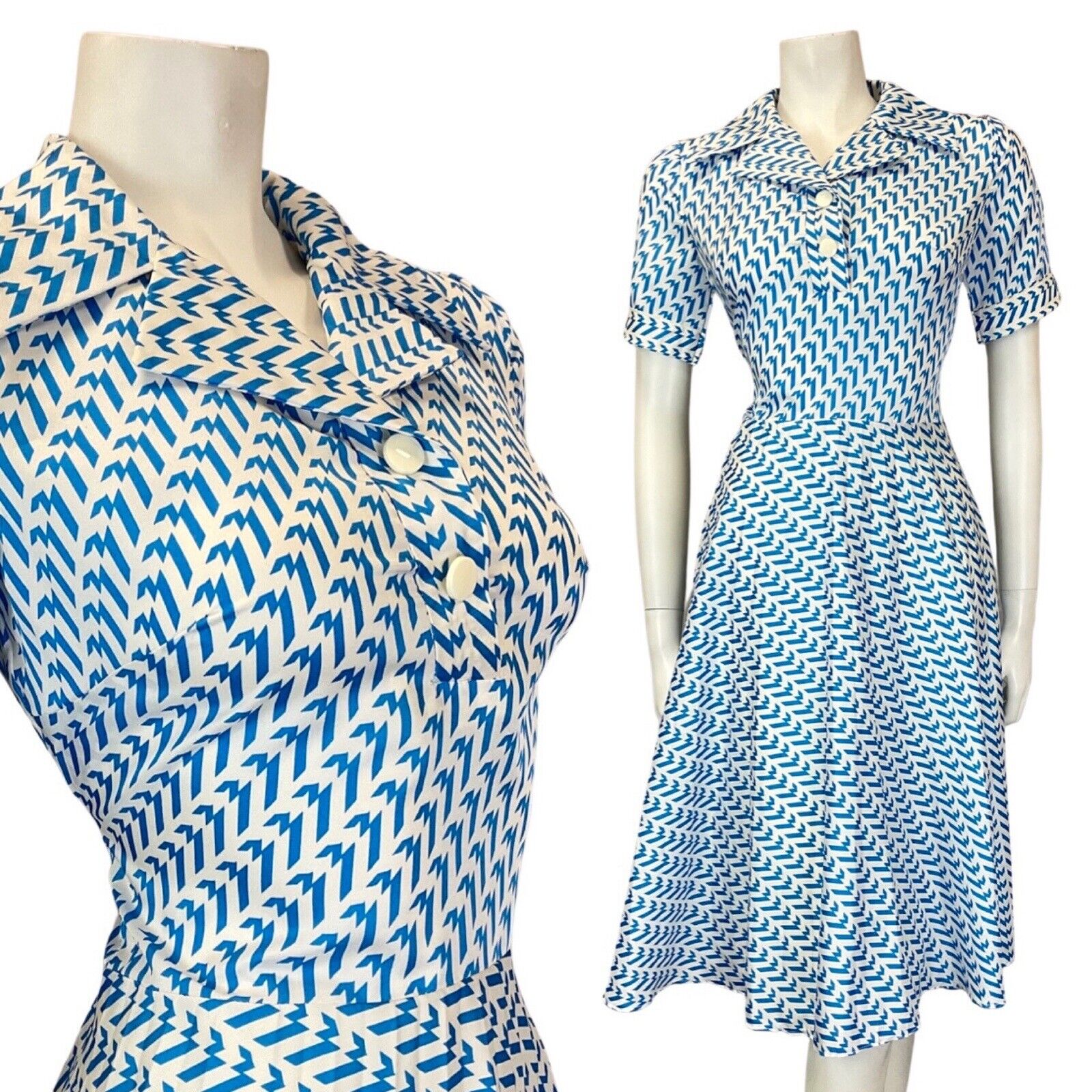 VINTAGE 60s 70s BLUE WHITE STRIPED ZIG-ZAG GEOMETRIC MOD SHIRT SWING DRESS 10