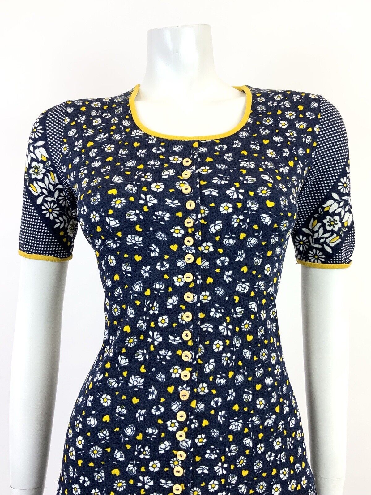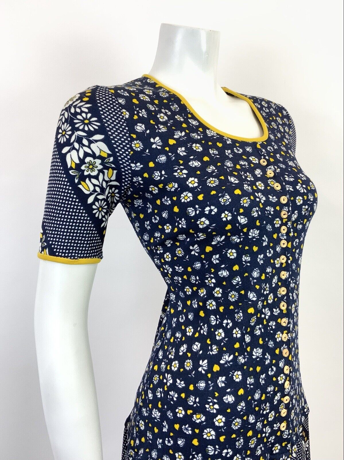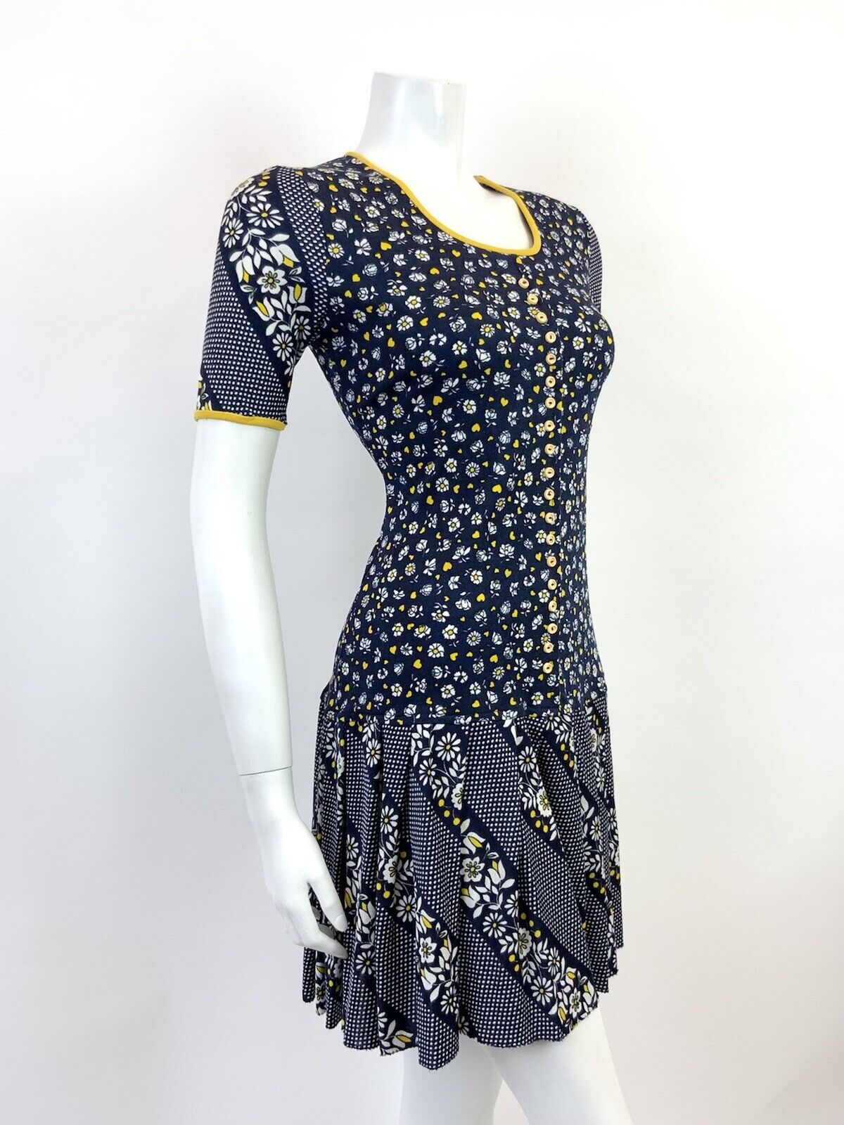 VINTAGE 60s 70s BLUE WHITE YELLOW FLORAL POLKA DOT LOVE HEART MOD DRESS 12