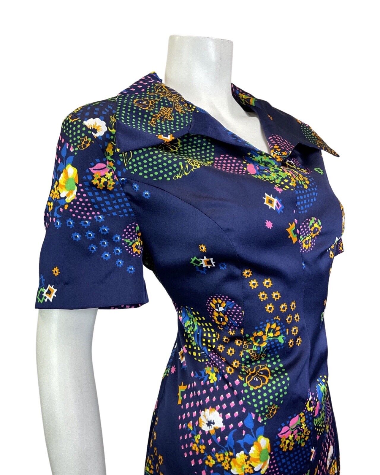 VINTAGE 60s 70s BLUE YELLOW PINK GEOMETRIC DOTTY FLORAL WING SHIRT DRESS 14 16