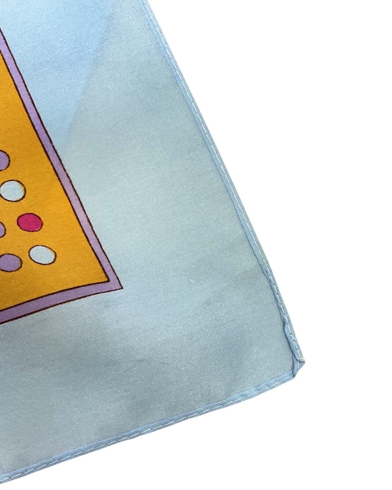 This is a gorgeous vintage square scarf made from a light-weight, baby blue polyester fabric with sewn-down edges.