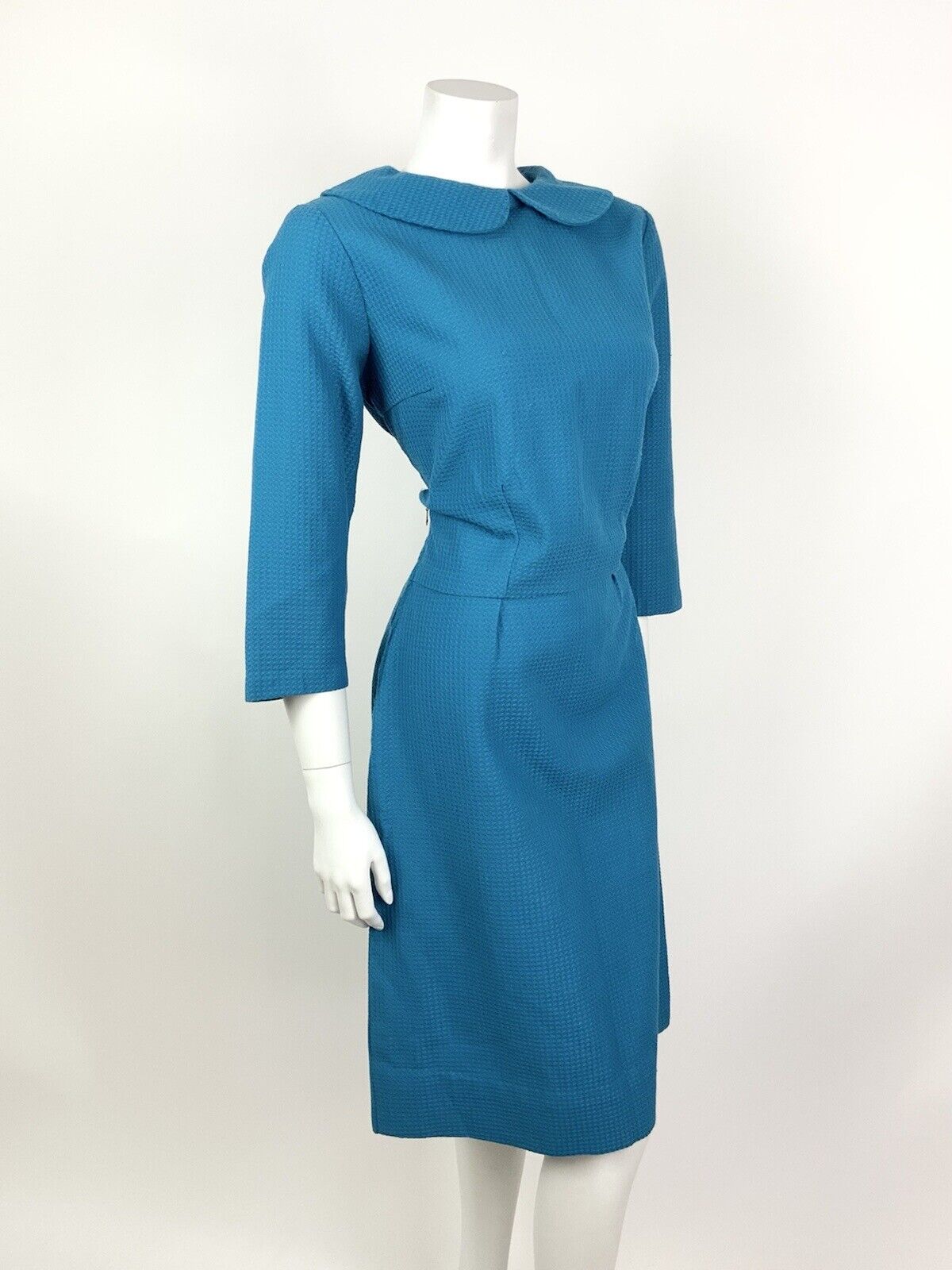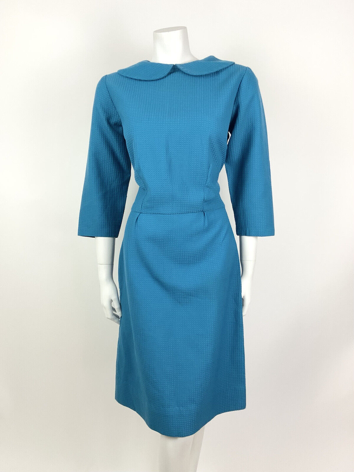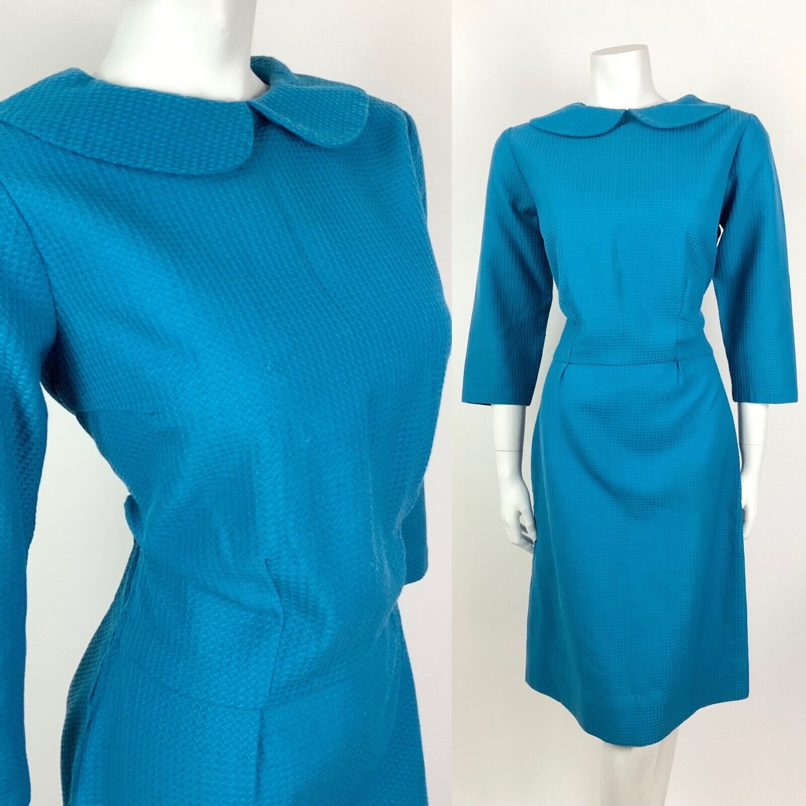 VINTAGE 60s 70s BRIGHT BLUE PETER PAN COLLAR WAFFLE MOD DRESS 12