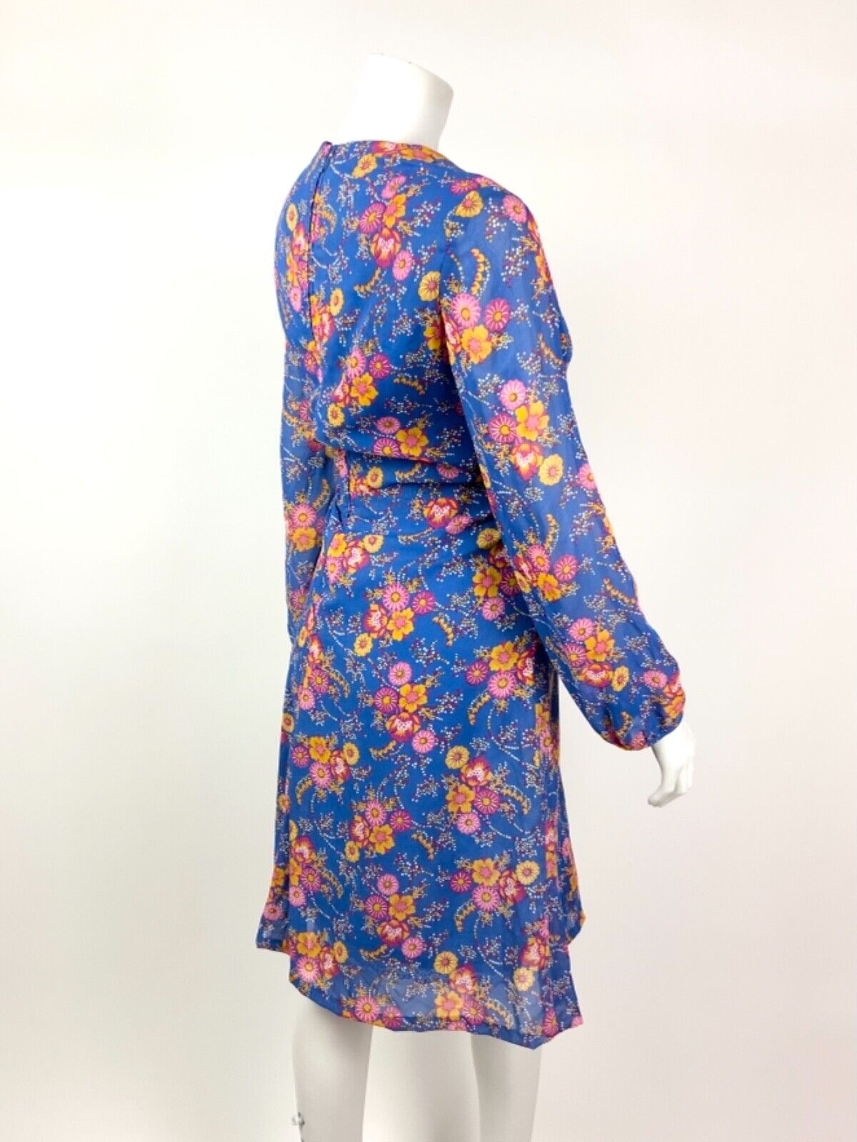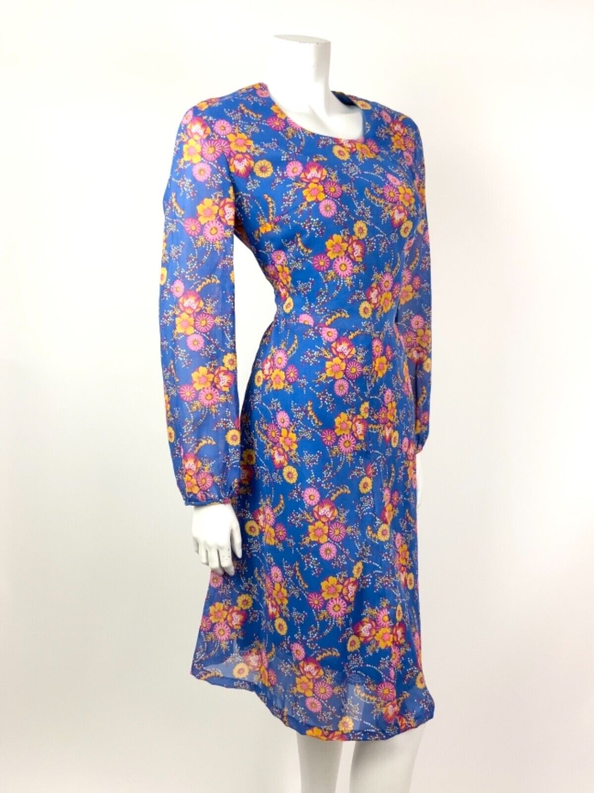 VINTAGE 60s 70s BRIGHT BLUE YELLOW PINK FLORAL DOTTY SHEER DRESS 12