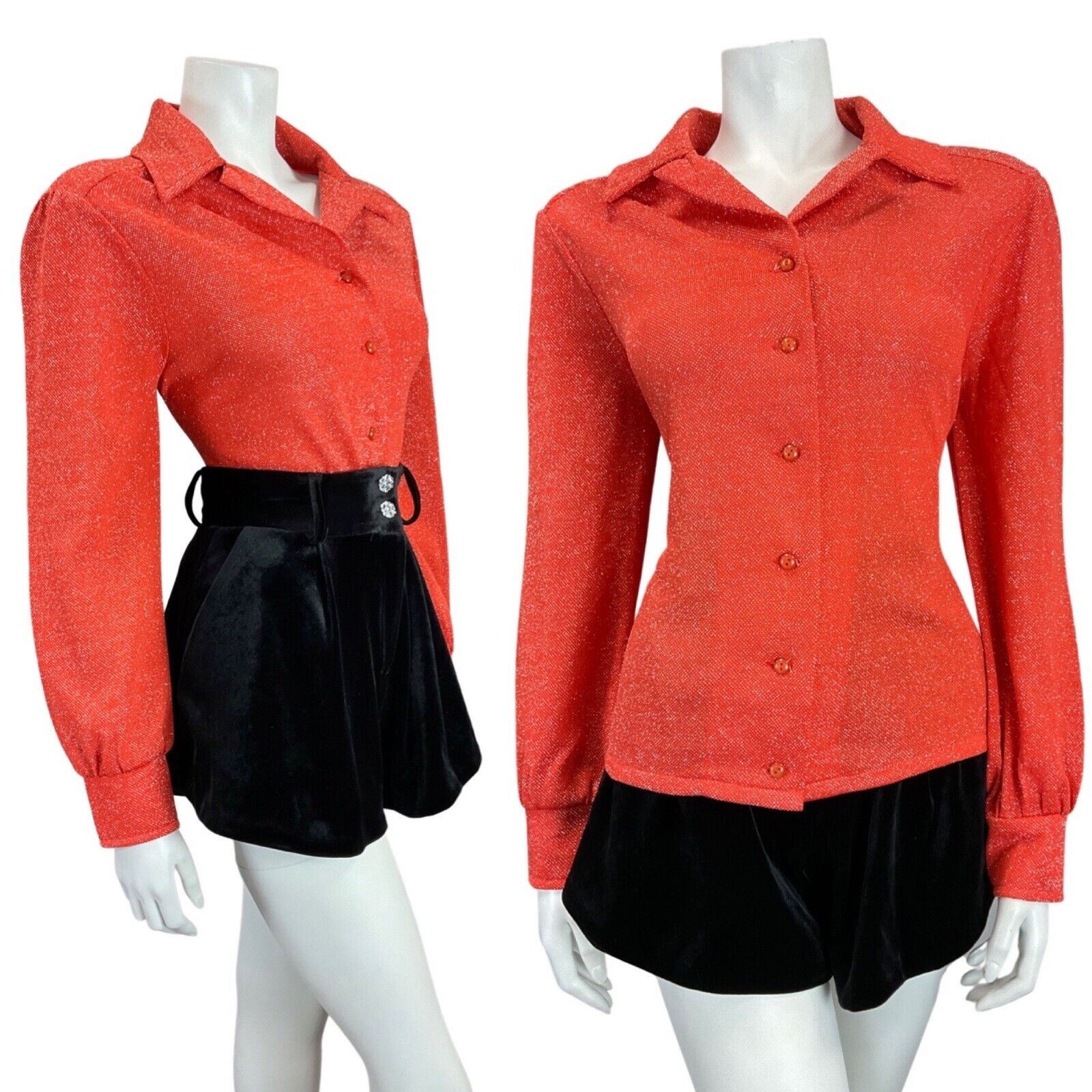 VINTAGE 60s 70s BRIGHT RED GLITTER DISCO LUREX DAGGER COLLAR SHIRT 12