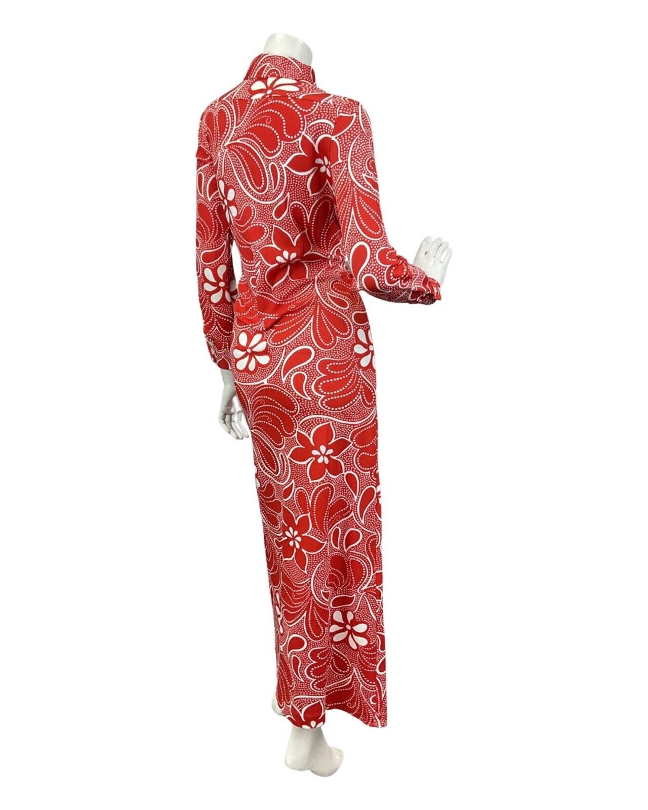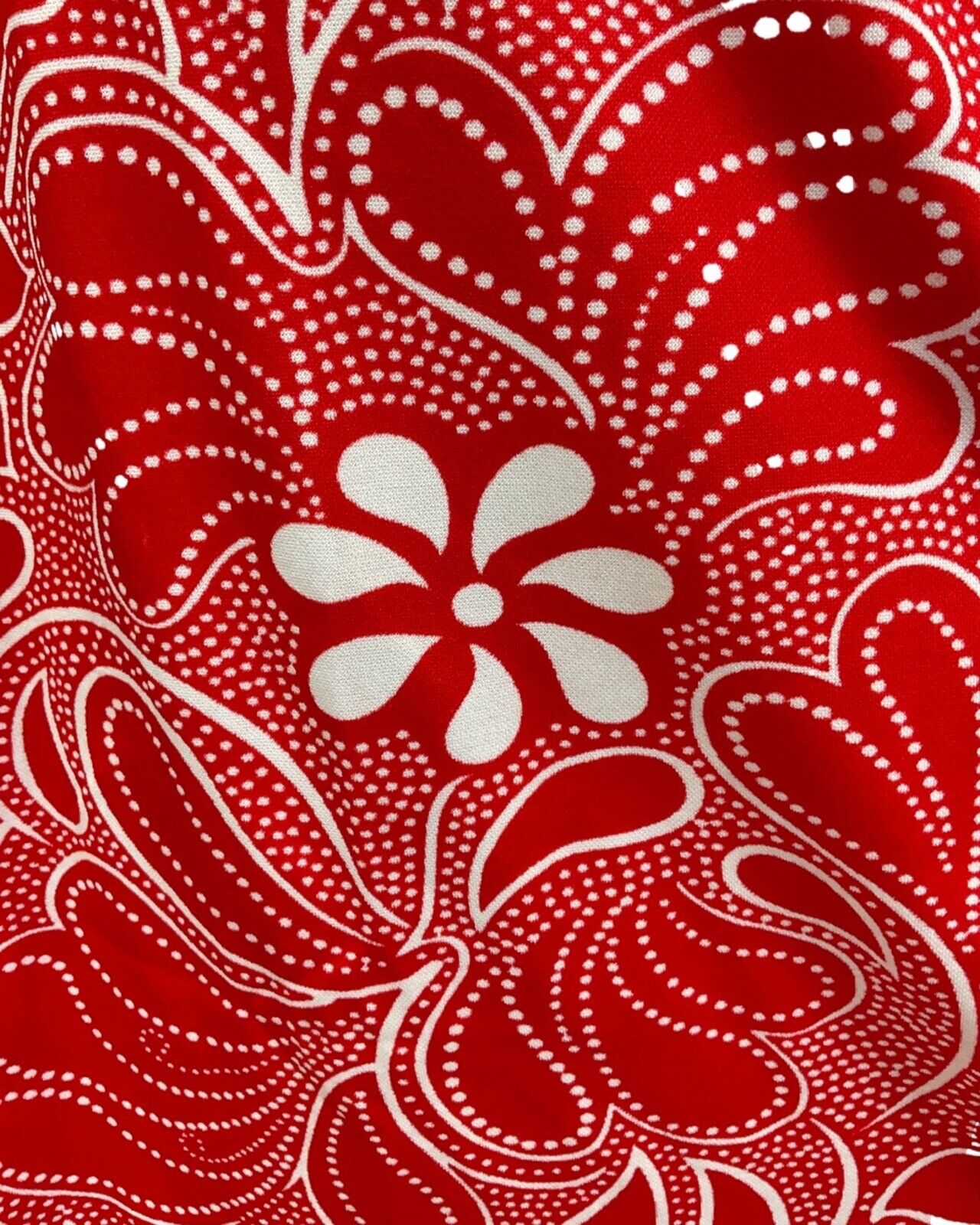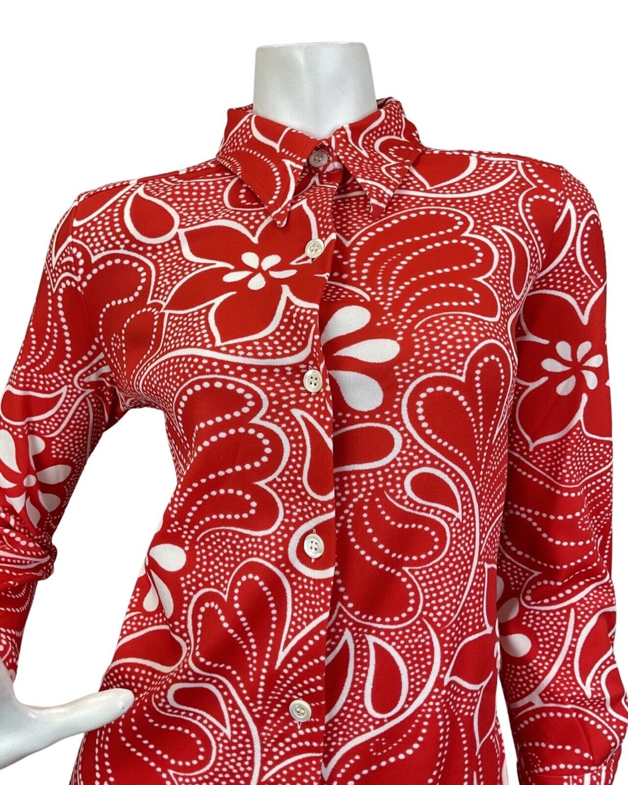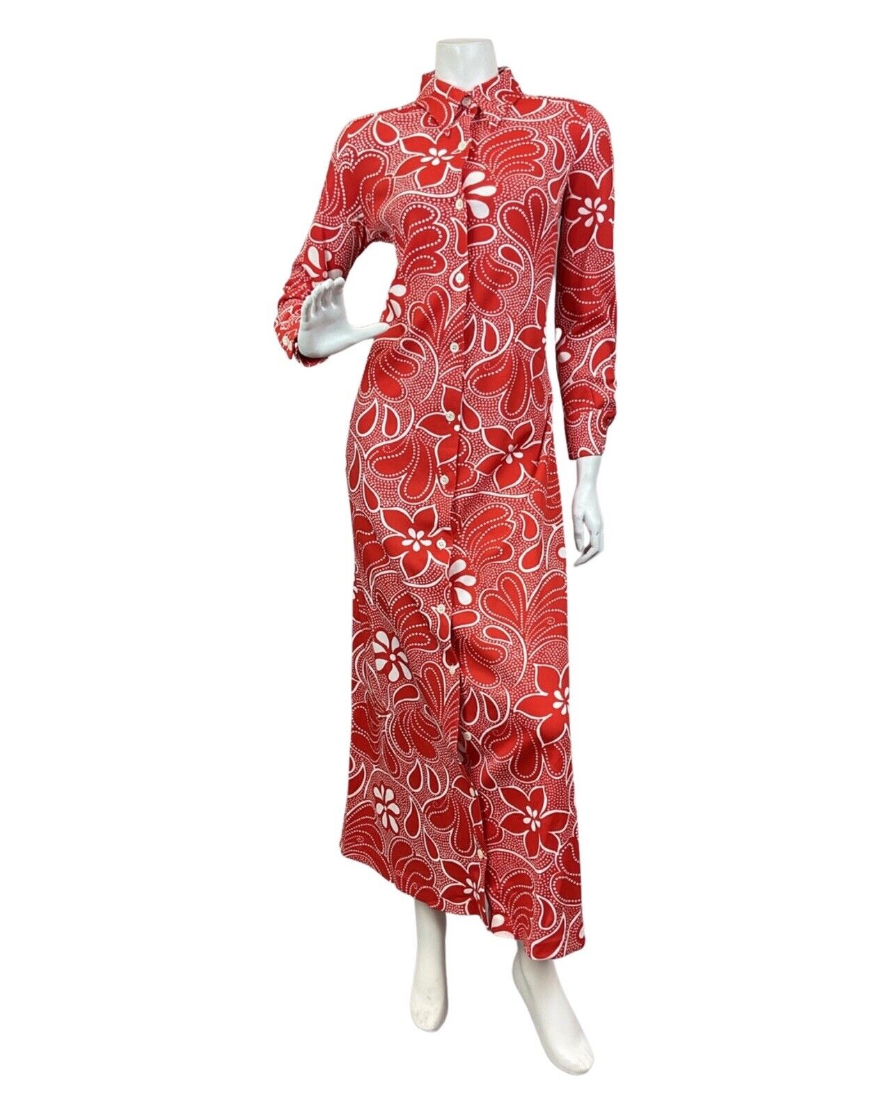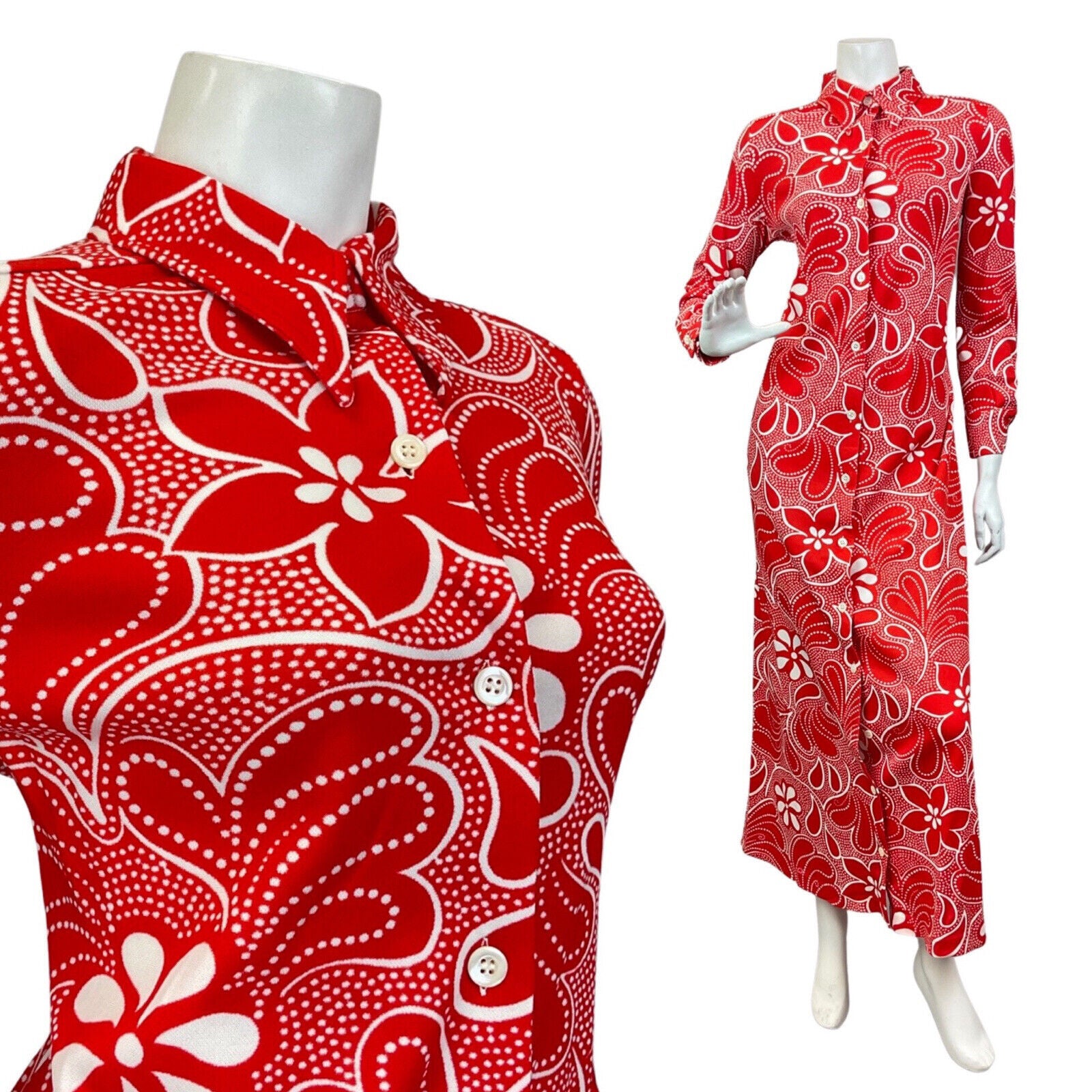 VINTAGE 60s 70s BRIGHT RED WHITE FLORAL DOTTY DAGGER COLLAR MOD MAXI DRESS 14