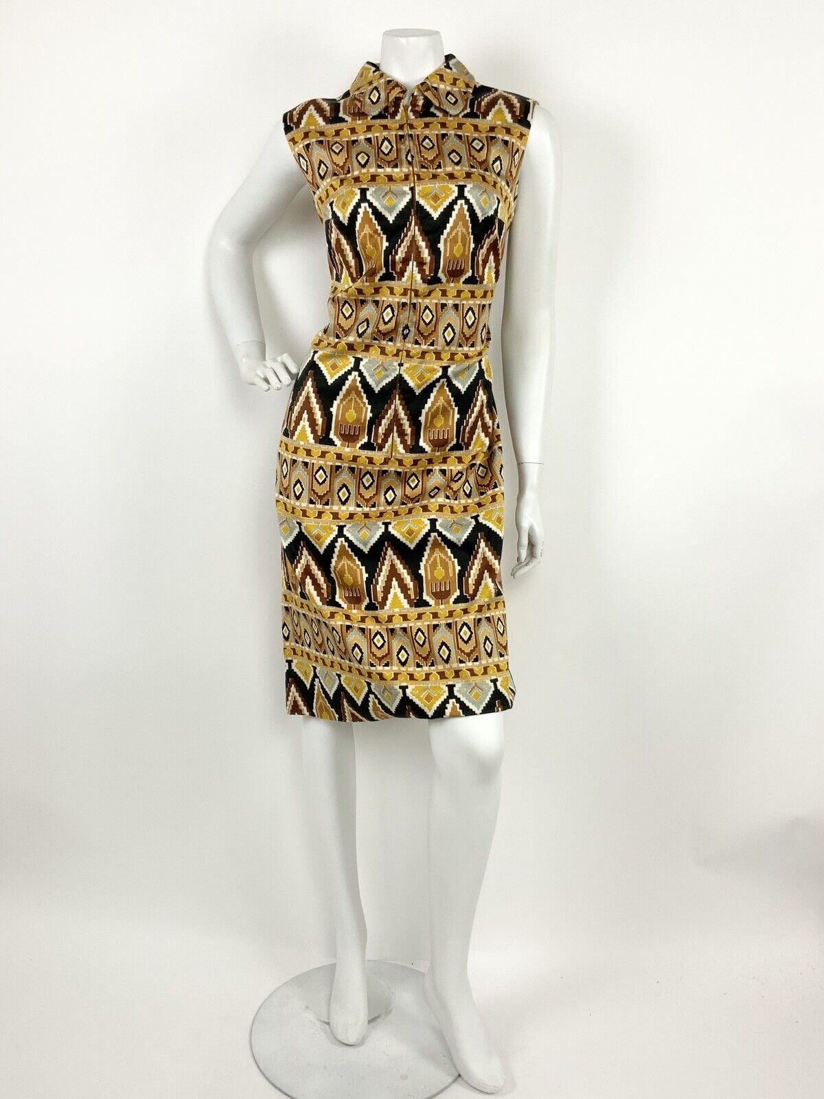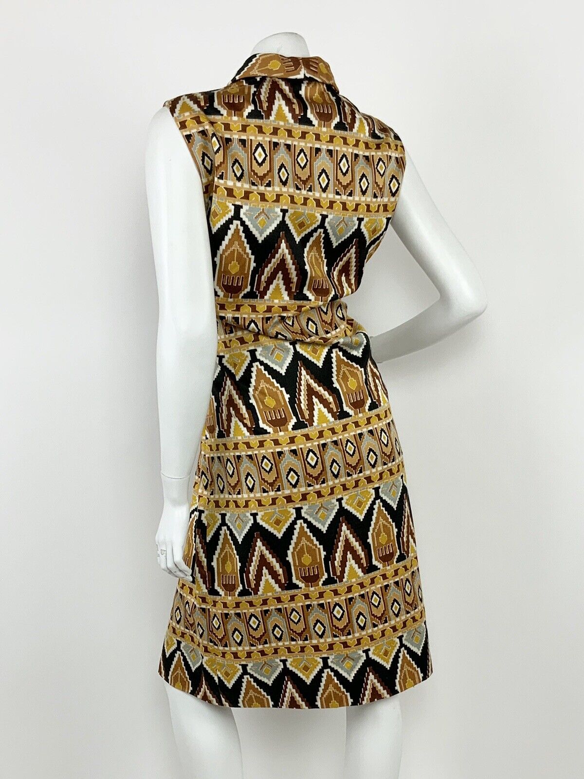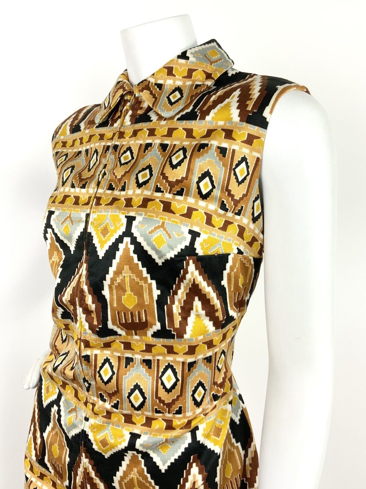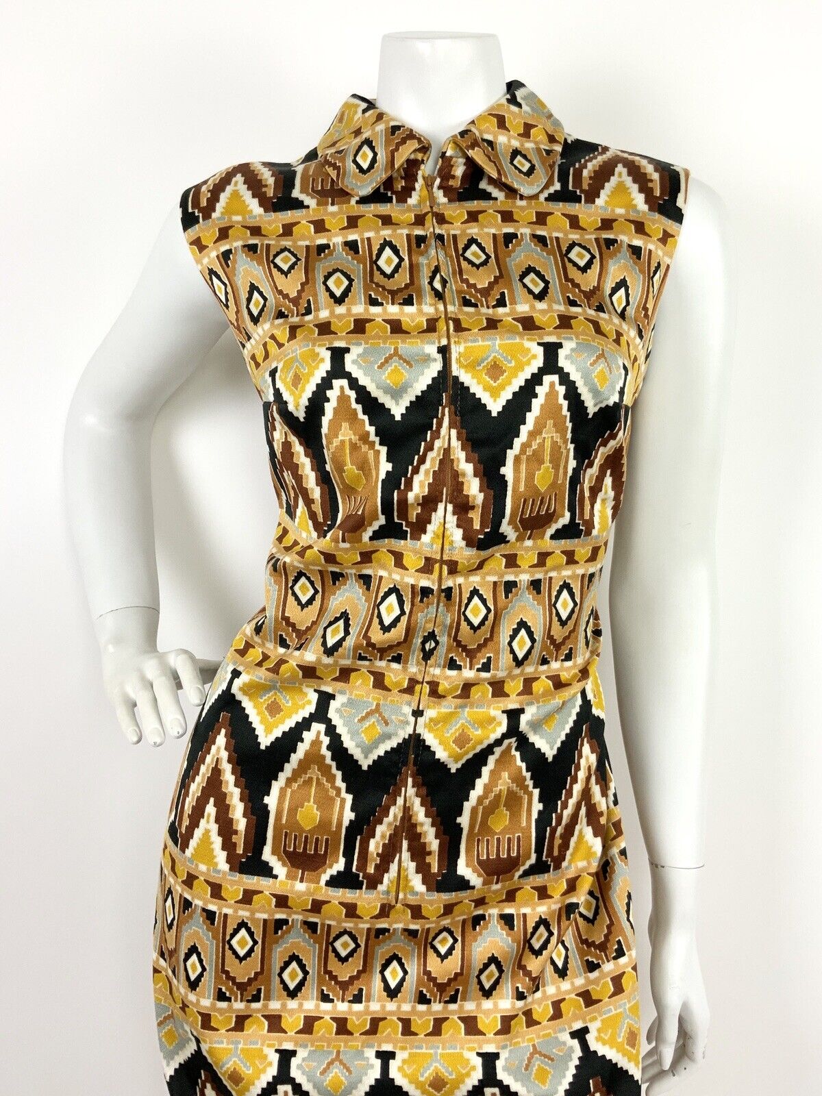 VINTAGE 60s 70s BROWN BRONZE GOLD BLACK WHITE AZTEC GEOMETRIC DRESS 12 14 16
