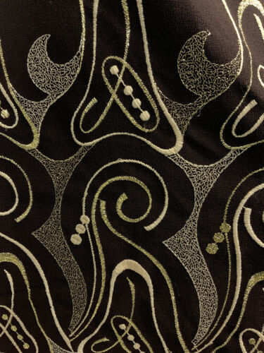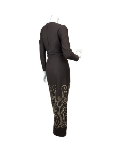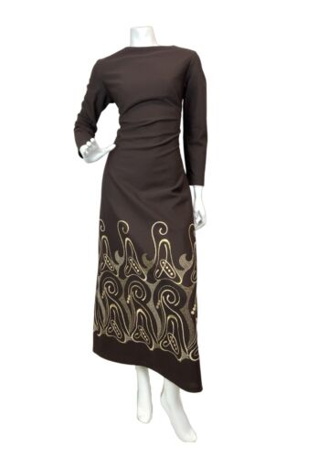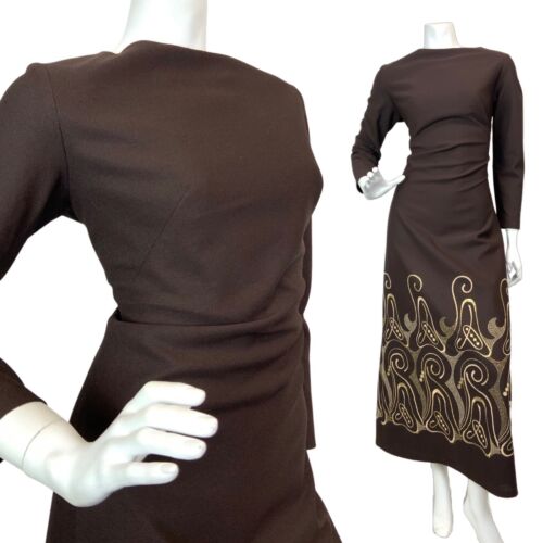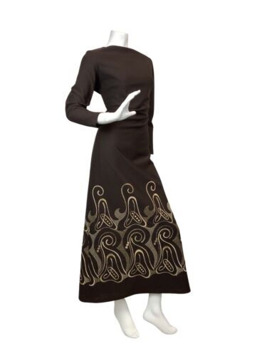 VINTAGE 60s 70s BROWN GOLD CREAM EMBROIDERED SWIRL GLAM MAXI DRESS 14