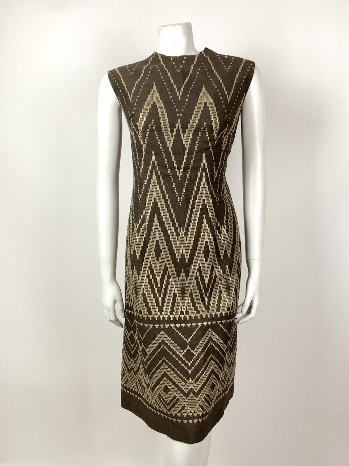 VINTAGE 60s 70s BROWN GOLD CREAM ZIG ZAG AZTEC SLEEVELESS DRESS 12 14