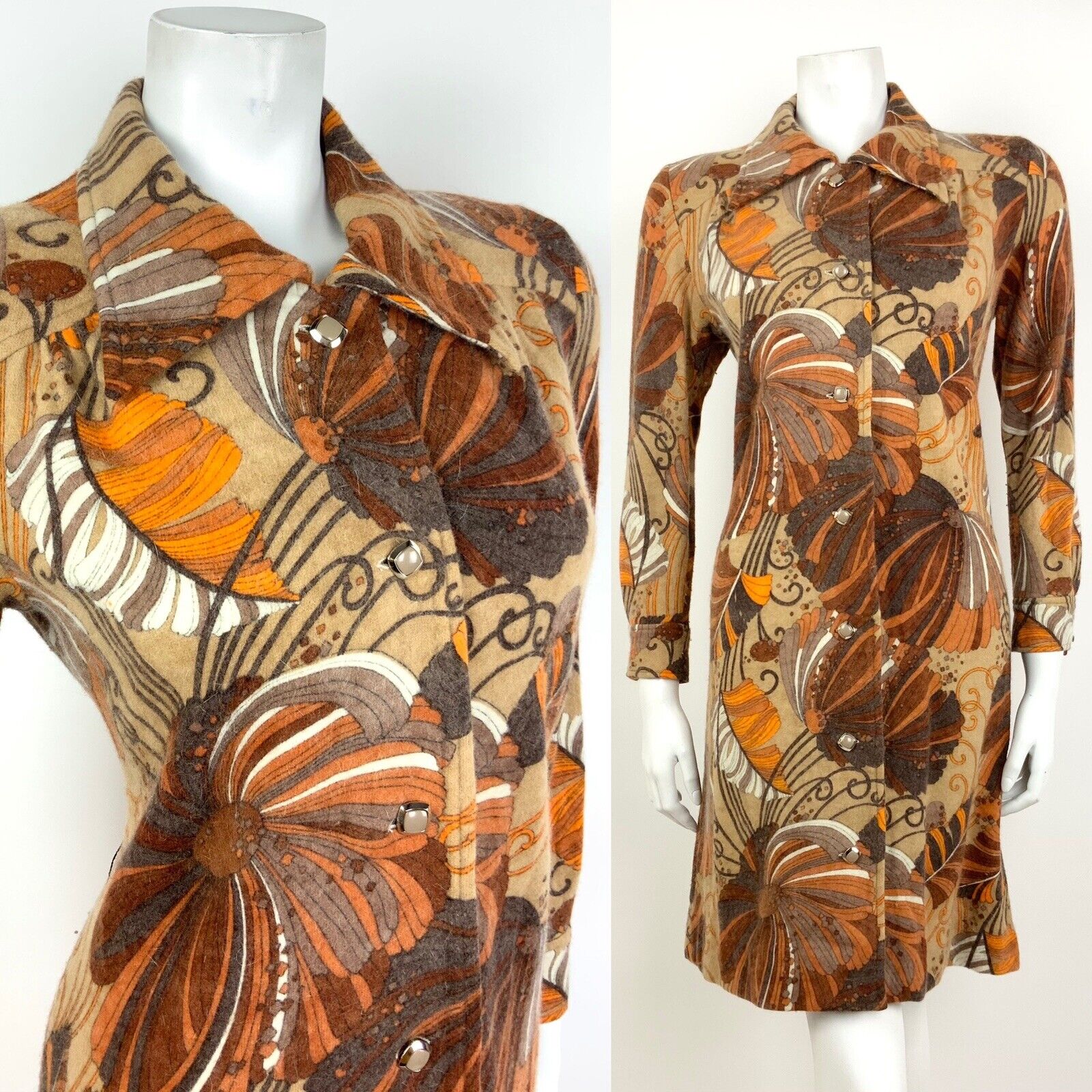 VINTAGE 60s 70s BROWN GREY ORANGE WHITE FLORAL PSYCHEDELIC SHIRT DRESS 14 16