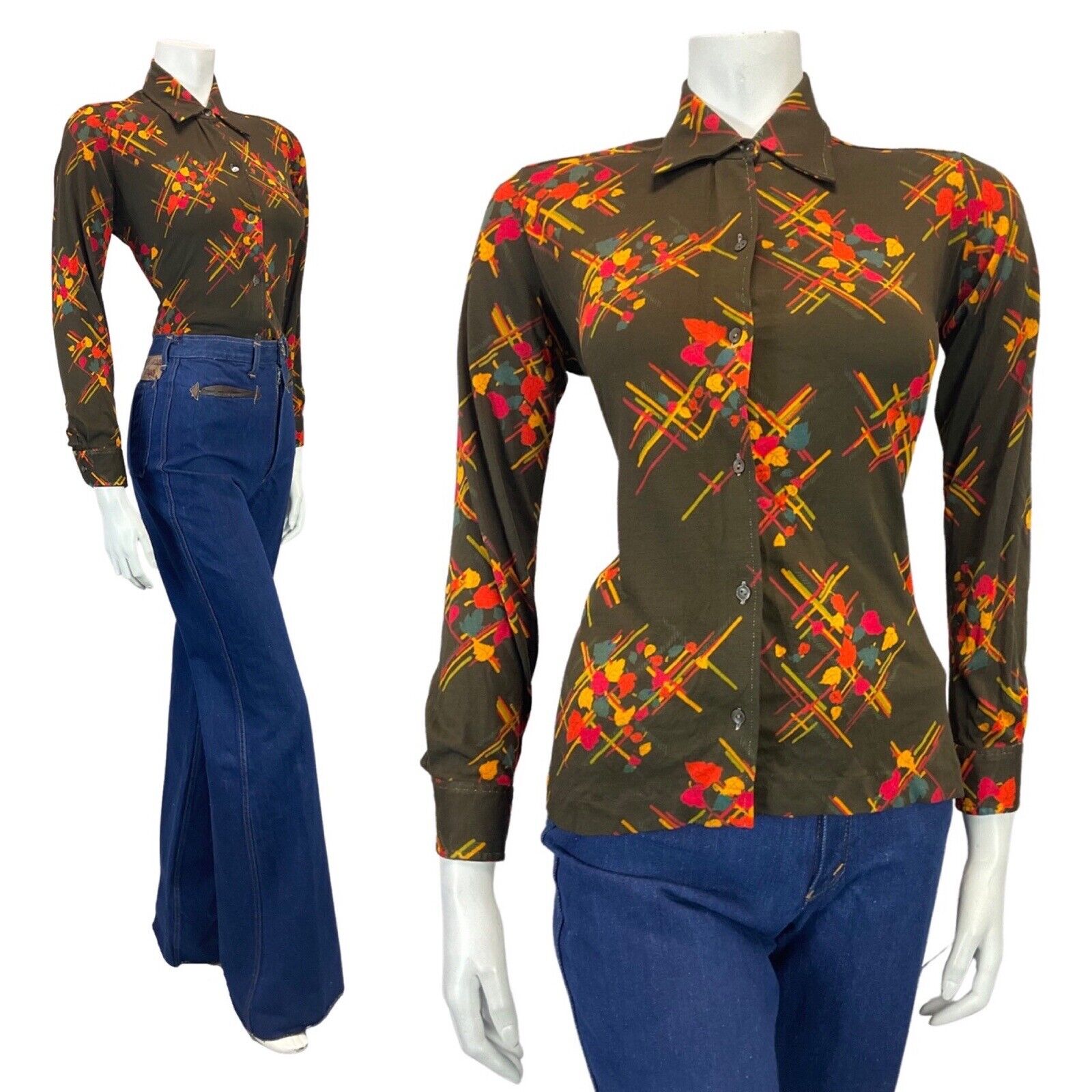 VINTAGE 60s 70s BROWN ORANGE FLORAL LEAFY STRIPED MOD DAGGER SHIRT 12 14