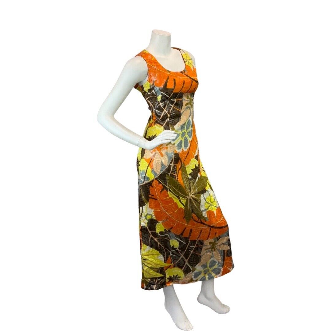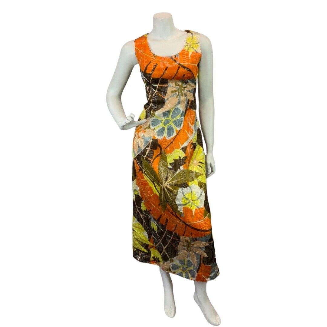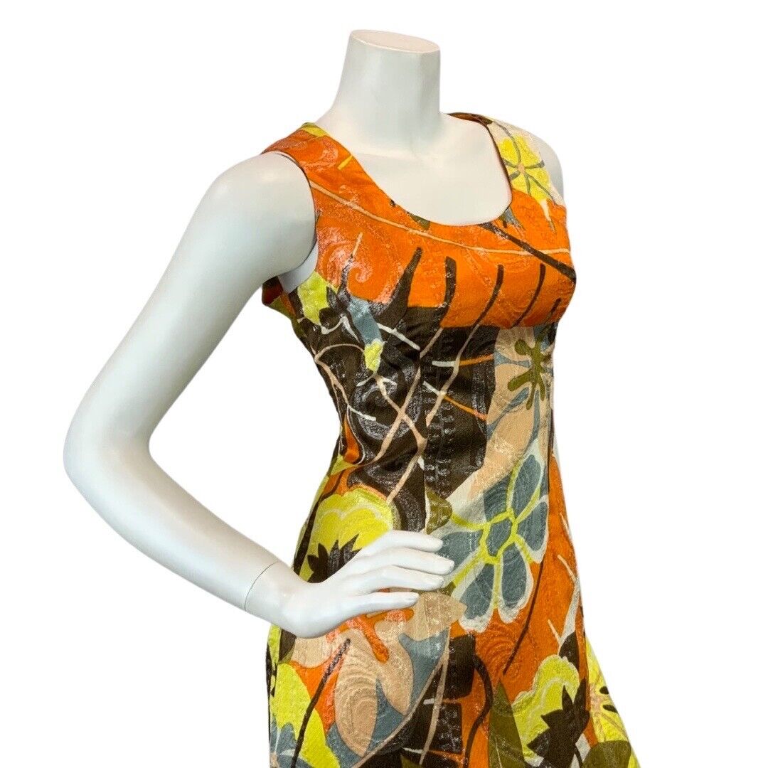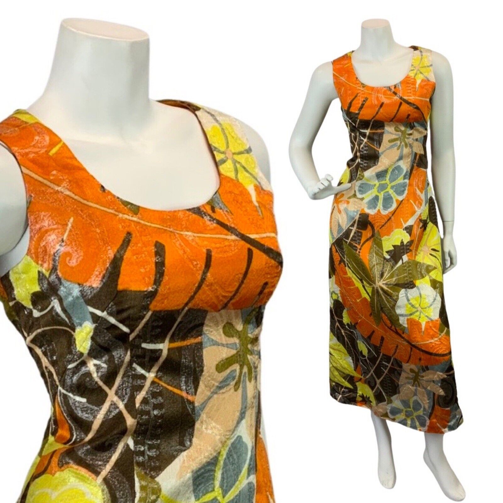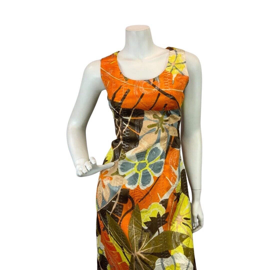 VINTAGE 60s 70s BROWN ORANGE YELLOW PSYCHEDELIC FLORAL LUREX MOD MAXI DRESS 10