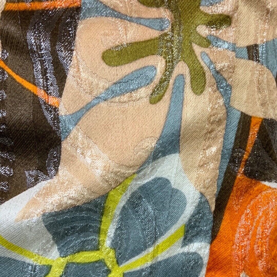 Covering the fabric is a busy floral pattern in shades of orange, cream, brown, and yellow.