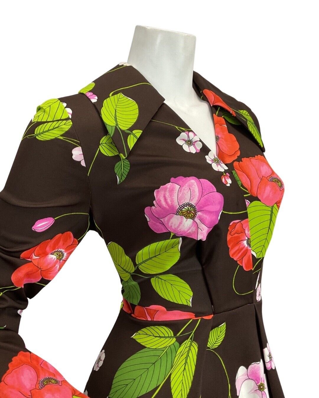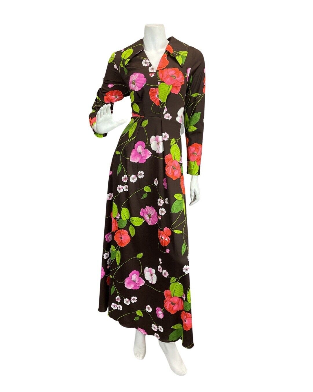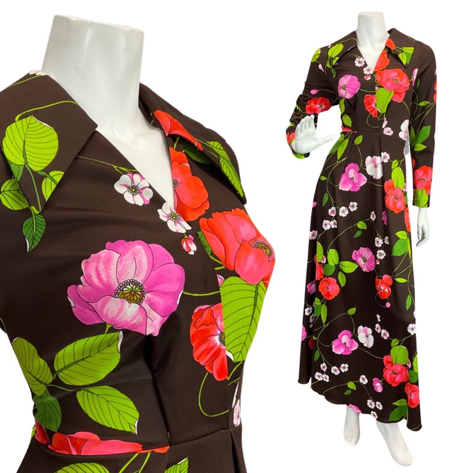 VINTAGE 60s 70s BROWN PINK GREEN FLORAL DAGGER COLLAR SHIRT MAXI DRESS 10