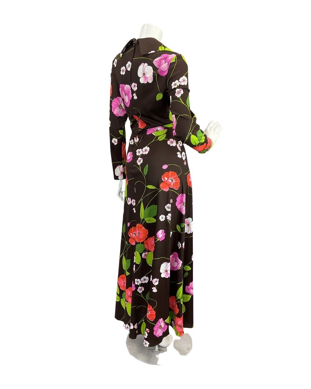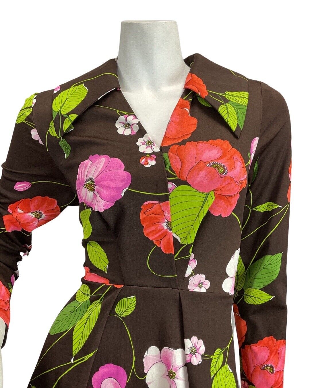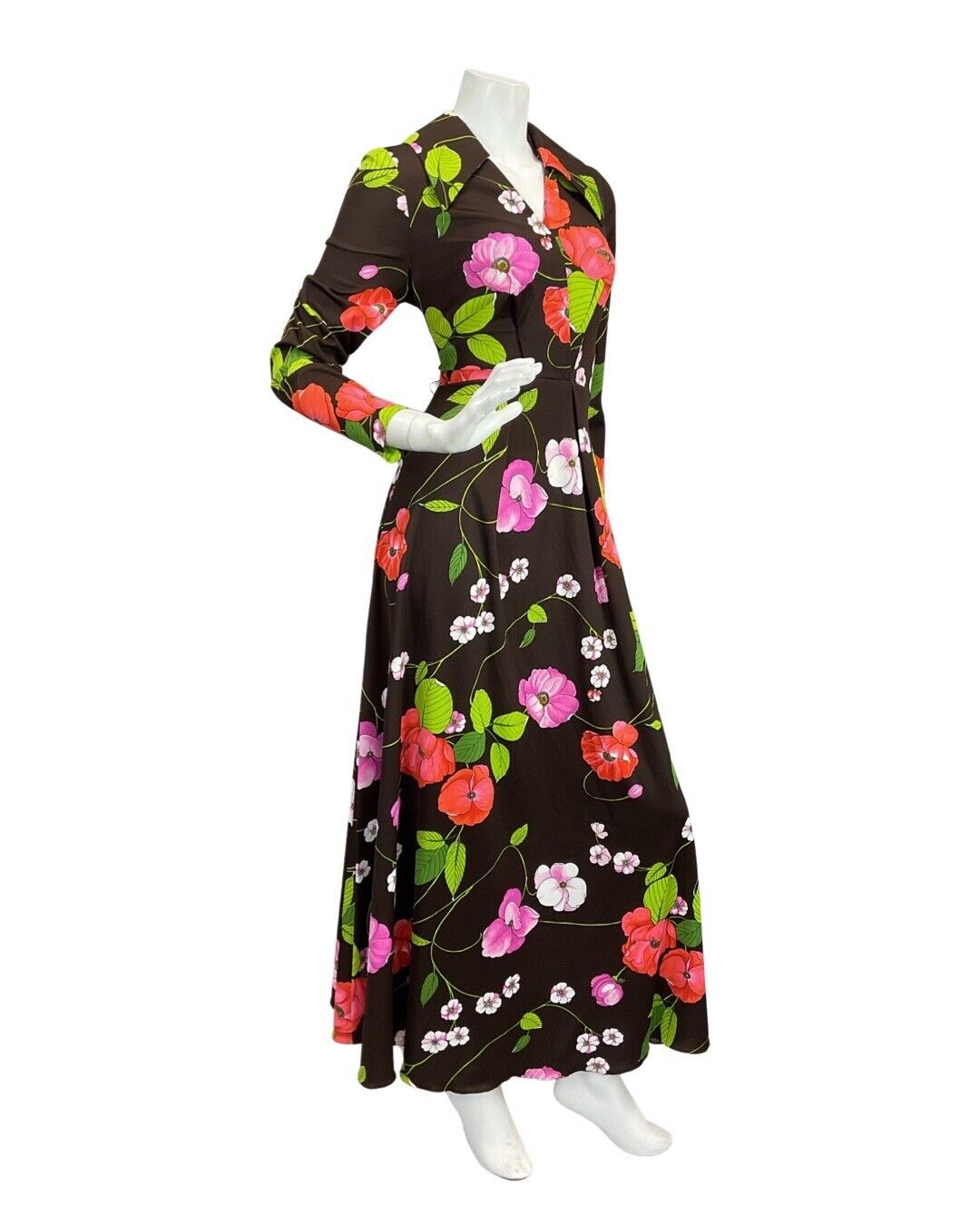 VINTAGE 60s 70s BROWN PINK GREEN FLORAL DAGGER COLLAR SHIRT MAXI DRESS 10