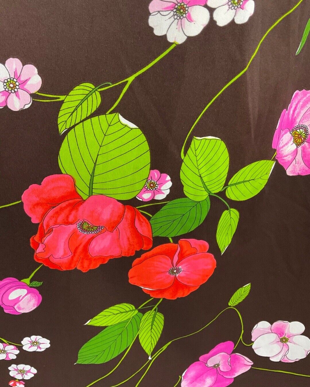 Covering the fabric is a bold floral pattern in shades of green, pink, red, and white.