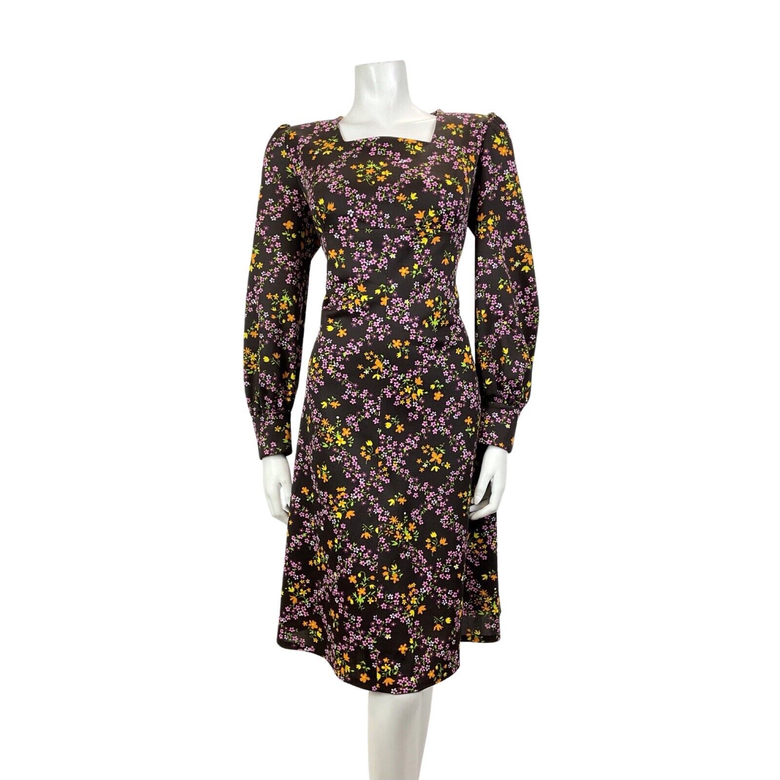 VINTAGE 60s 70s BROWN PURPLE GREEN FLORAL DITSY CHECKED EMPIRE LINE MOD DRESS 16