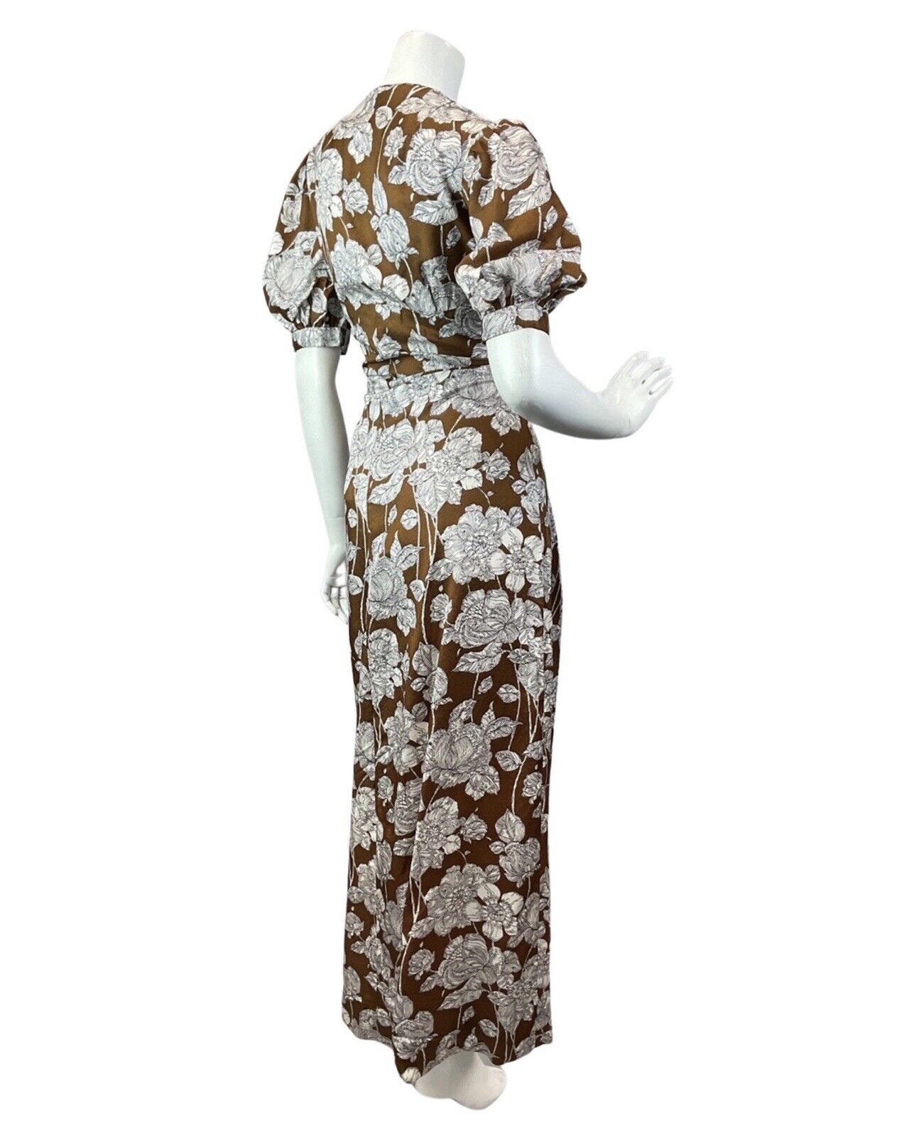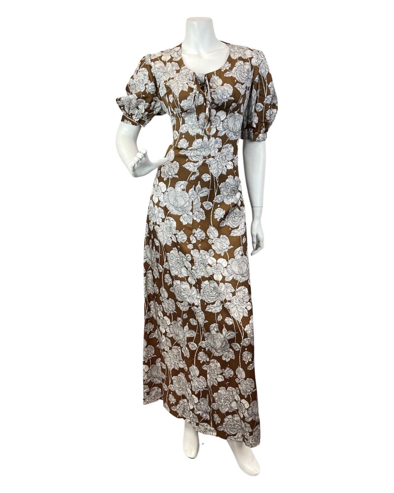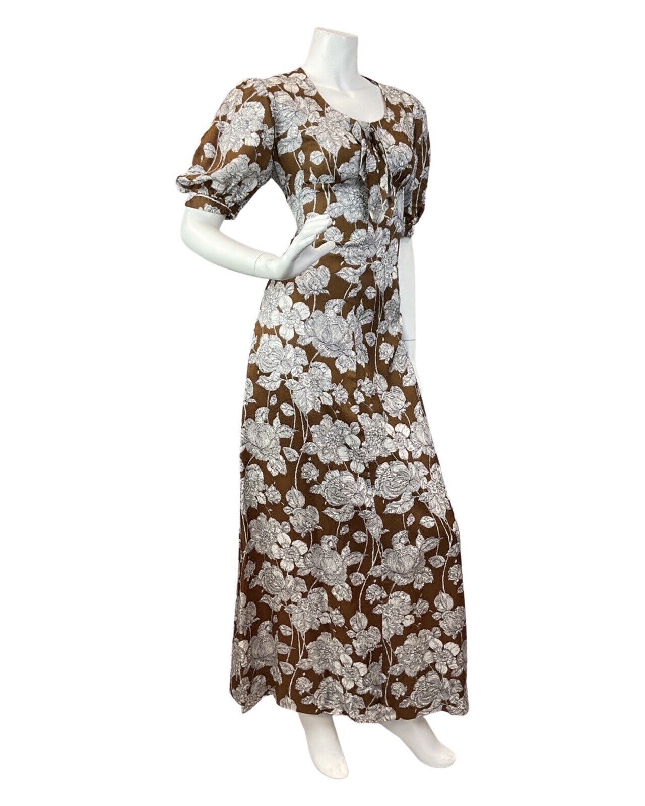 VINTAGE 60s 70s BROWN WHITE FLORAL ROSE BOHO PUFF SLEEVE MAXI DRESS 10 12