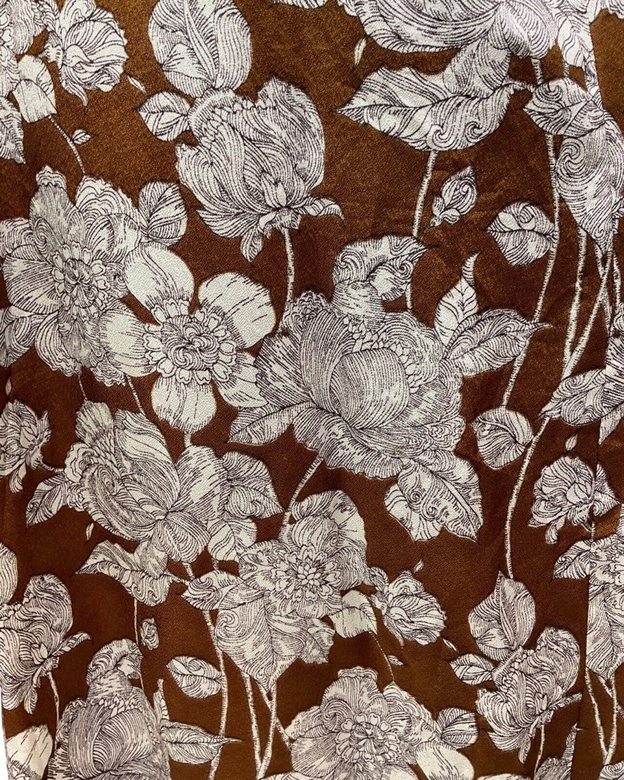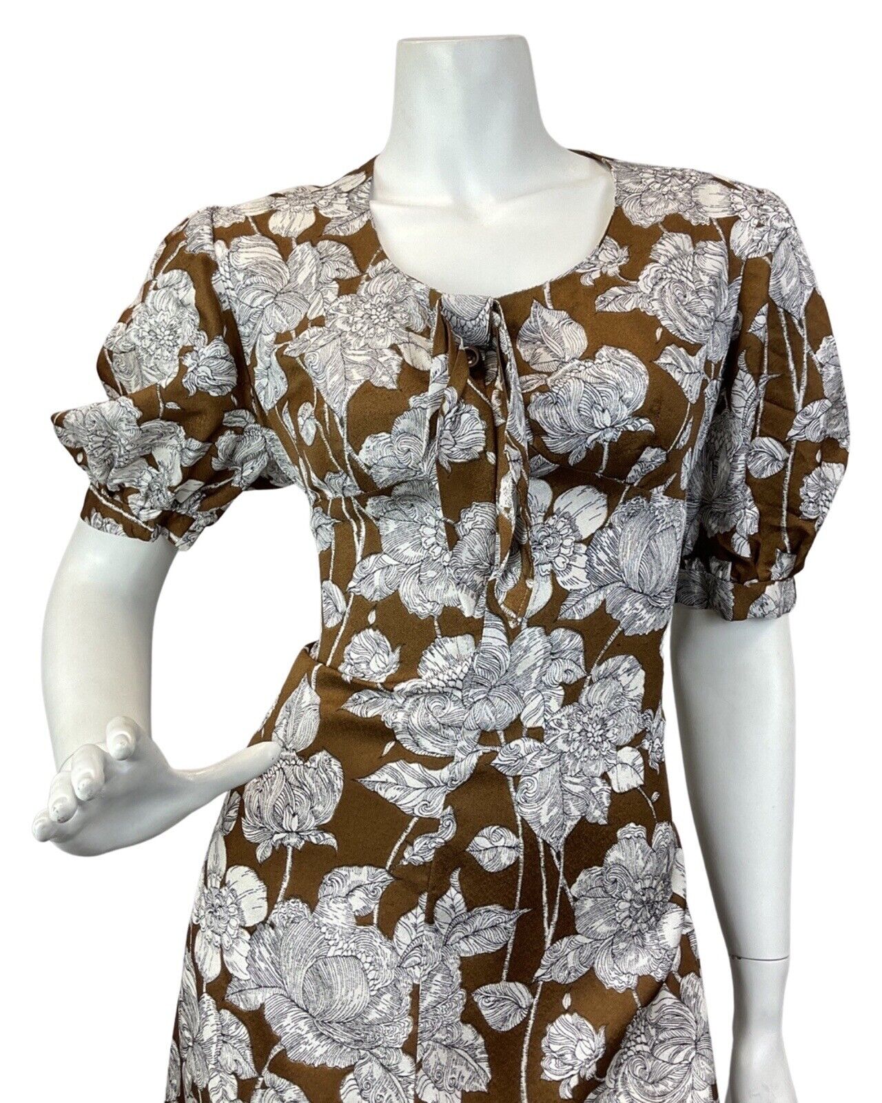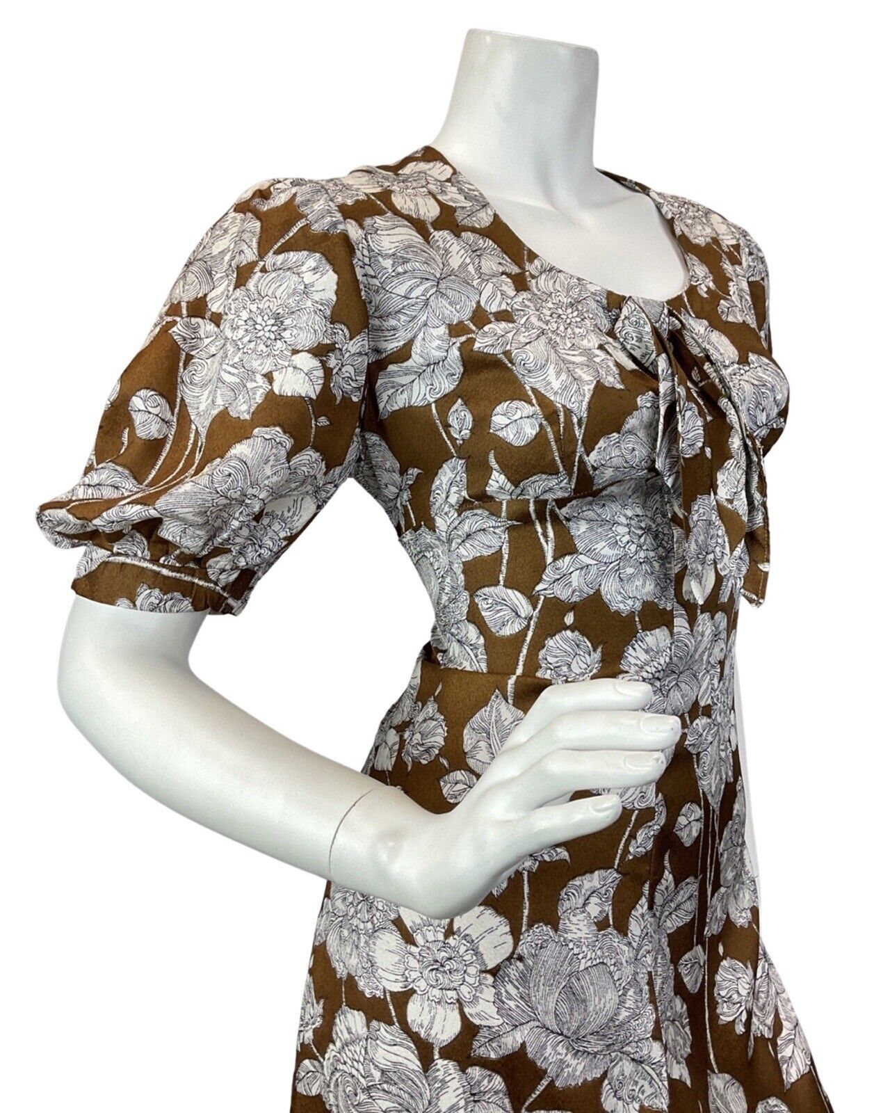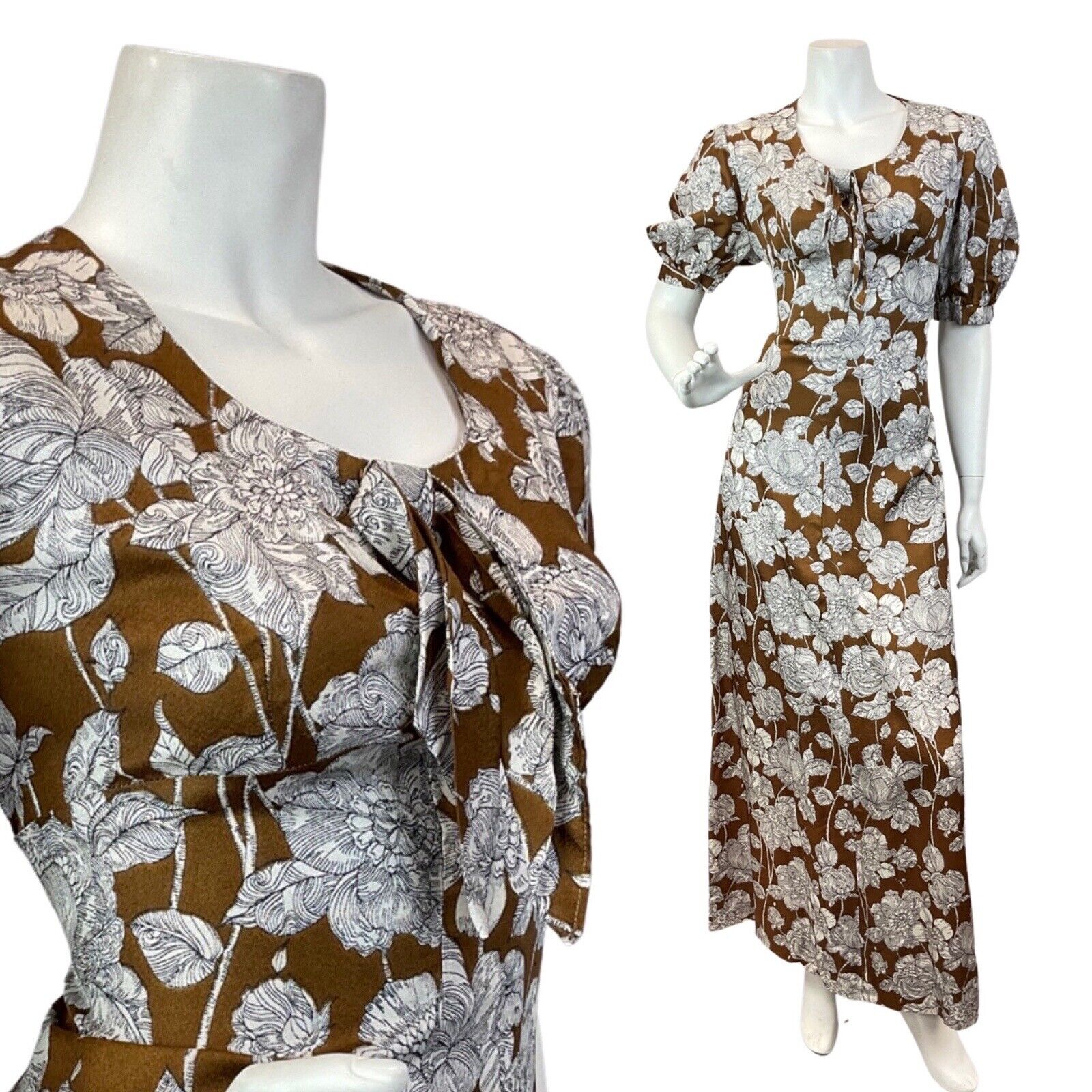 VINTAGE 60s 70s BROWN WHITE FLORAL ROSE BOHO PUFF SLEEVE MAXI DRESS 10 12