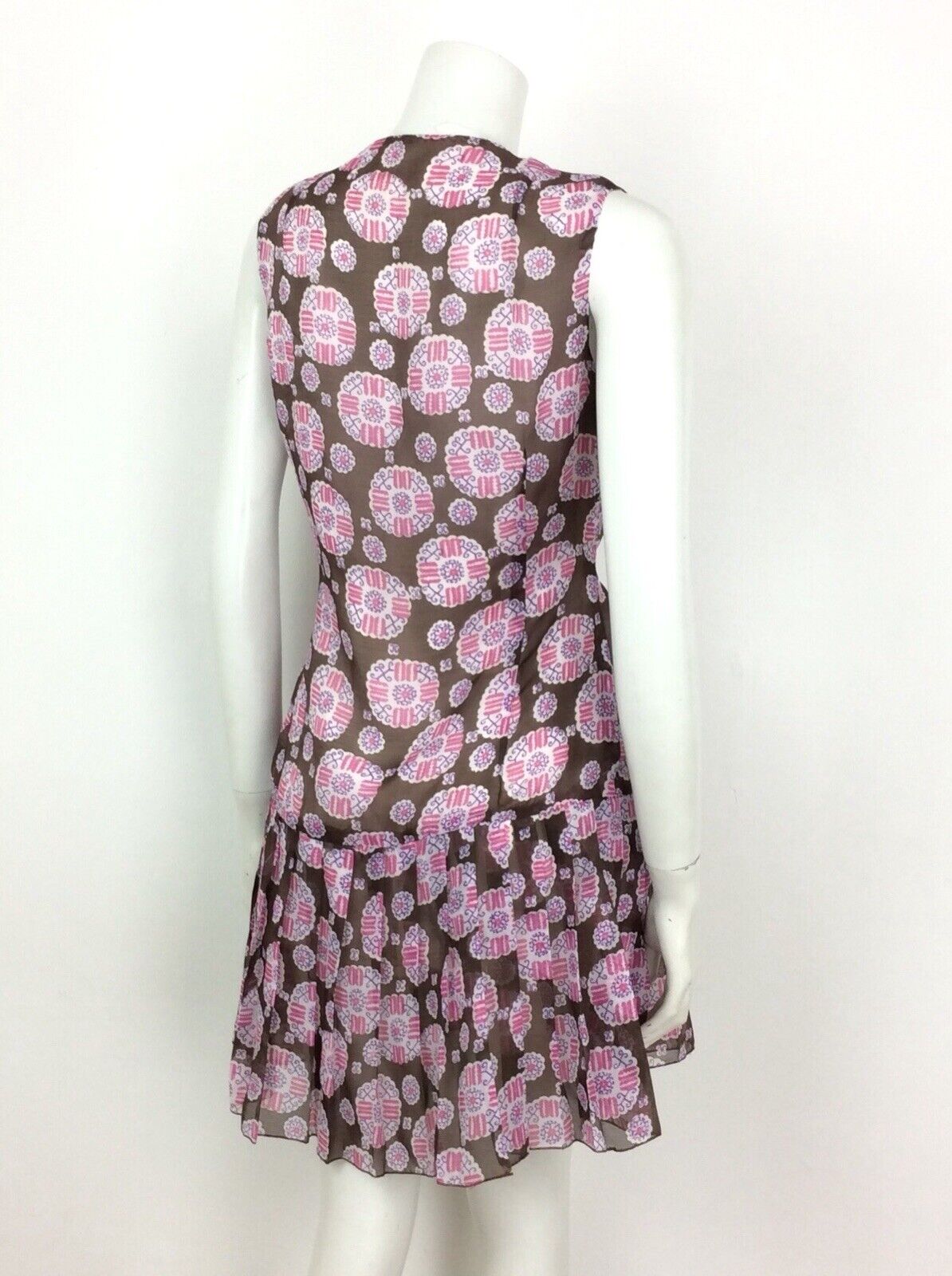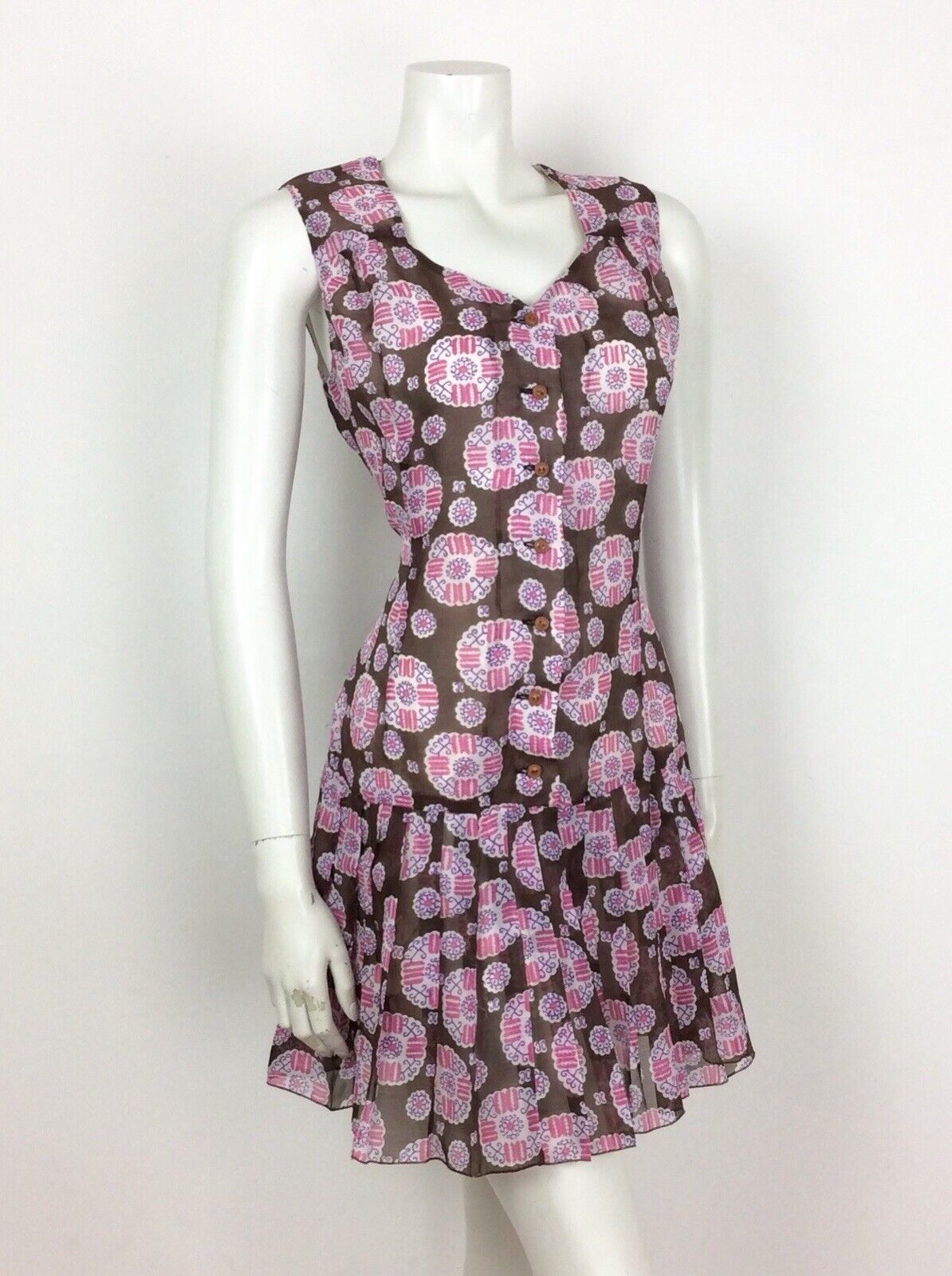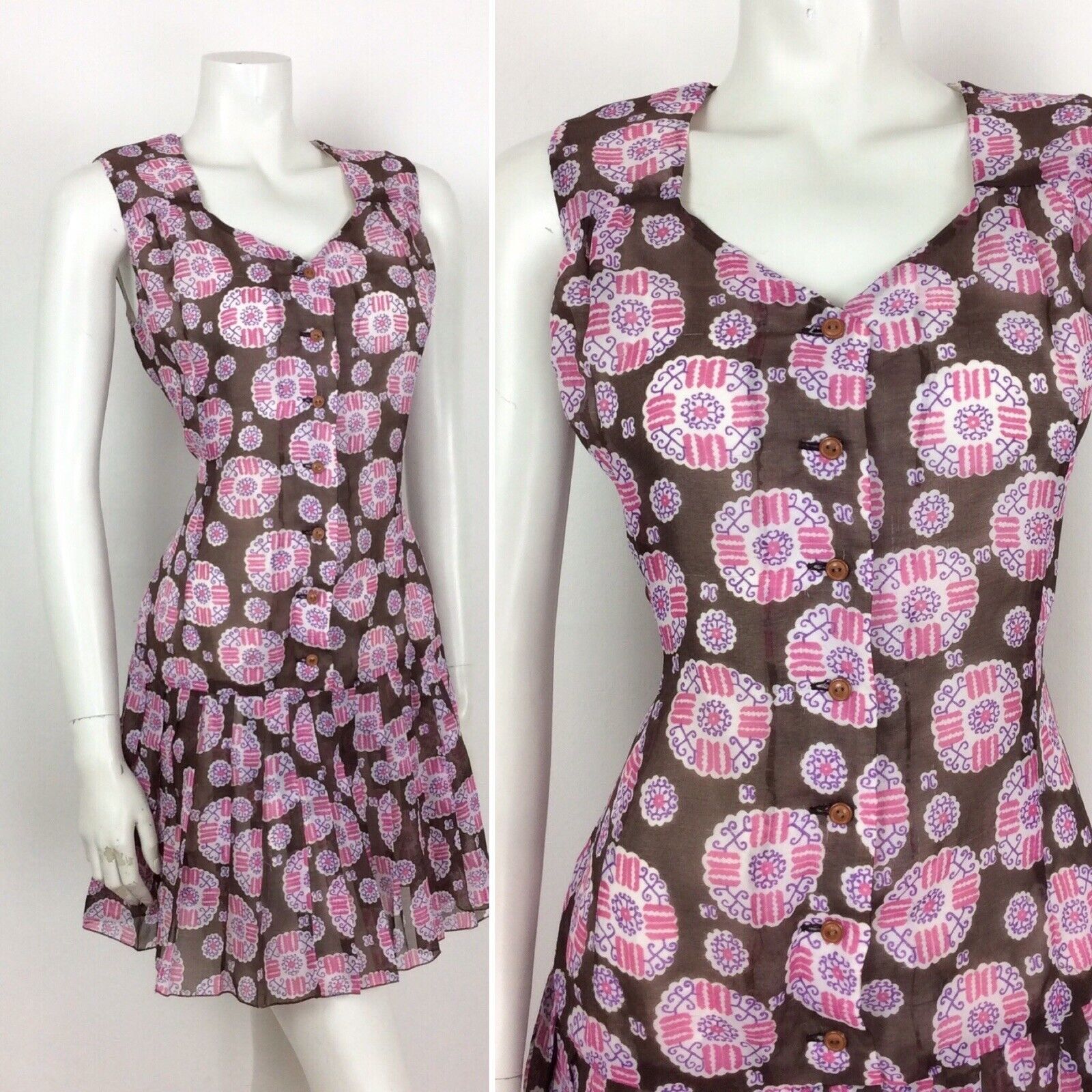 VINTAGE 60S 70S BROWN WHITE PINK PAISLEY SMOCK DRESS DROPPED PLEAT WAIST 14 16