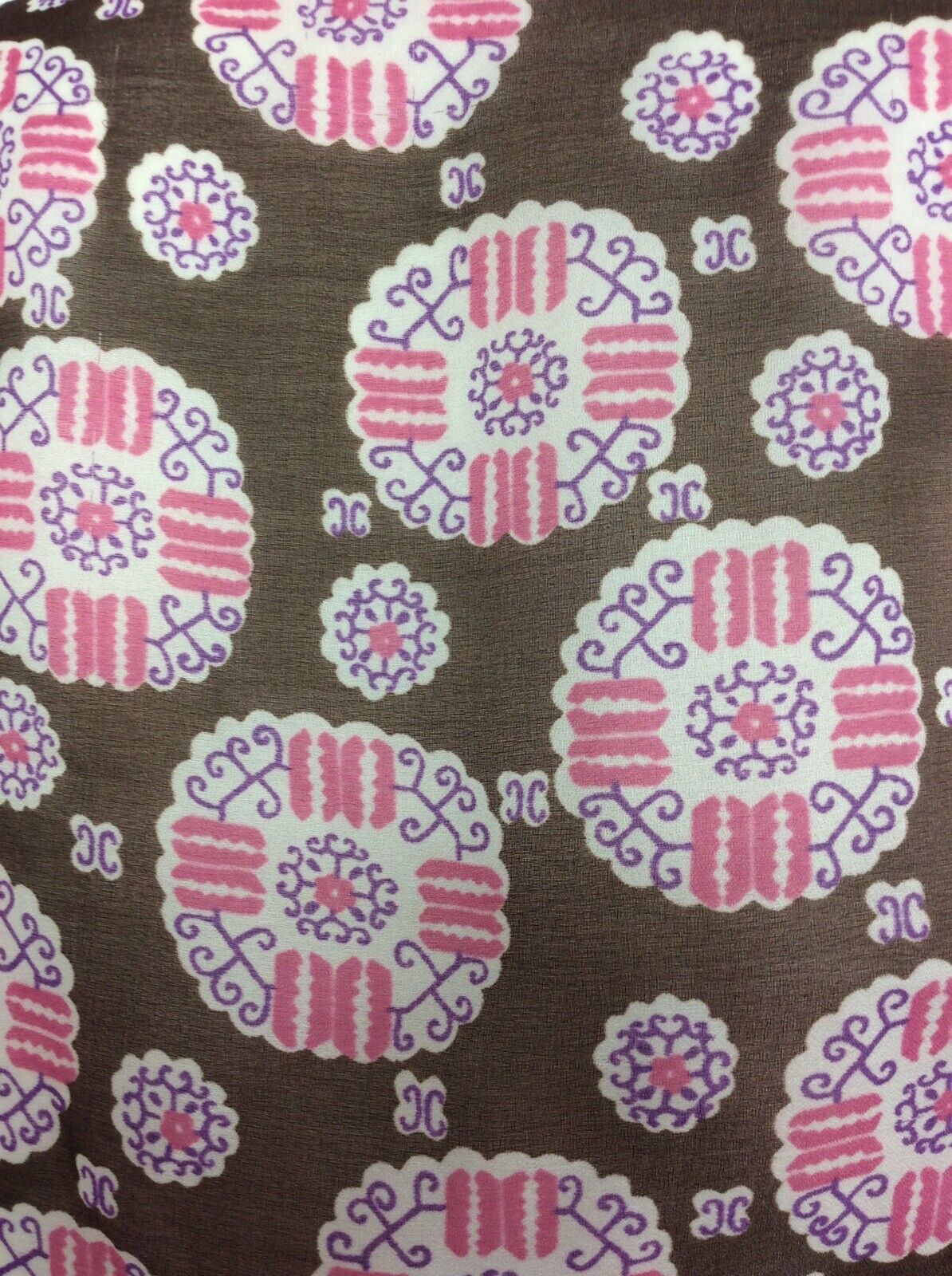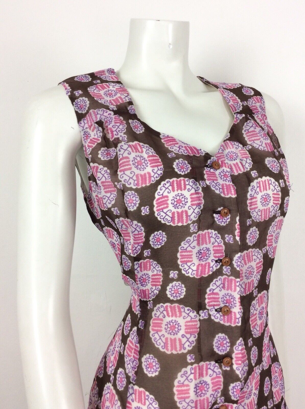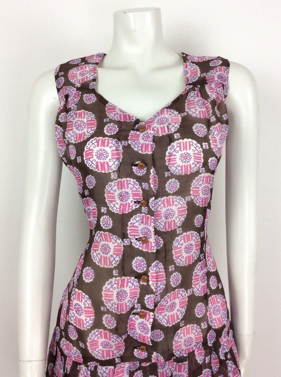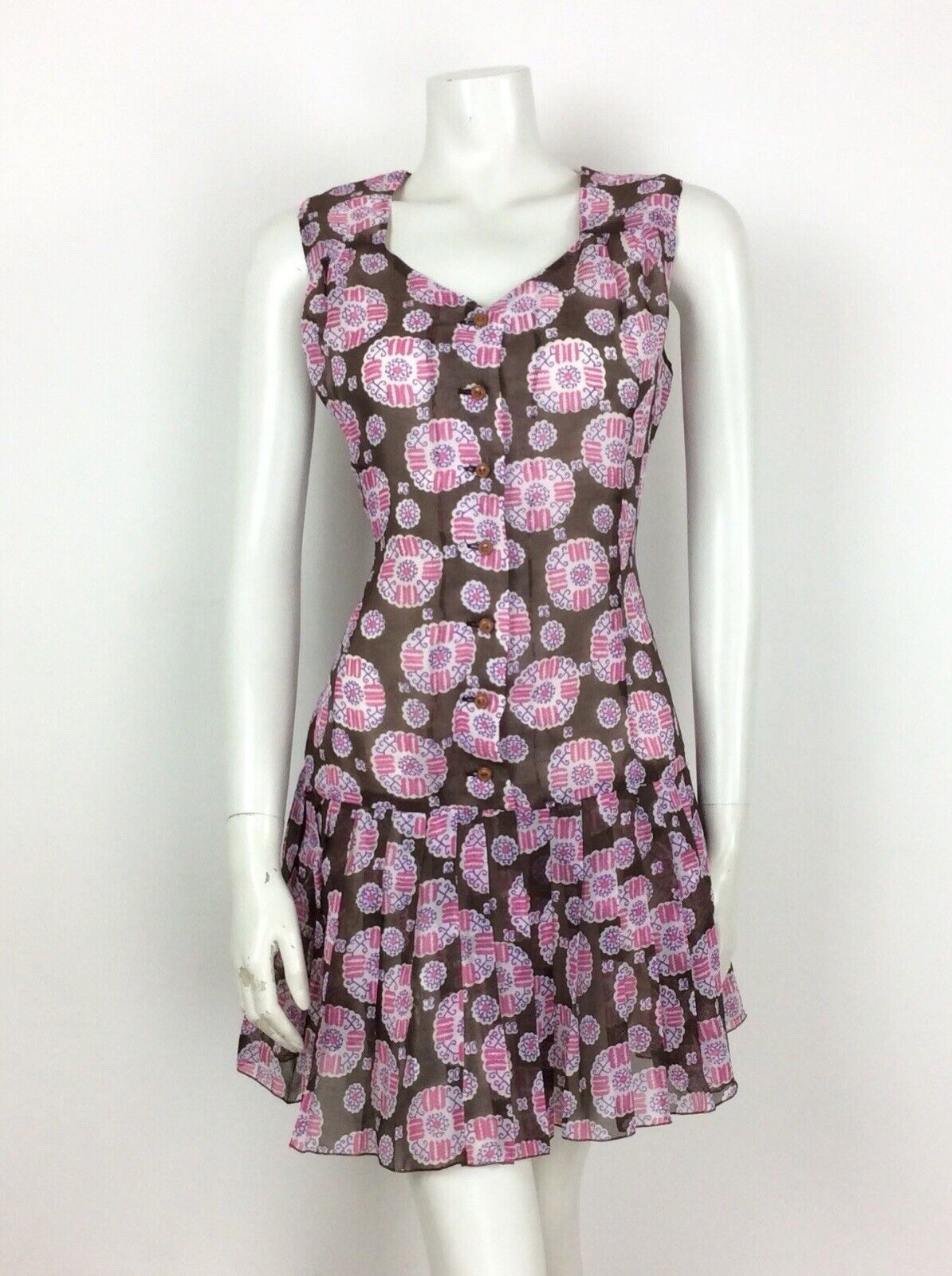 VINTAGE 60S 70S BROWN WHITE PINK PAISLEY SMOCK DRESS DROPPED PLEAT WAIST 14 16