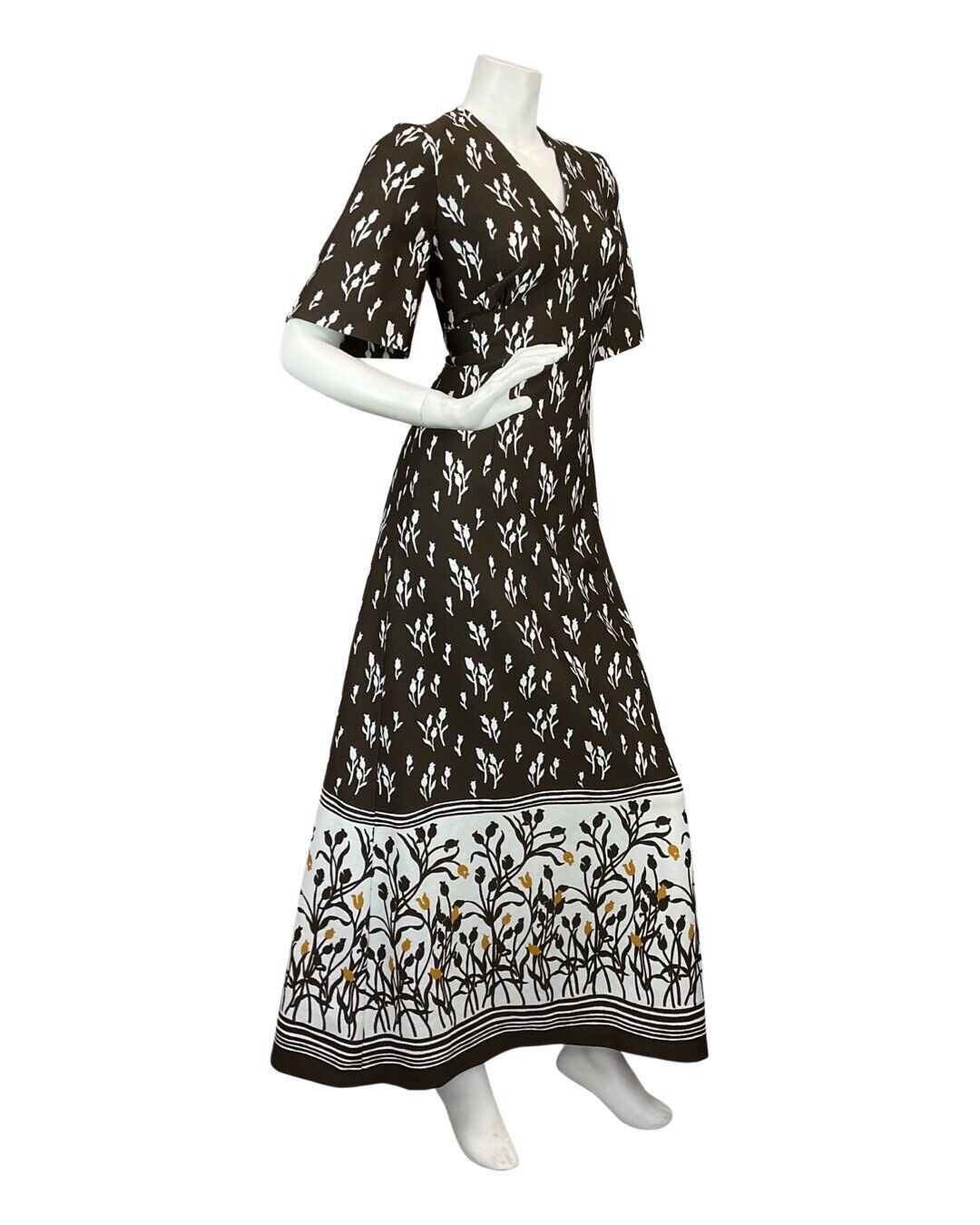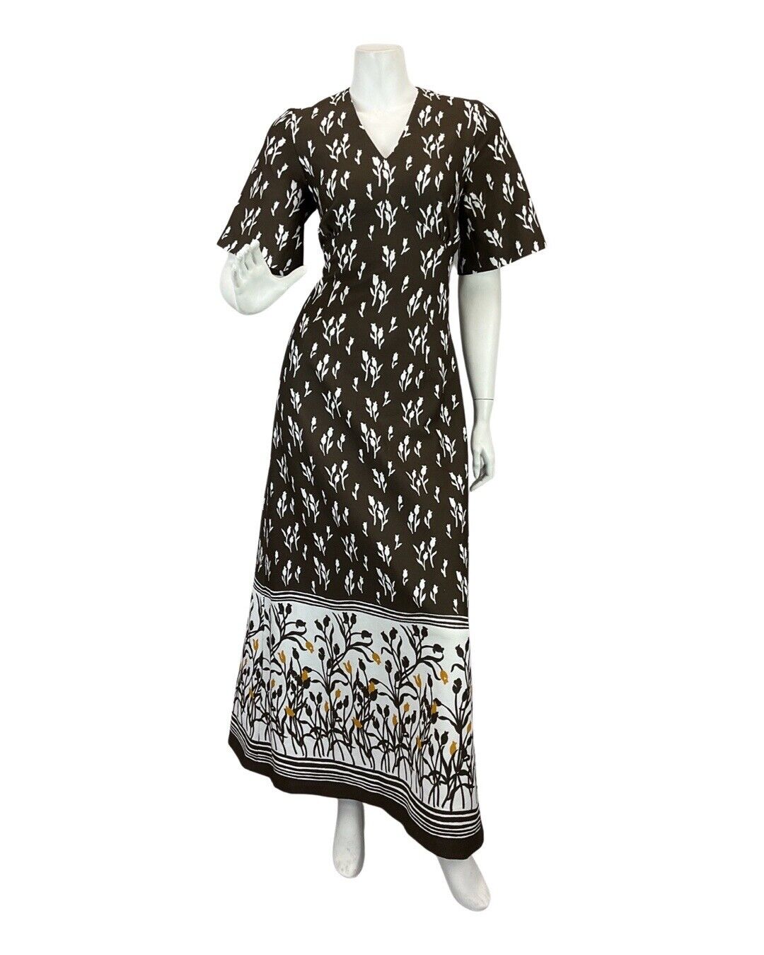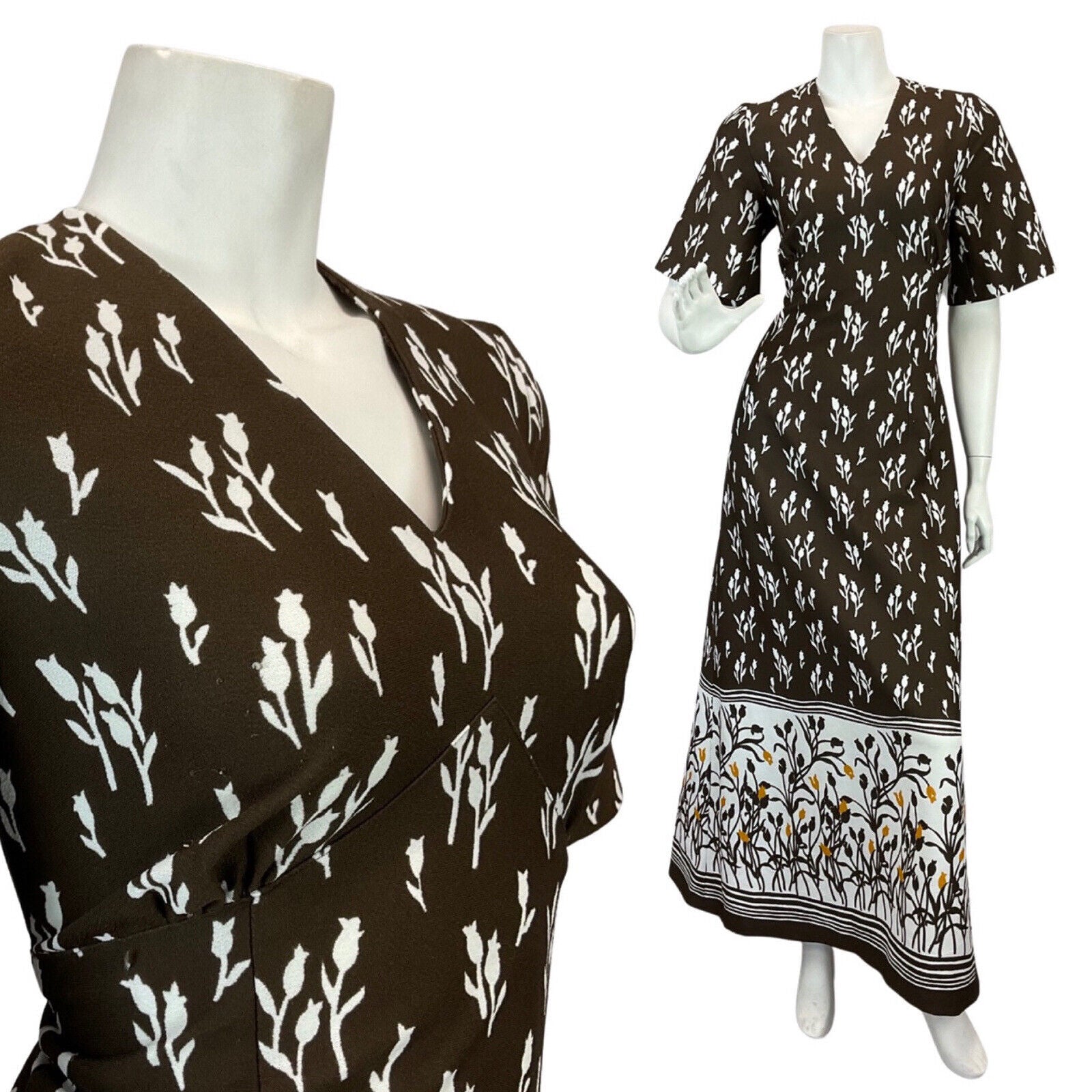 VINTAGE 60s 70s BROWN WHITE TULIP FLORAL BOHO MOD MAXI DRESS 10 12