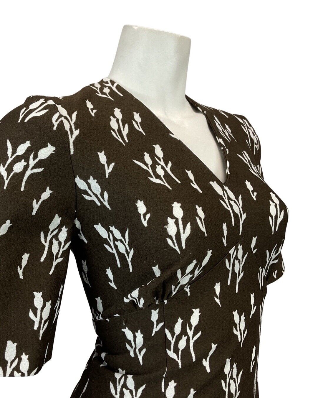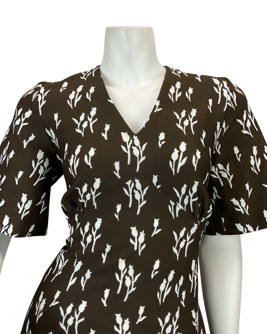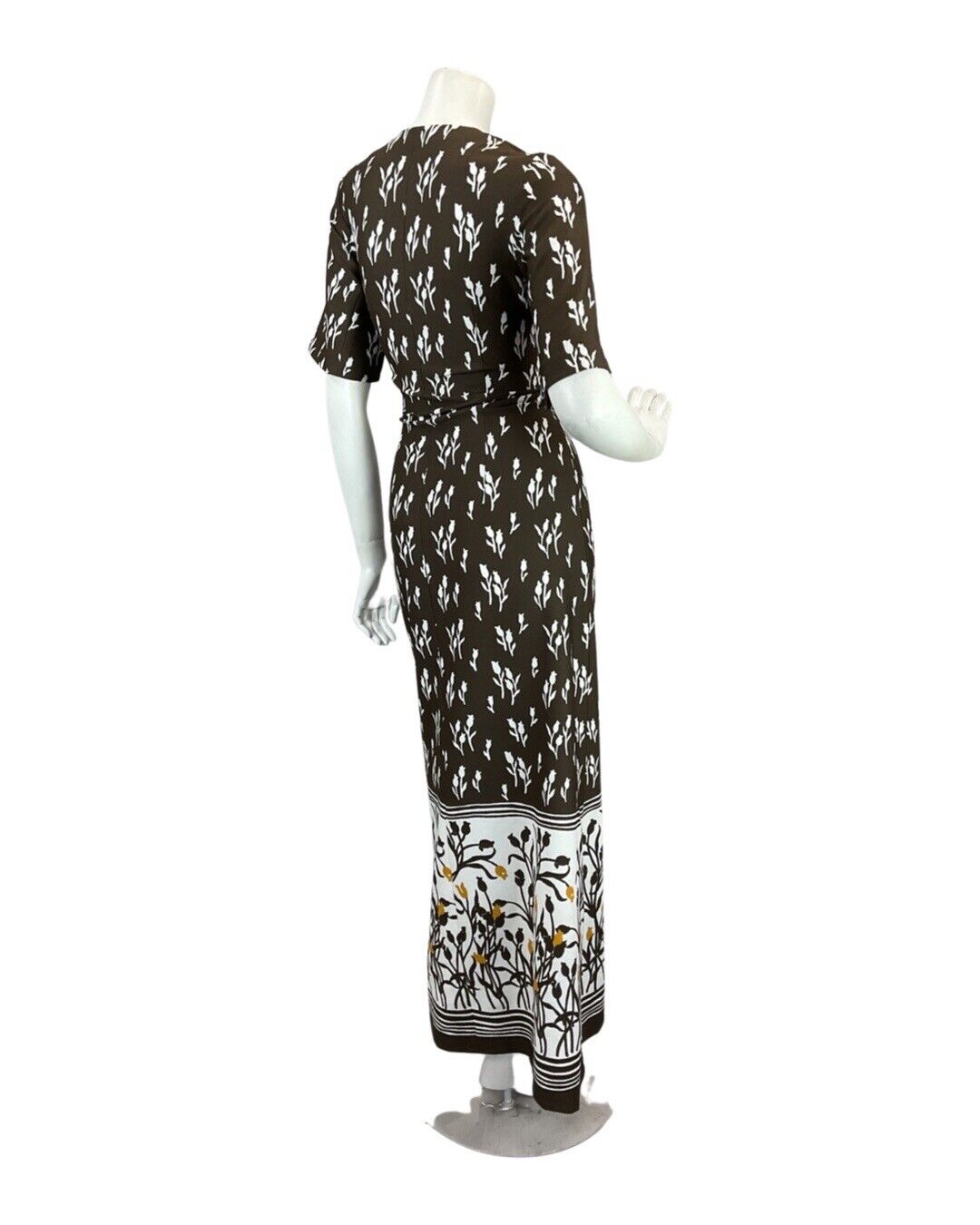 VINTAGE 60s 70s BROWN WHITE TULIP FLORAL BOHO MOD MAXI DRESS 10 12