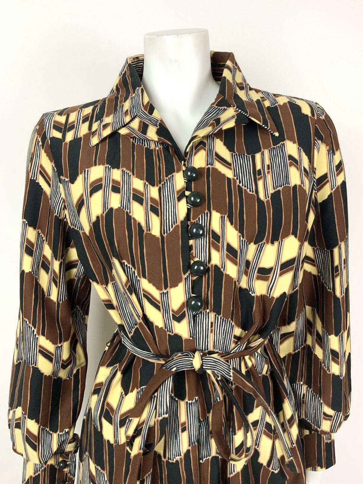 VINTAGE 60s 70s BROWN YELLOW BLACK ZIG-ZAG GEOMETROC BELTED SHIRT DRESS 12 14 16