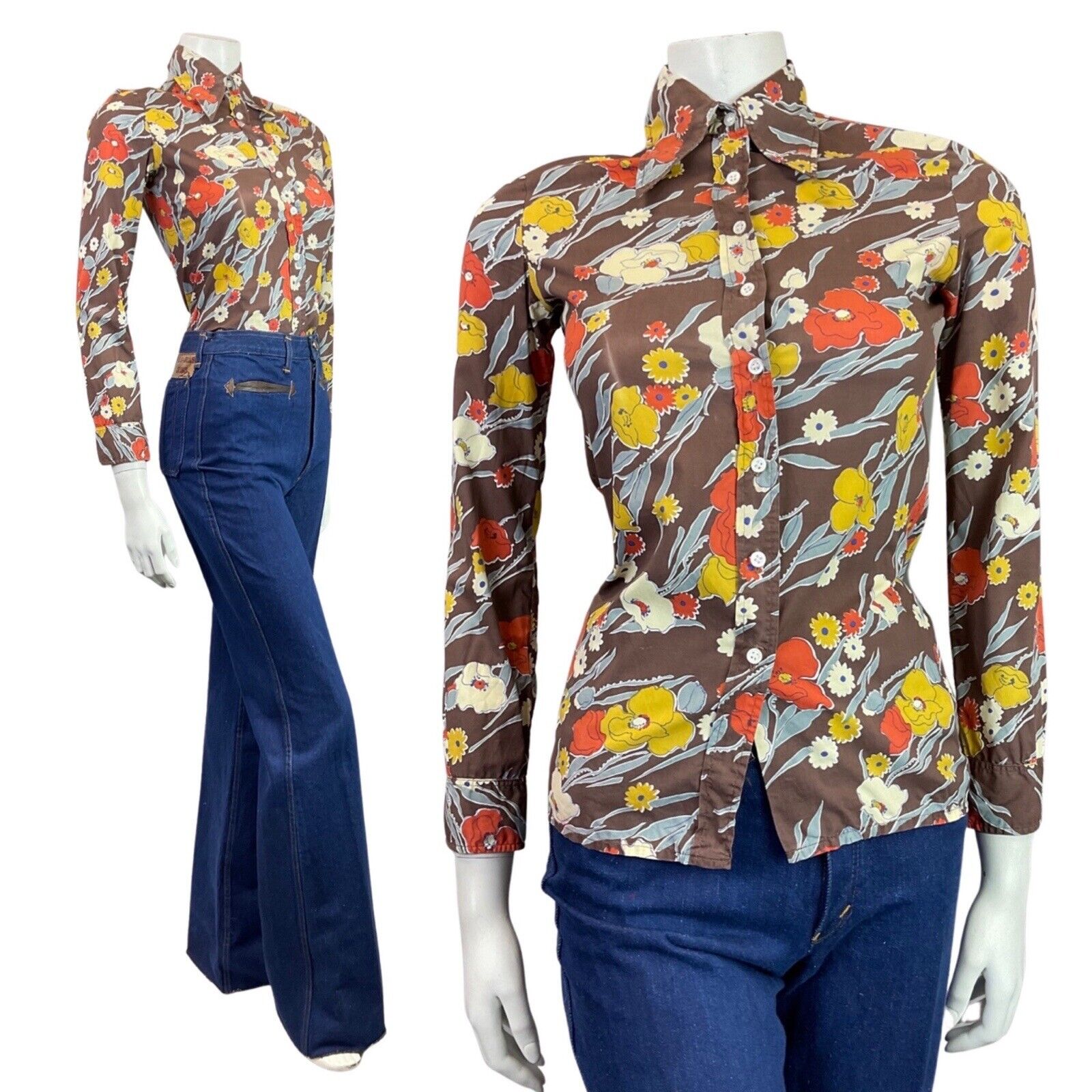 VINTAGE 60s 70s BROWN YELLOW RED FLORAL MOD DAGGER COLLAR SHIRT 10 12