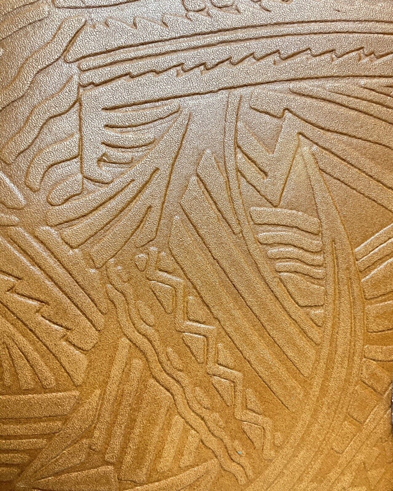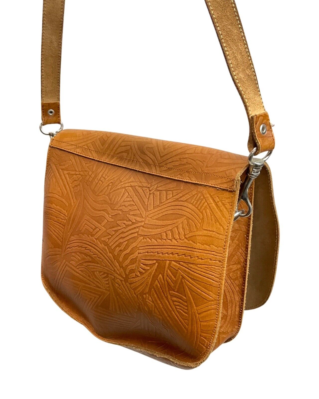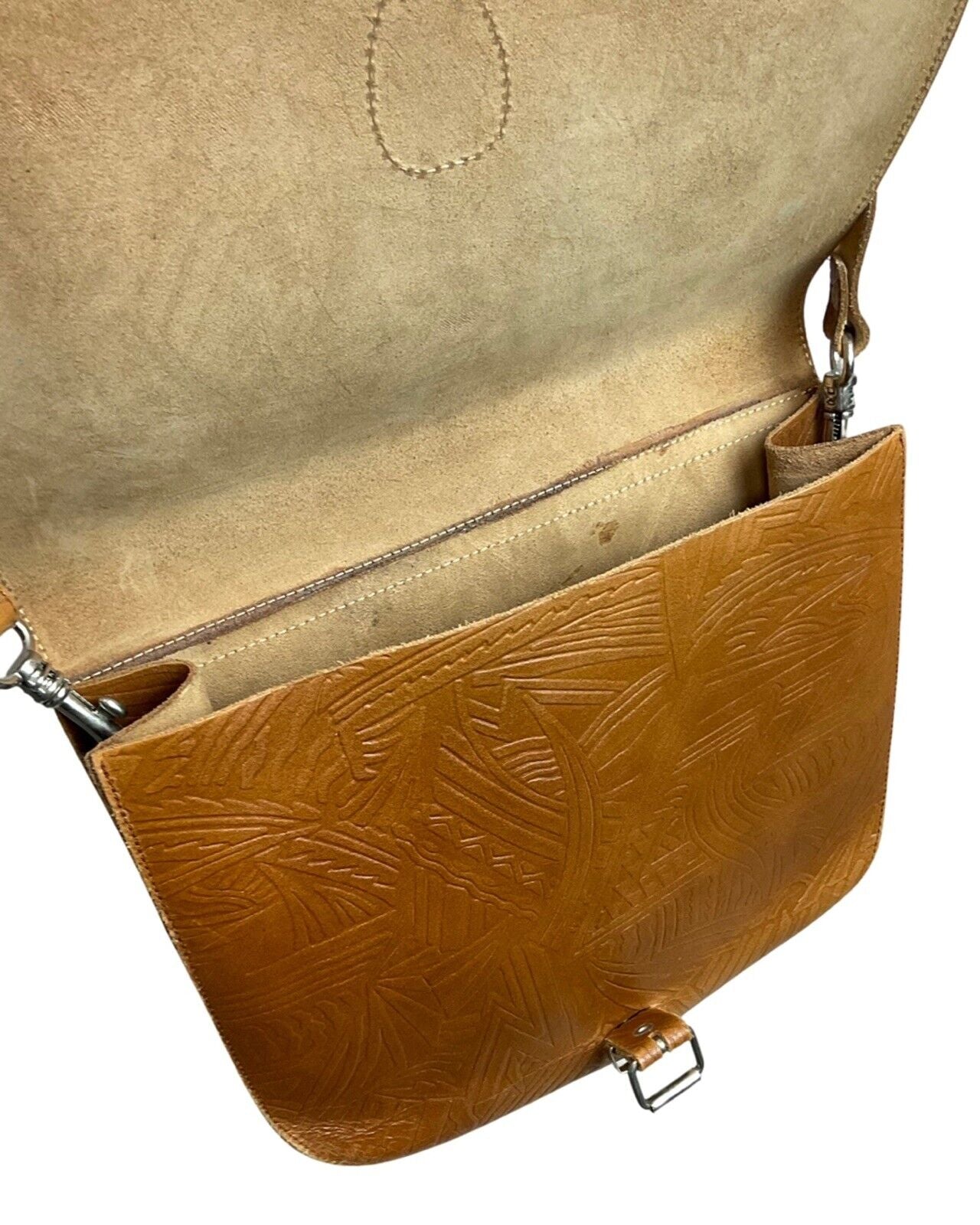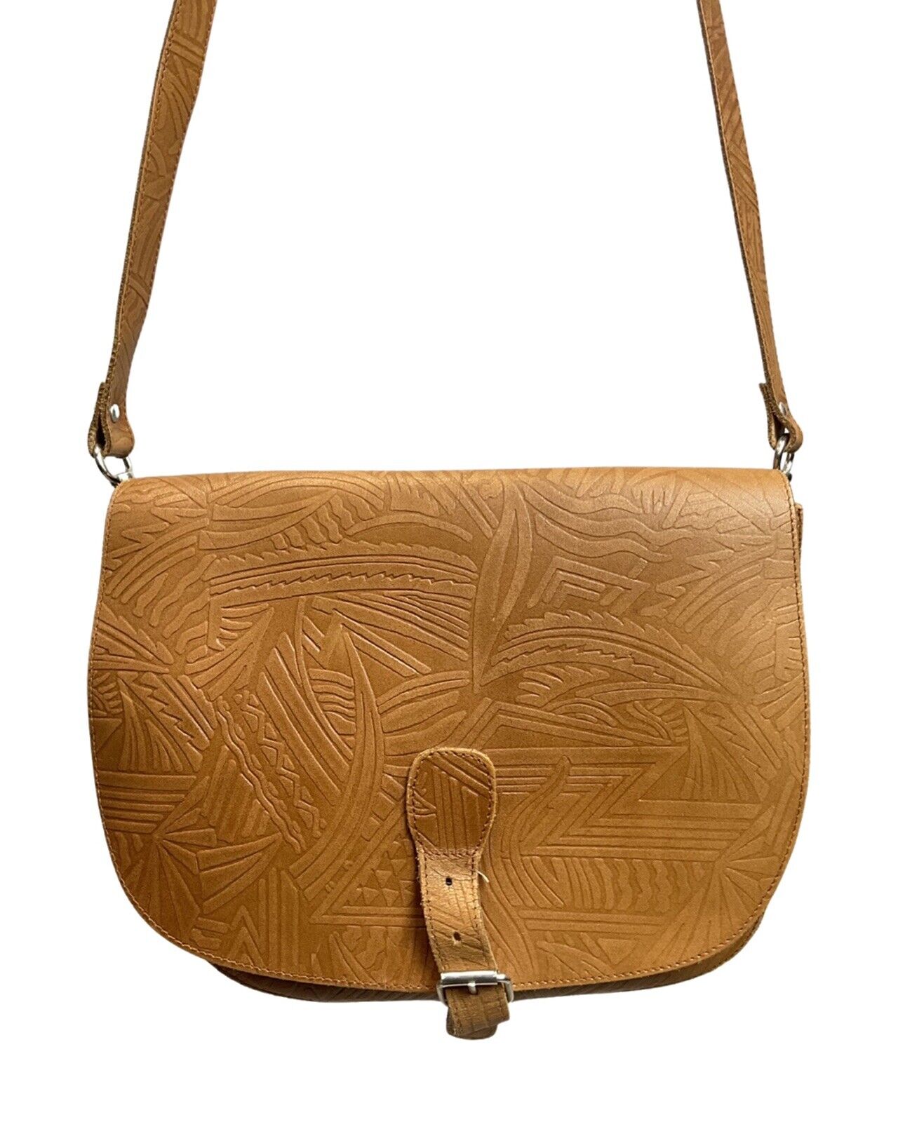 VINTAGE 60s 70s CAMEL BROWN STAMPED LEATHER GEOMETRIC BOHO SHOULDER BAG