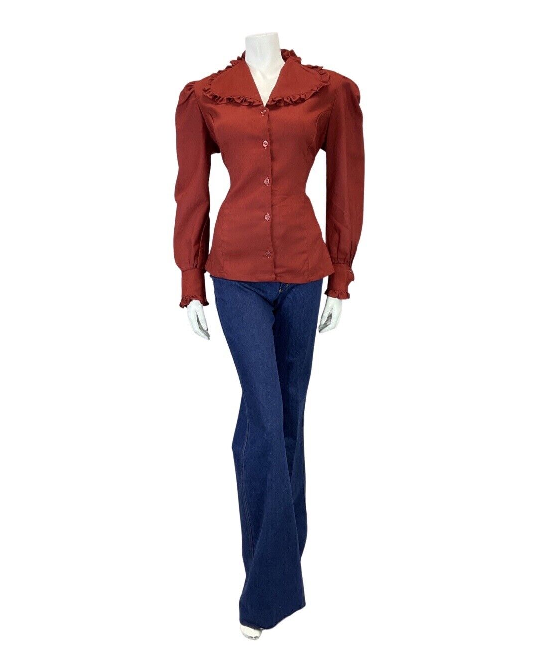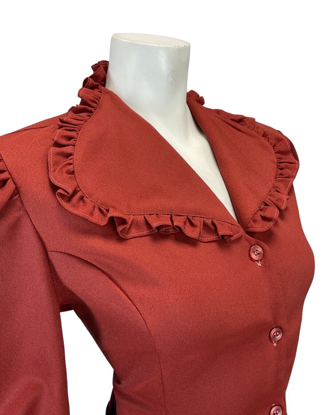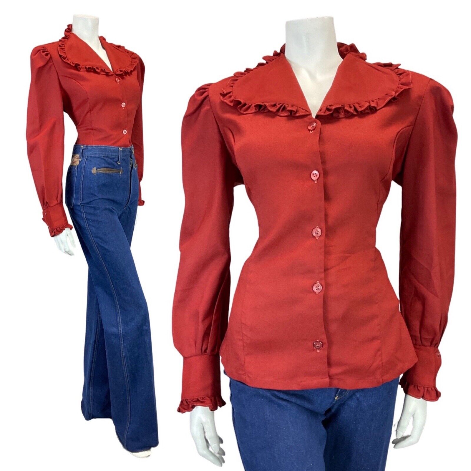 VINTAGE 60s 70s CHERRY RED RUFFLED FITTED BLOUSE SHIRT 14 16