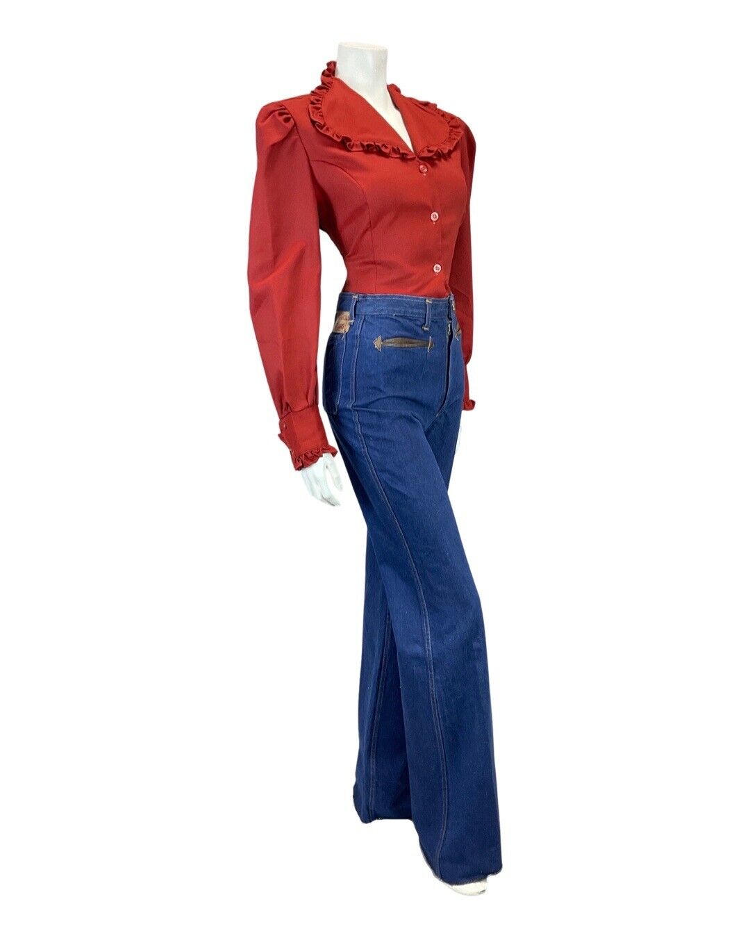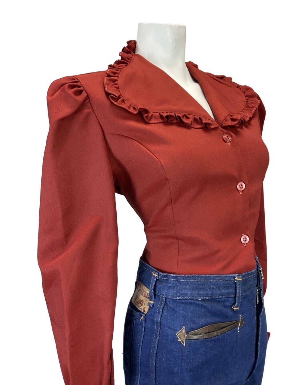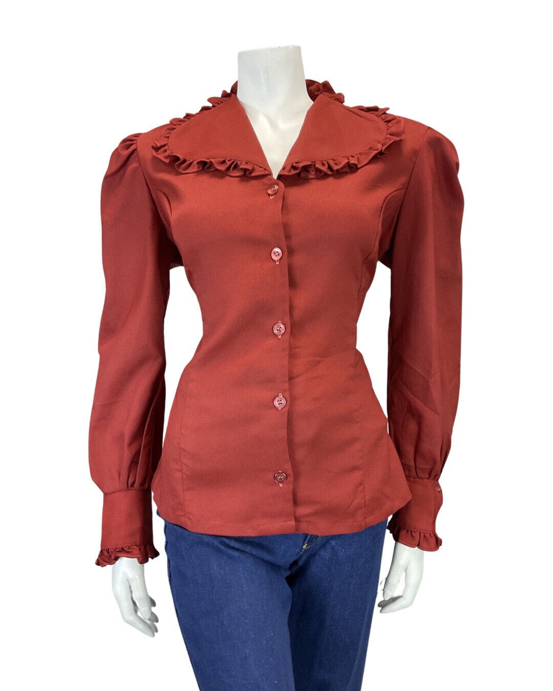 VINTAGE 60s 70s CHERRY RED RUFFLED FITTED BLOUSE SHIRT 14 16