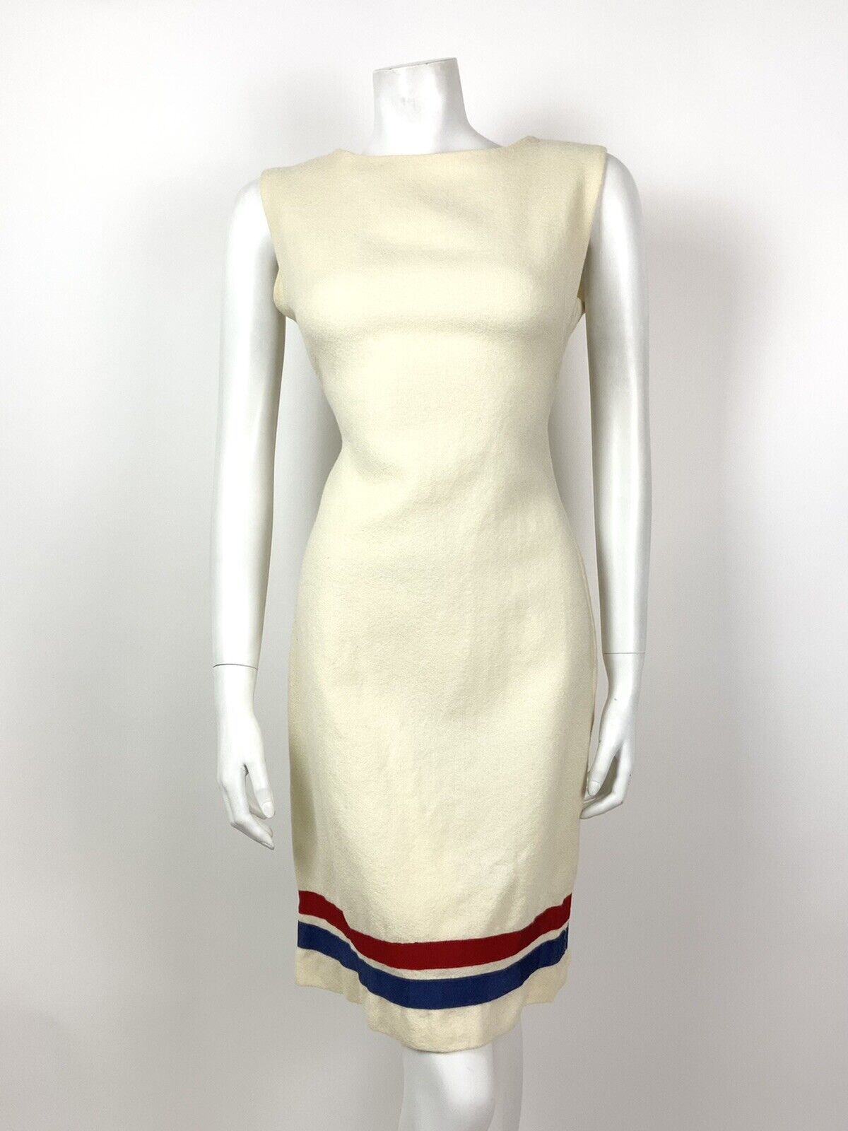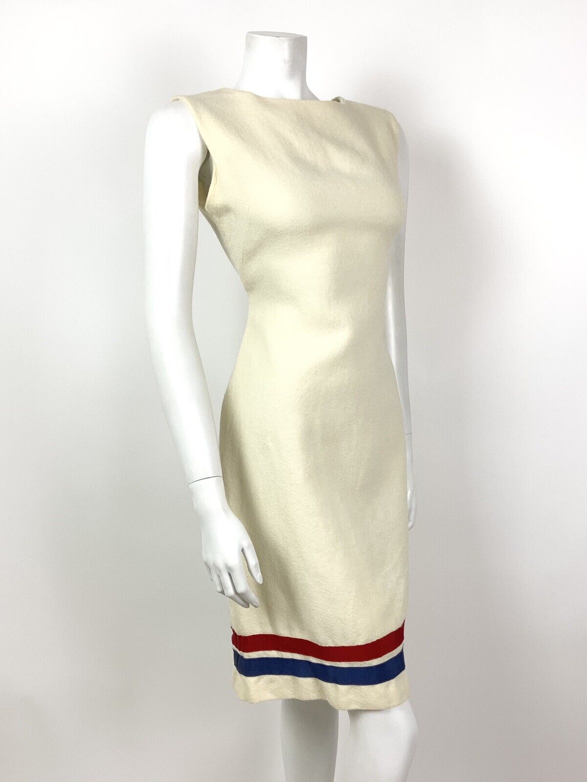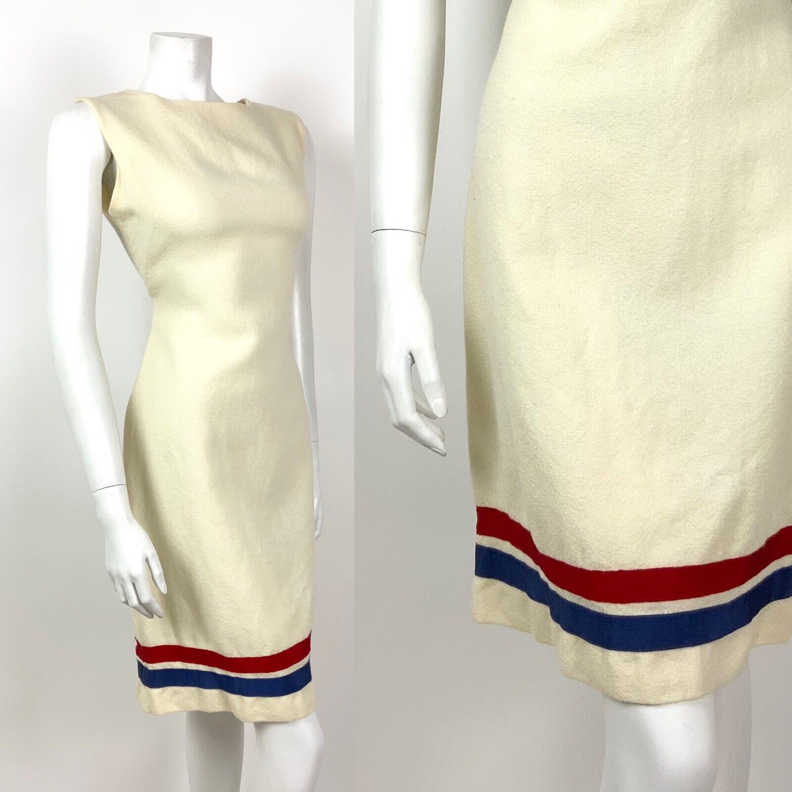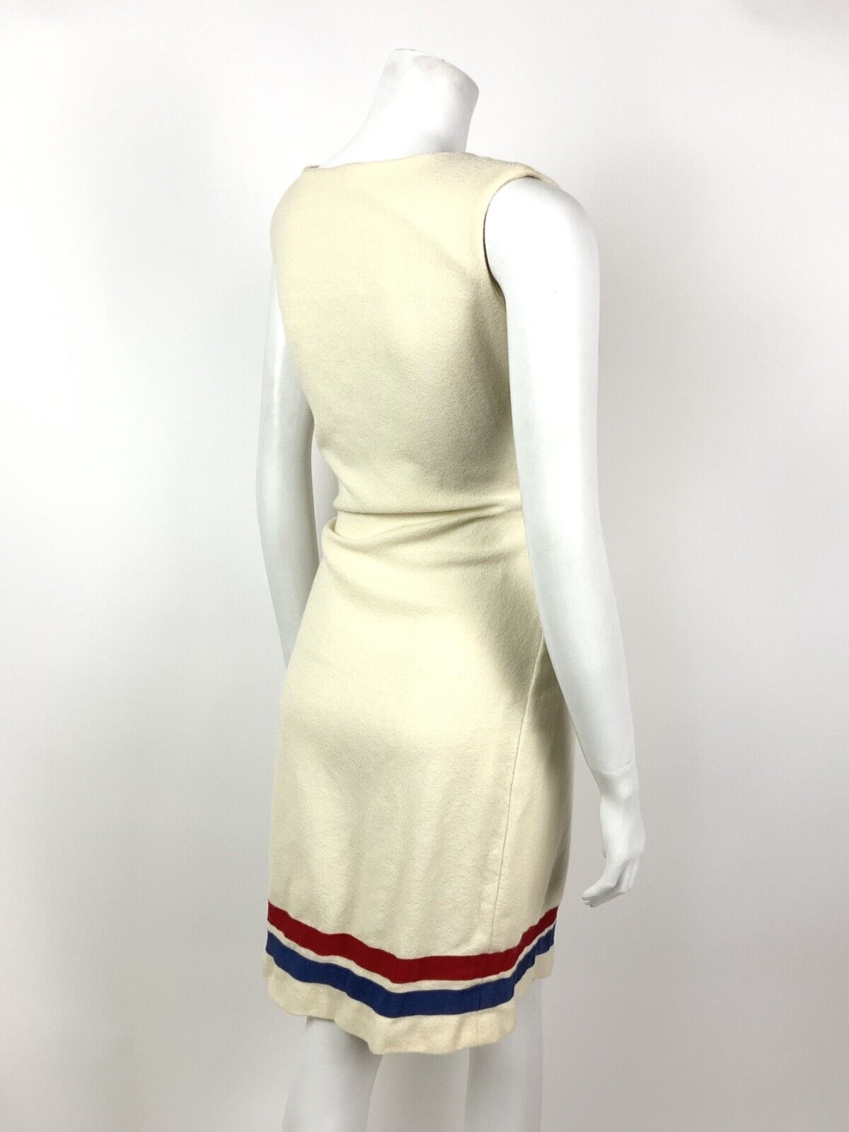 VINTAGE 60s 70s CREAM BLUE RED STRIPE MOD SLEEVELESS NAUTICAL DRESS 10 12