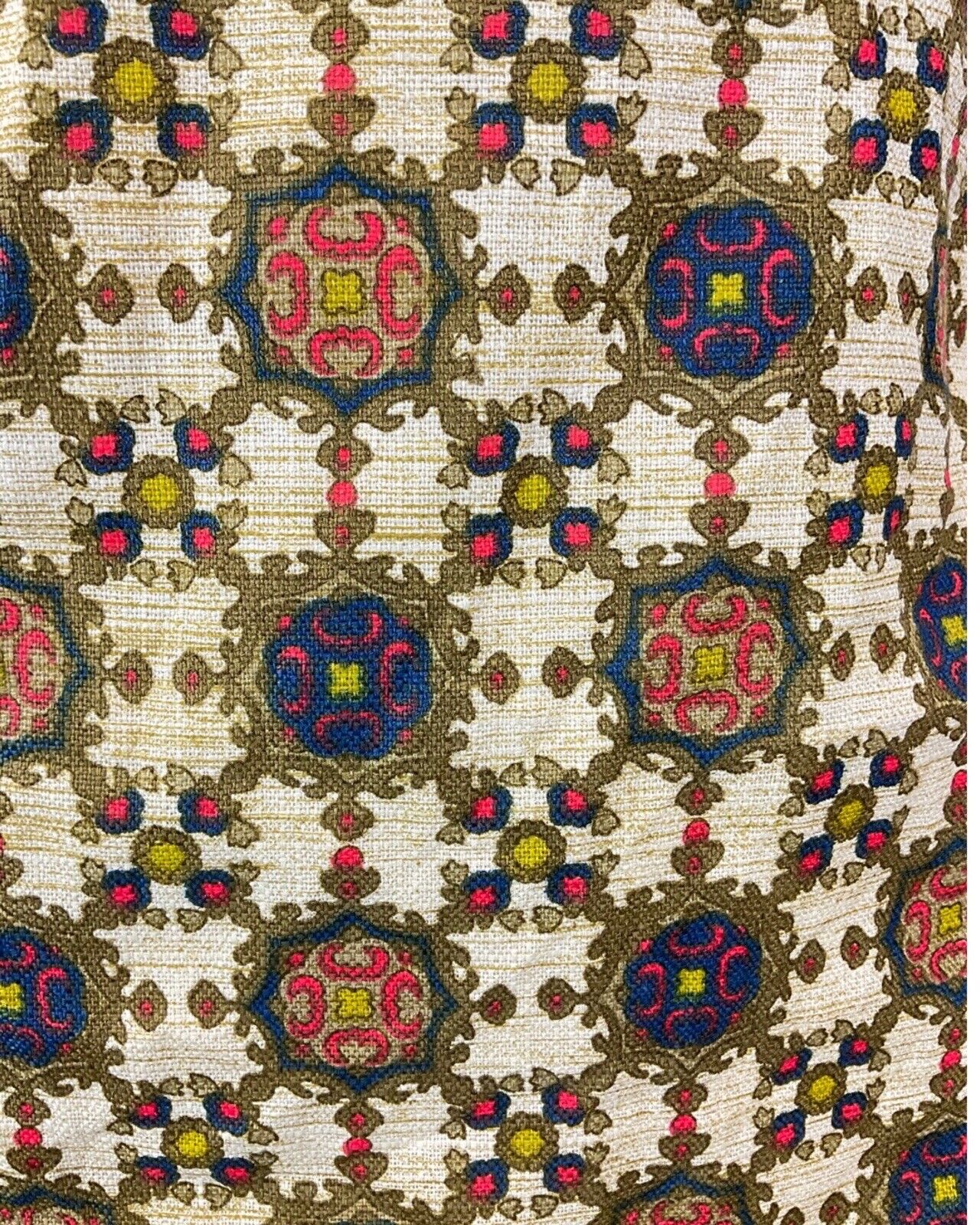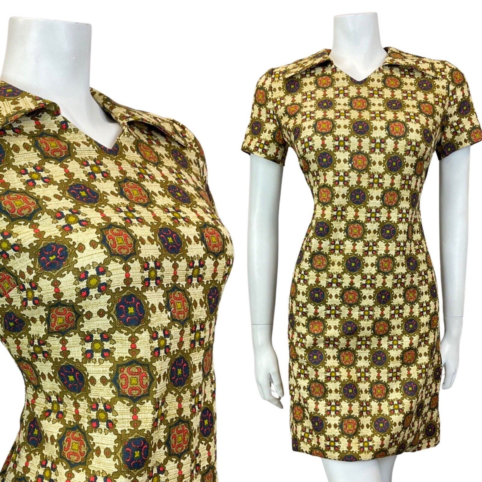 VINTAGE 60s 70s CREAM GOLD BLUE ORNATE CHECKED MOD SHORT SHIRT DRESS 10 12